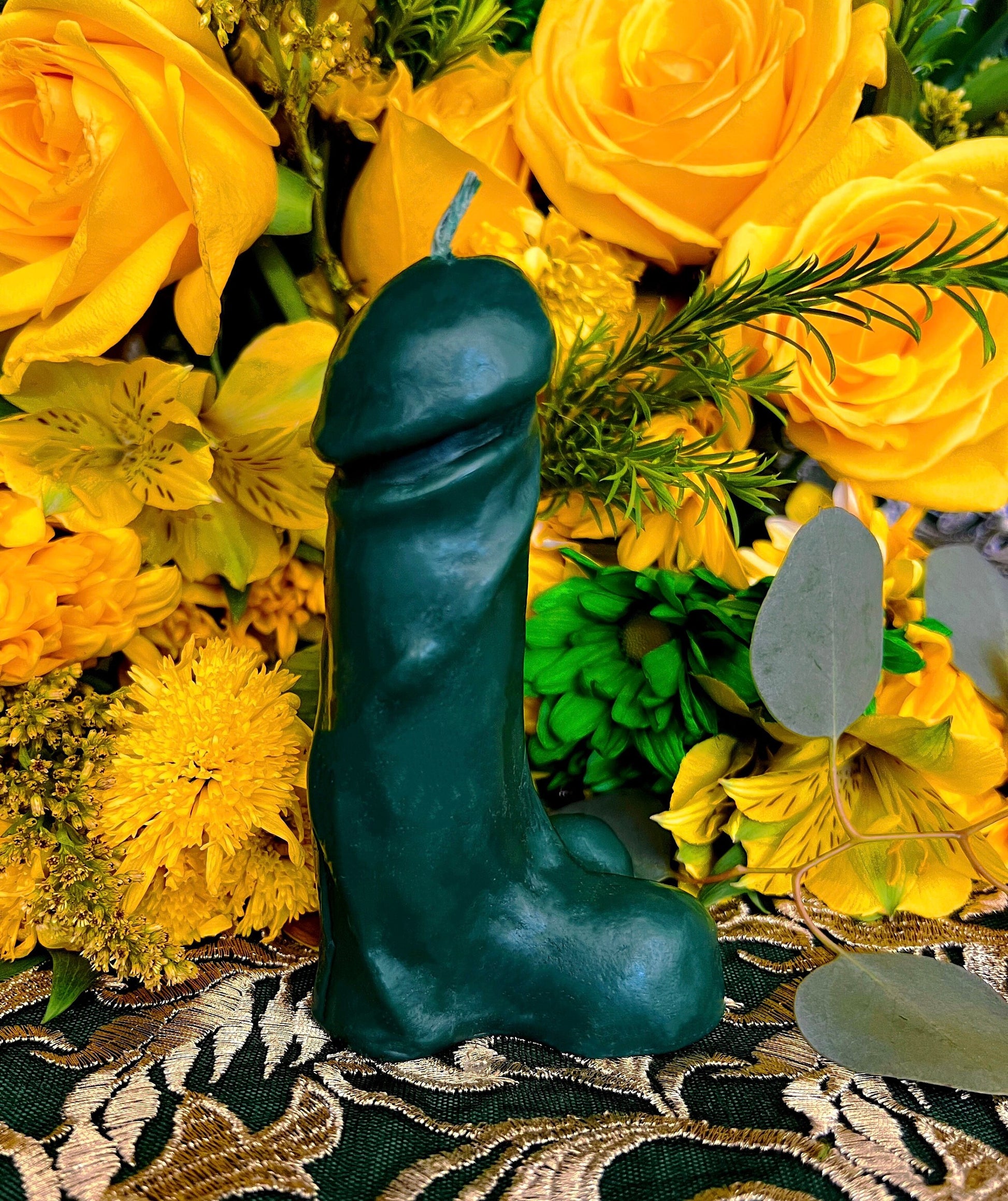We’re offering a Penis Candle with an organic hemp wick that measures approximately 5” high and 2” wide. It is made of soy and paraffin wax.