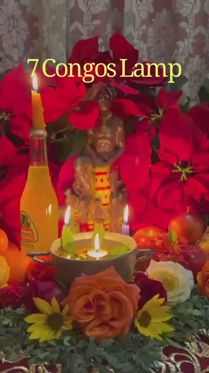 Our 7 Congos Protection and Prosperity Lamp is crafted to support protection, financial growth, business success, abundance, luck, and spiritual guidance. Each lamp is prepared with sacred herbs, oils, roots, and curios aligned with the 7 Congos, empowering it to address matters within their domain. Traditionally, practitioners work a 7 Congos lamp throughout a career, during business endeavors, or when facing important challenges. This lamp burns hotter than a standard 7-day candle, allowing it to work with greater speed and intensity. We tend this lamp for approximately seven days, offering daily prayers and petitions until the work is complete.