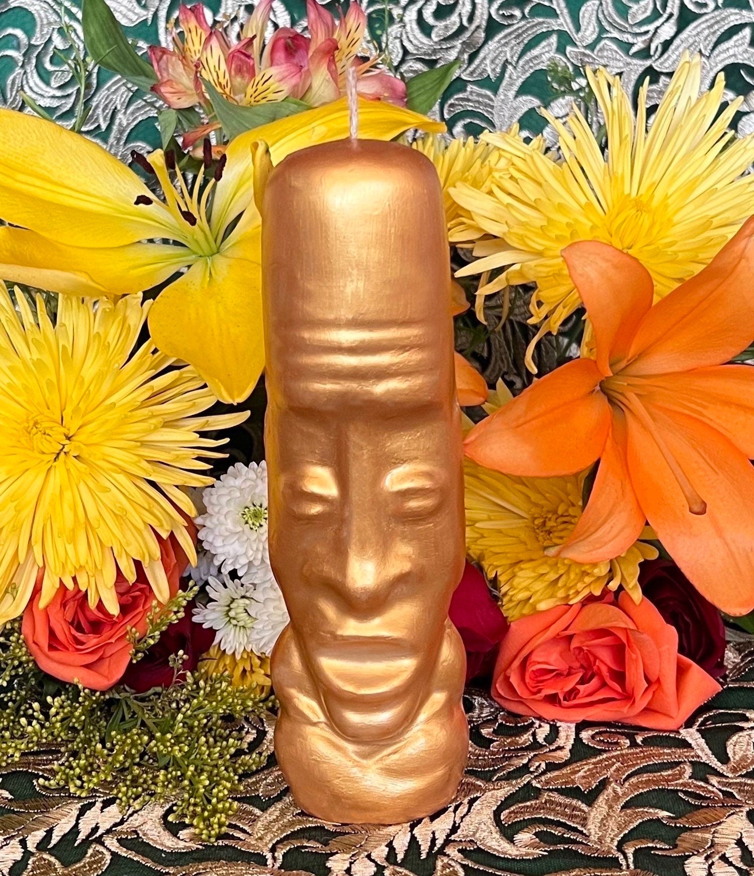 We’re offering an African Totem Candle with an organic hemp wick that measures approximately 8” high, 3” deep, and 3” wide. It is made of paraffin wax.