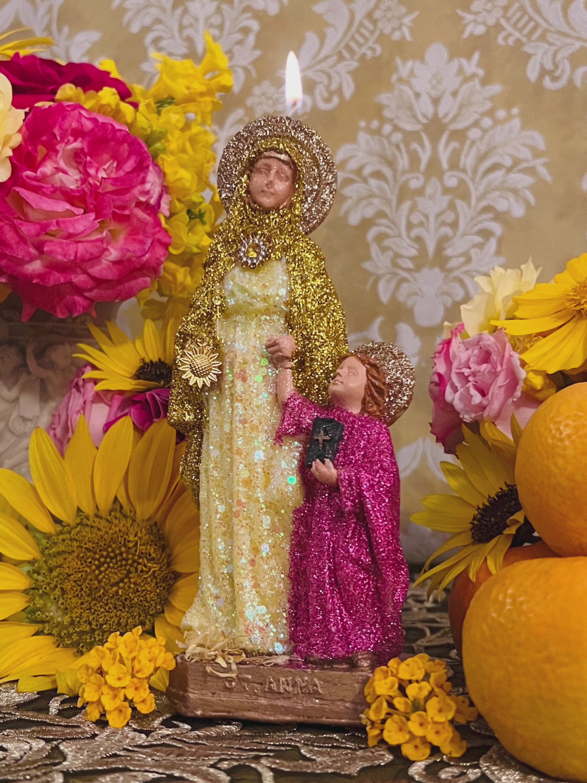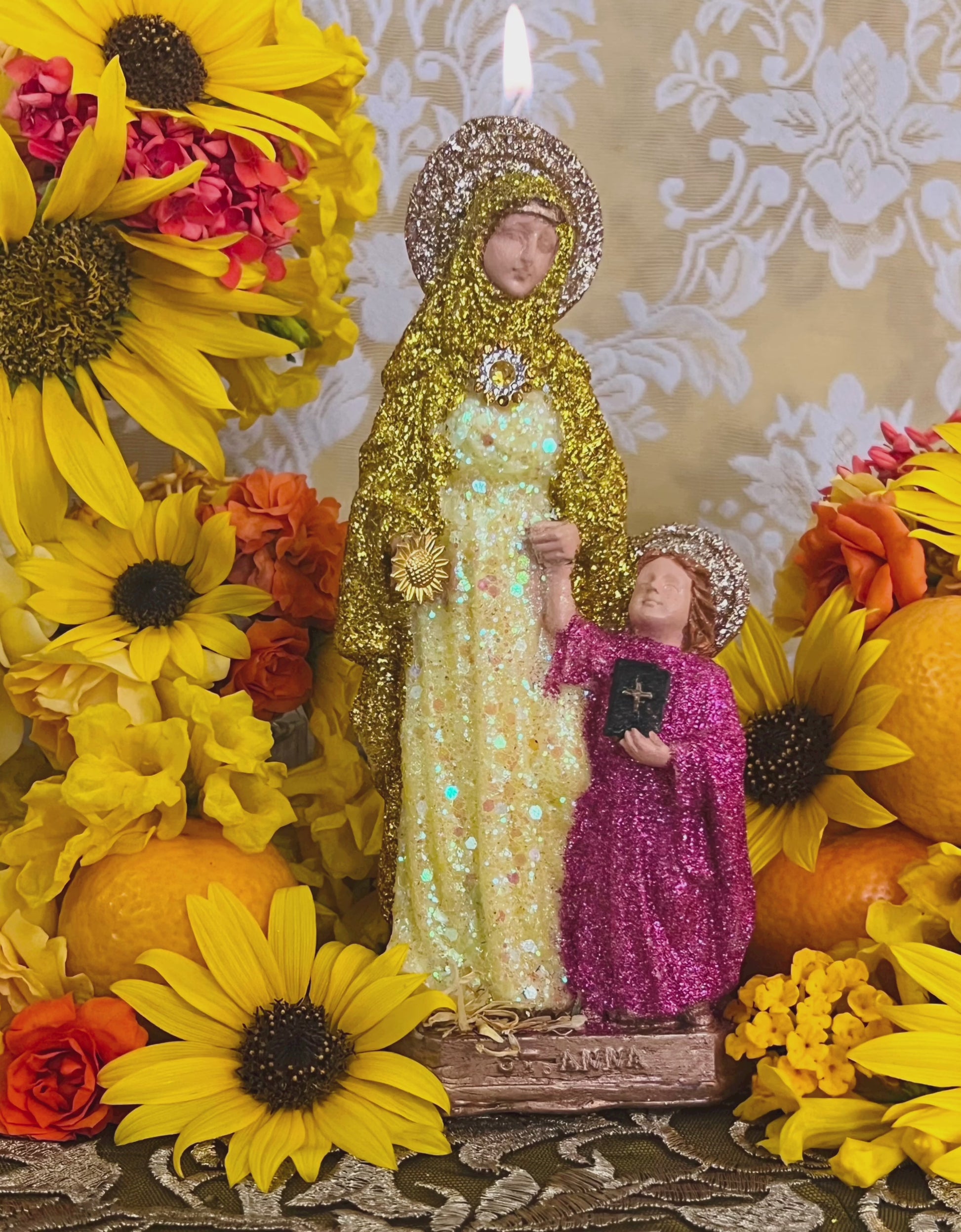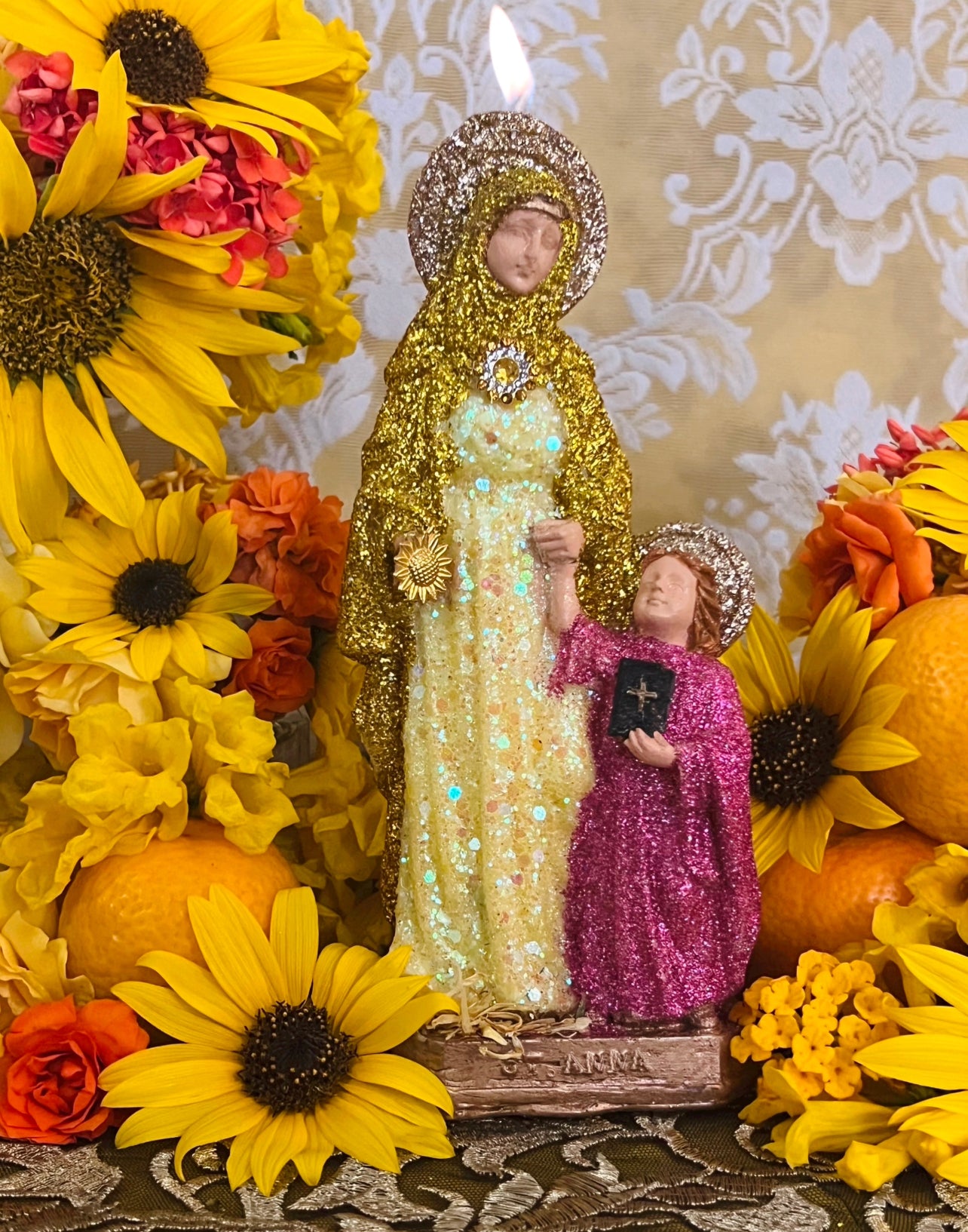 Anaisa Pye is one of the most beloved lwa of the 21 Divisions. Many consider her the queen. She is syncretized with Saint Anne, though she’s represented by the young Mary (often learning from the Bible) in Saint Anne’s image. They have the same feast day of July 26th. Anaisa is the spirit of joy, money, bliss, sensuality, freedom, luck, passion, abundance, happiness, and sex work. She can help a relationship become committed, break a binding, alleviate depression, aid in a job search, and bring sales. She can be very generous and helpful in every area. Anaisa is friendly, blunt, forward, and flirtatious and has relationships with most male lwa. Many say that she is married to Belie Belcan. Their altars are often next to each other, and they can be served together. Her service may include yellow candles, Corona or Presidente light beer with 5 drops of Florida Water, Newport cigarettes, Country Club Merengue soda from the Dominican Republic, Anais Anais Perfume, sunflowers, pineapple, gold jewelry, an image or statue of Saint Anne, yellow roses, bananas, and sweets.