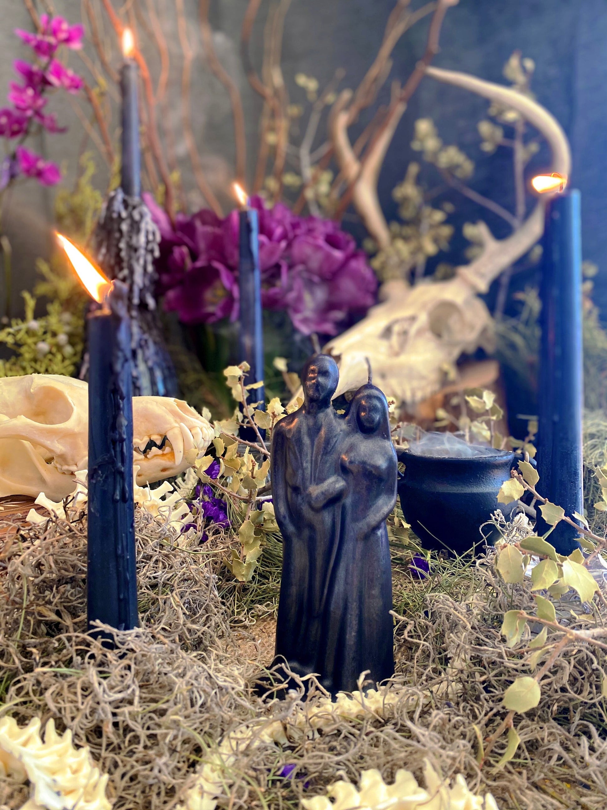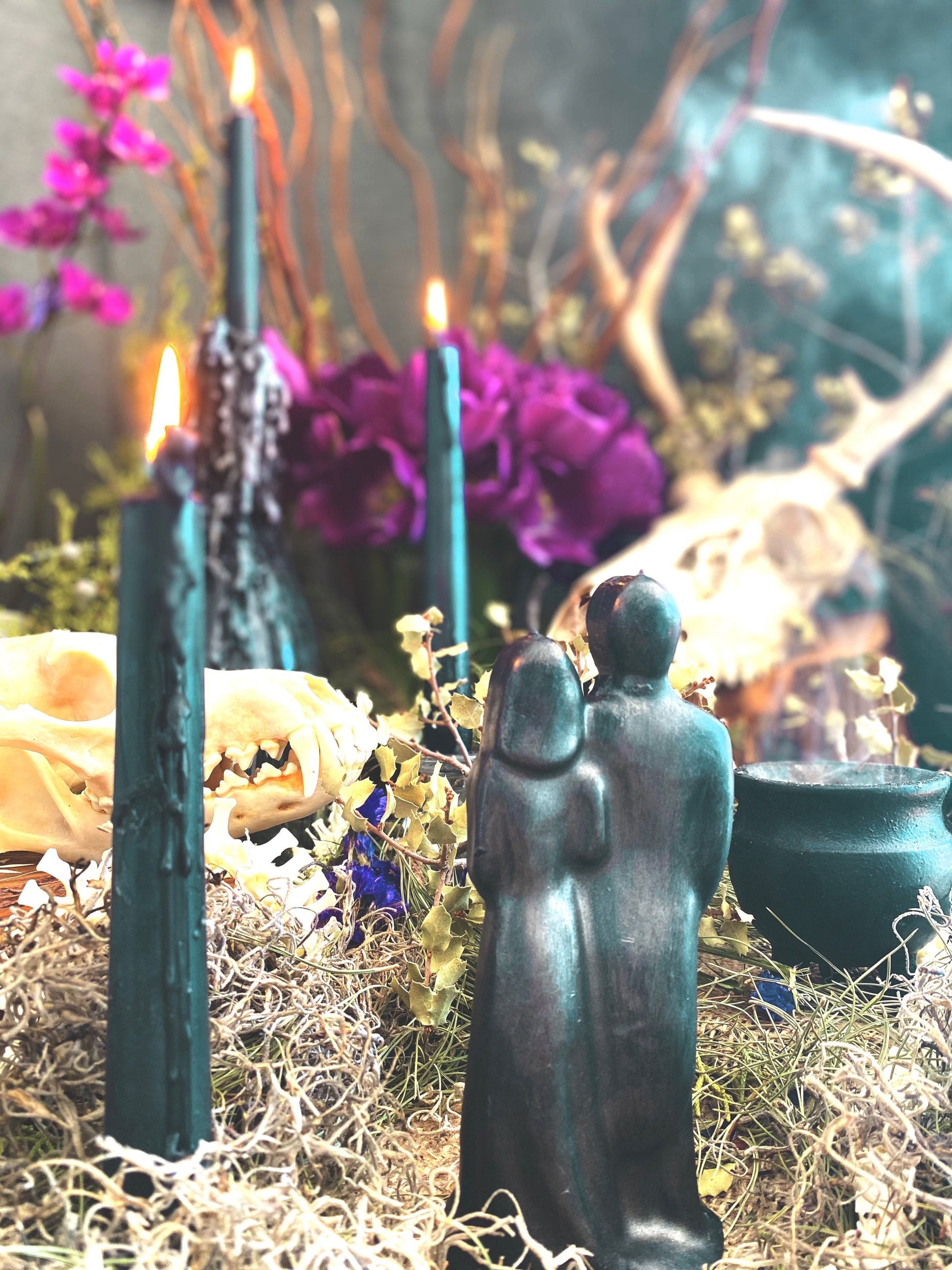 We’re offering a black Bride & Groom Candle for divorce or separation. It comes with an organic hemp wick and measures approximately 7” x 3”. It is made of paraffin and soy wax.