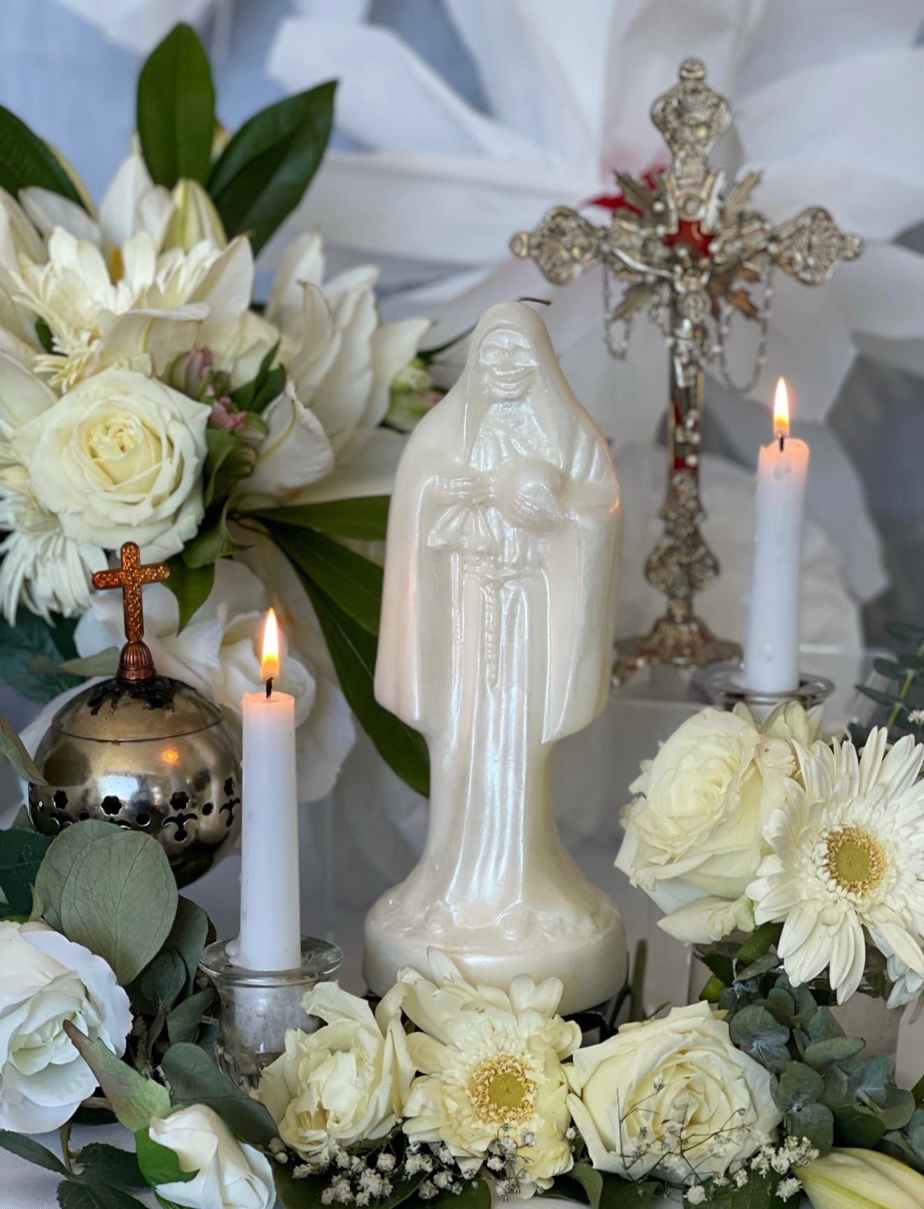 Santa Muerte is a Mexican folk Catholic saint of death who has many names such as La Santisima Muerte, La Nina, and La Huesita. La Santa Muerte is the embodiment of death with the highest power over life of any spirit or saint—second only to God. Many venerate her as she accepts people from all walks of life and does not discriminate against LGBTQ+, sex workers, criminals, and gang members. Many depict her as a grim reaper-like skeleton holding a scythe, scales, or a globe. La Santa Muerte has three traditional robes or personalities: white (La Blanca), red (La Roja), and black (La Negra). Each robe represents a different side of her.La Blanca is the most approachable robe and is the aspect of purity, healing, guidance, clairvoyance, peace, balancing emotions, and cleansing.