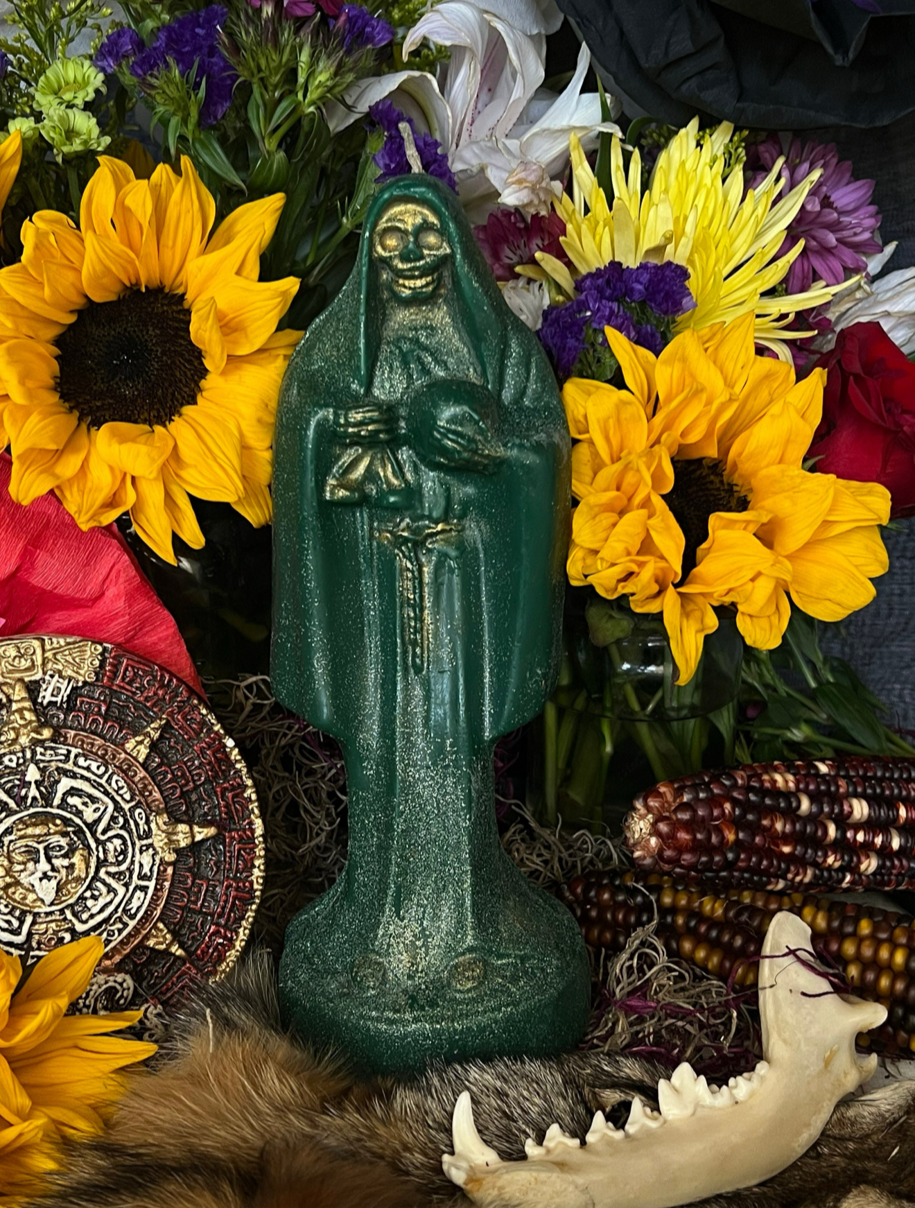 Santa Muerte is a Mexican folk Catholic saint of death who has many names such as La Santisima Muerte, La Nina, and La Huesita. La Santa Muerte is the embodiment of death with the highest power over life of any spirit or saint—second only to God. Many venerate her as she accepts people from all walks of life and does not discriminate against LGBTQ+, sex workers, criminals, and gang members. Many depict her as a grim reaper-like skeleton holding a scythe, scales, or a globe.