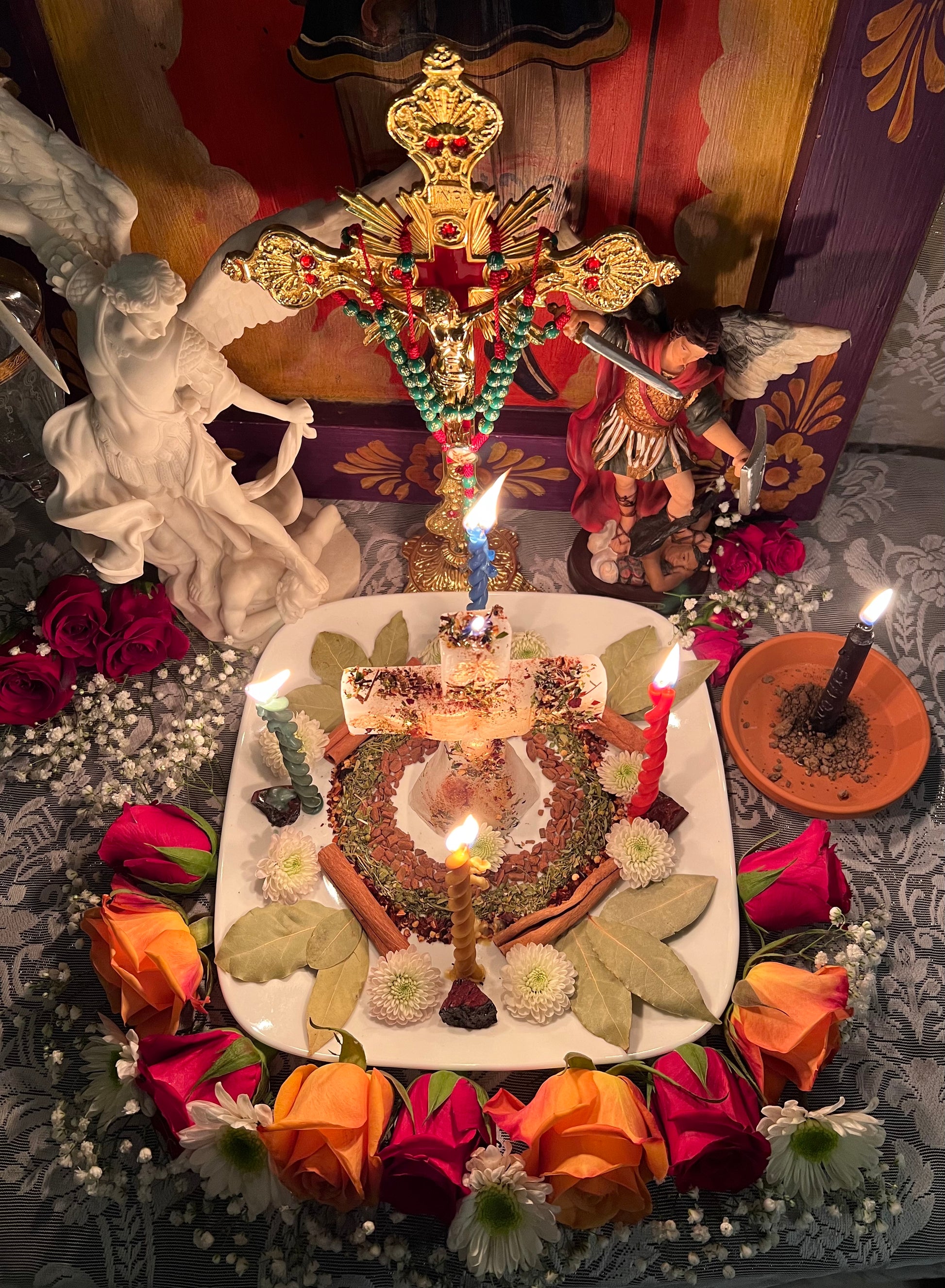 We work this traditional conjure for two to three days and send a mojo bag that contains working remains. We also send a Fiery Wall of Protection oil to apply to the mojo bag. In addition, this listing includes our lighting and setting a novena candle for you at a Saint Michael shrine outside our local Catholic Church.