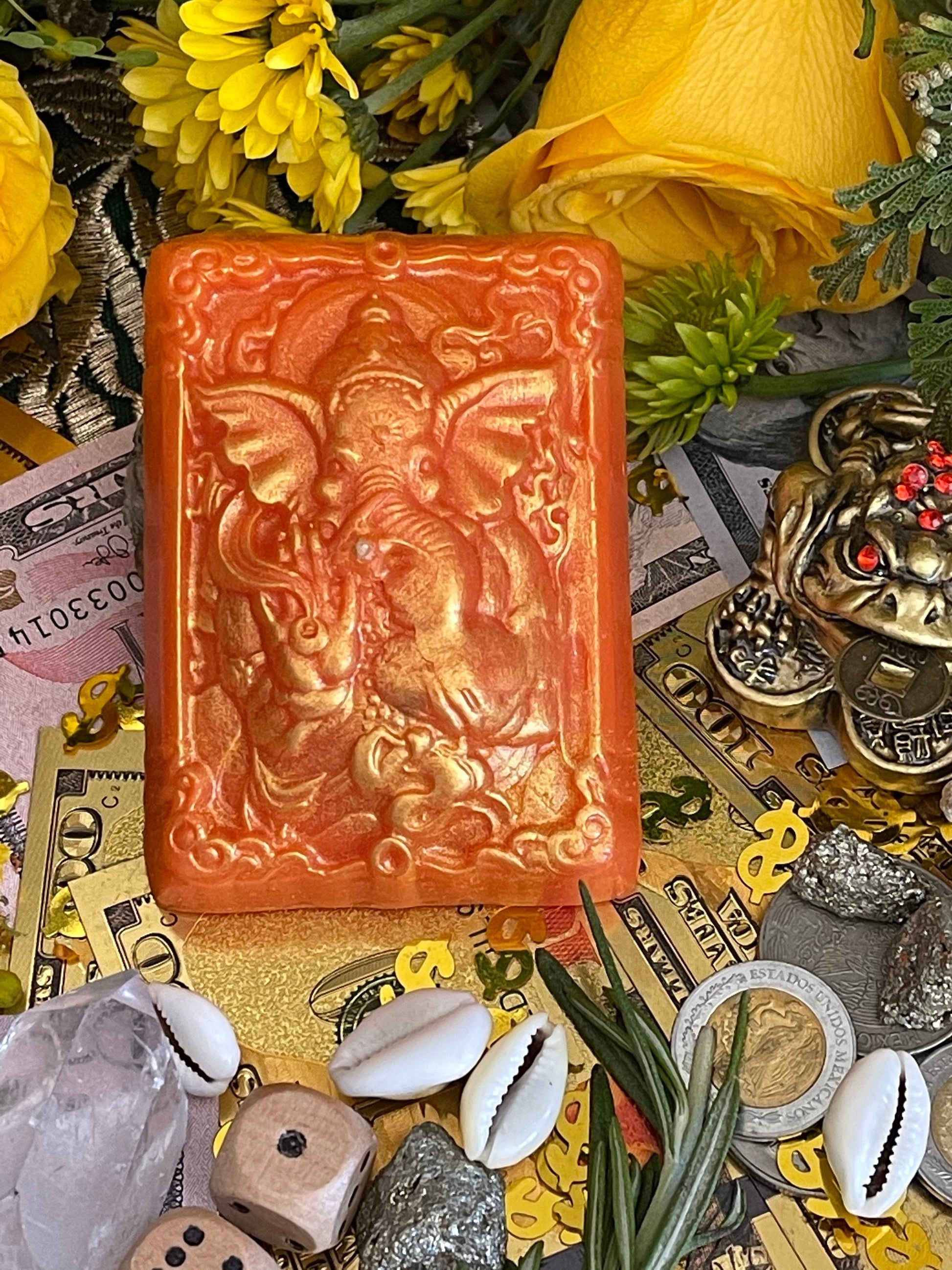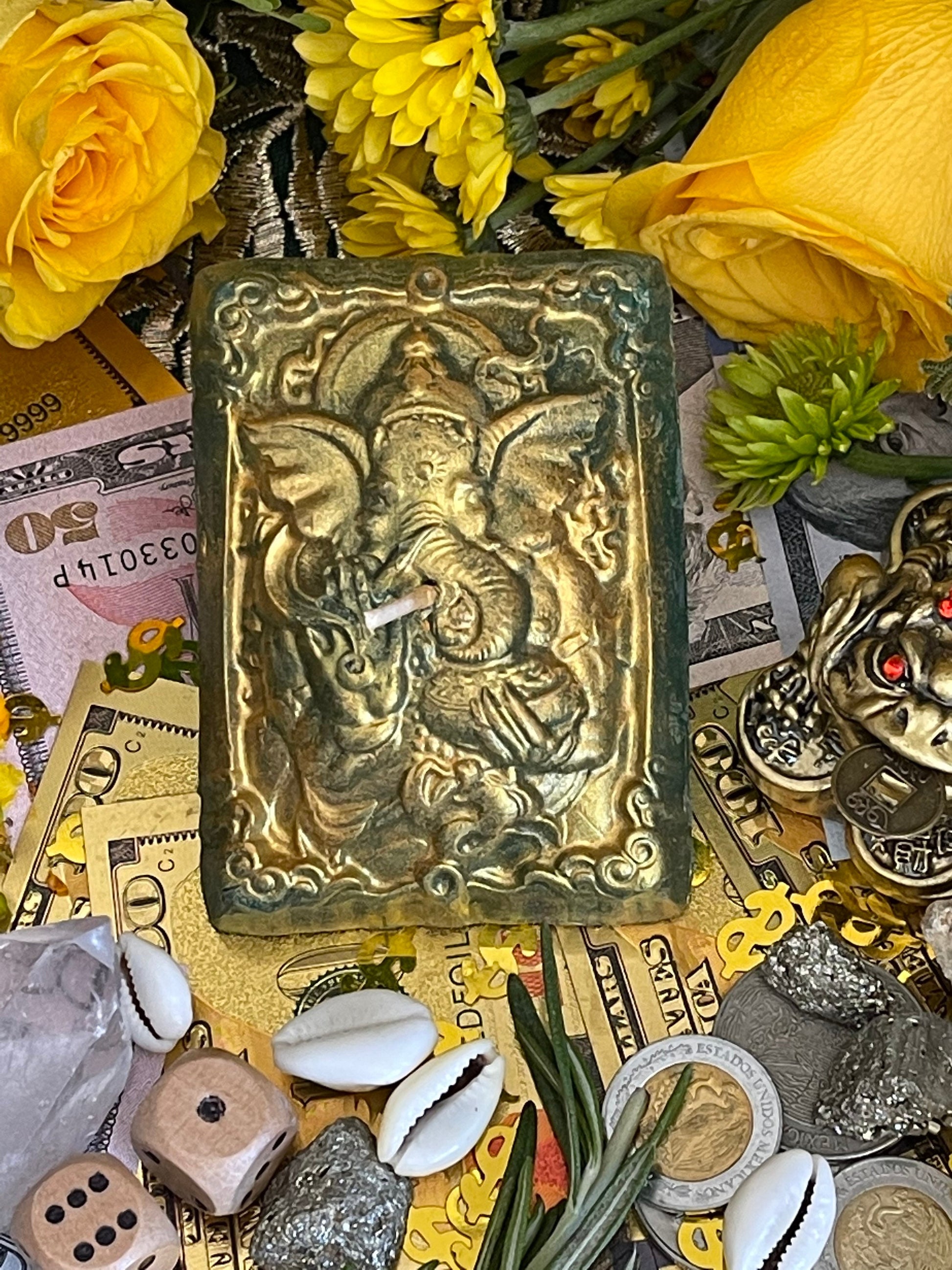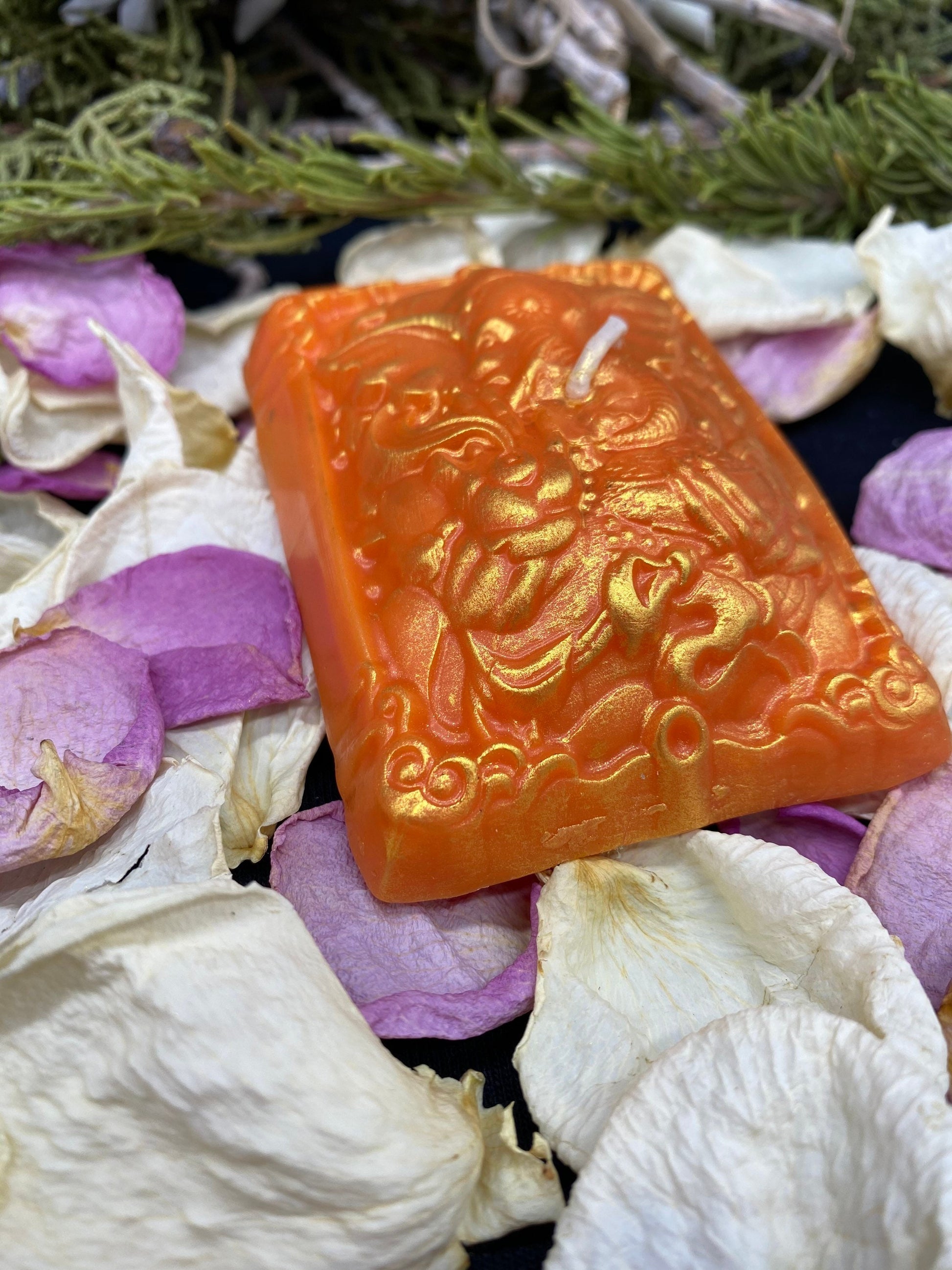 We’re offering a gold-dusted Ganesha Candle with an organic hemp wick that measures approximately 4” high, 3” wide , and 1” deep. It is made of paraffin wax. Ganesha can help remove obstacles and open roads.