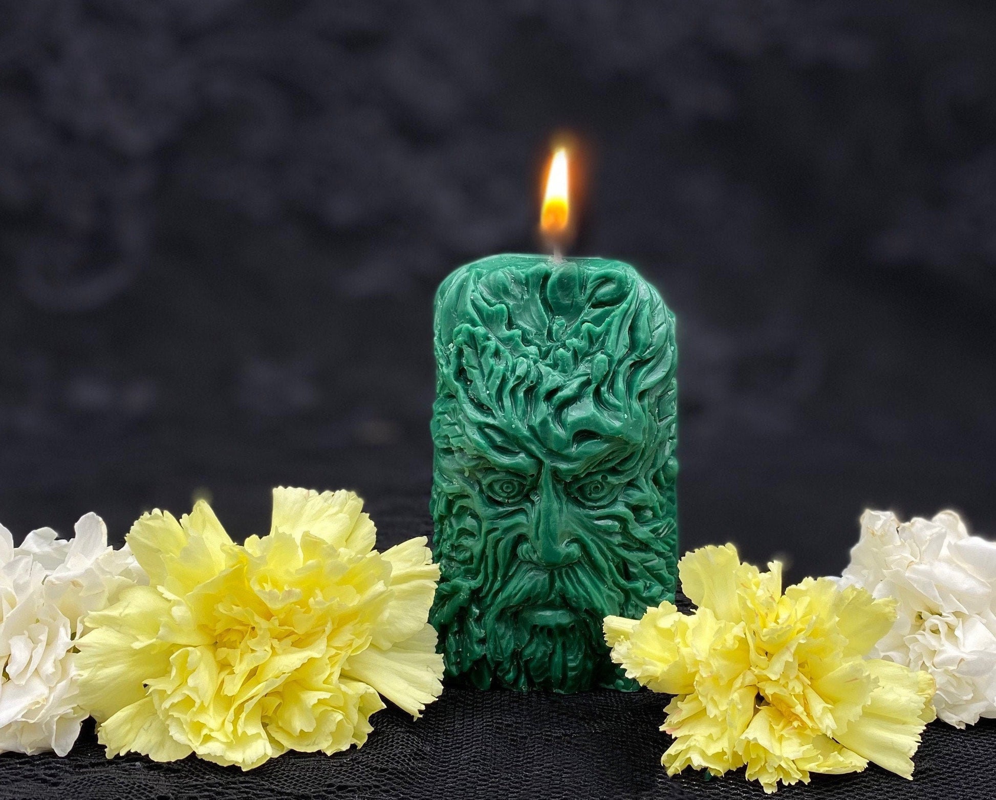 We’re offering a Green Man / Cernunnos Candle with an organic hemp wick that measures approximately 4” high, 2” wide , and 1” deep. It is made of paraffin wax.