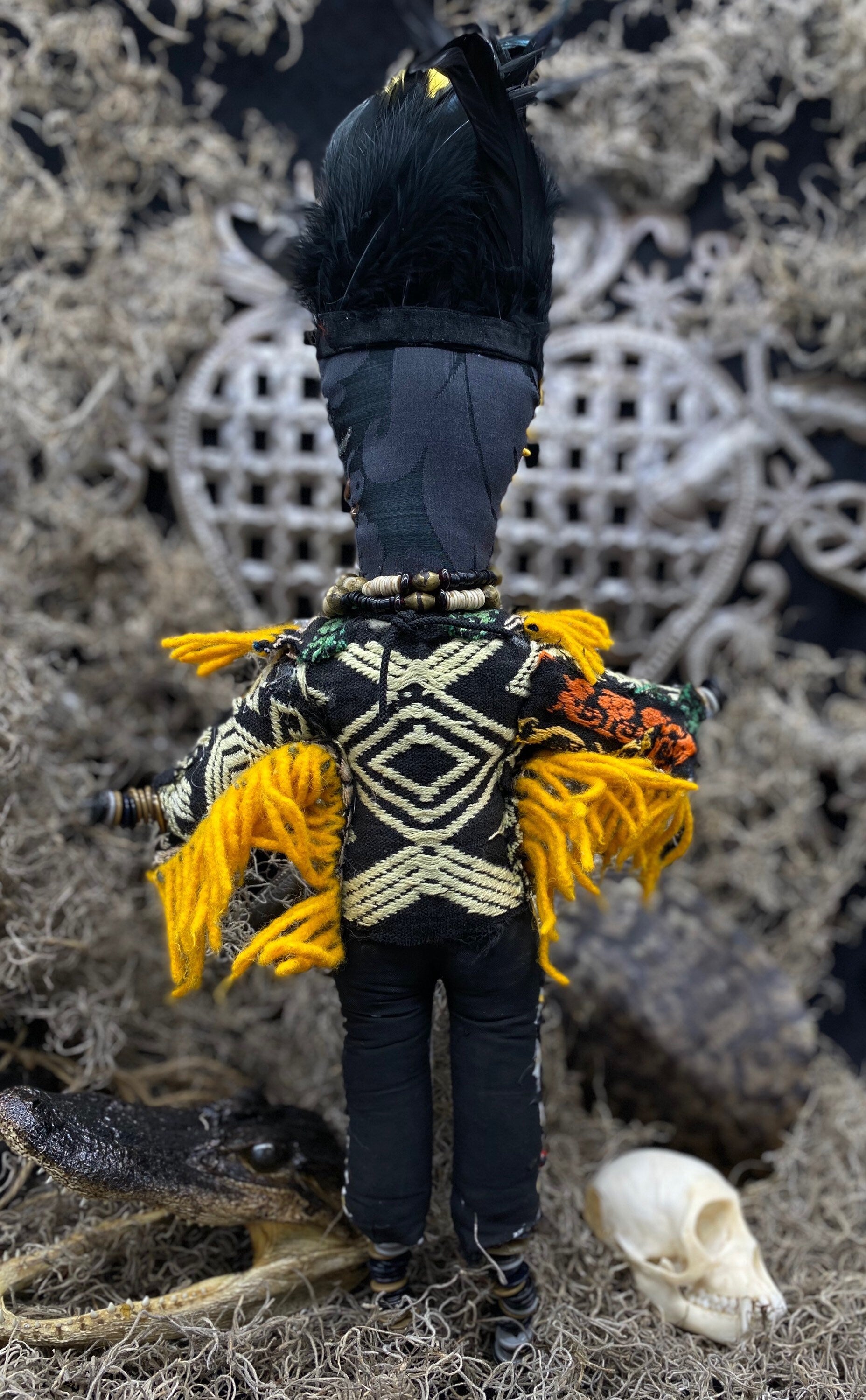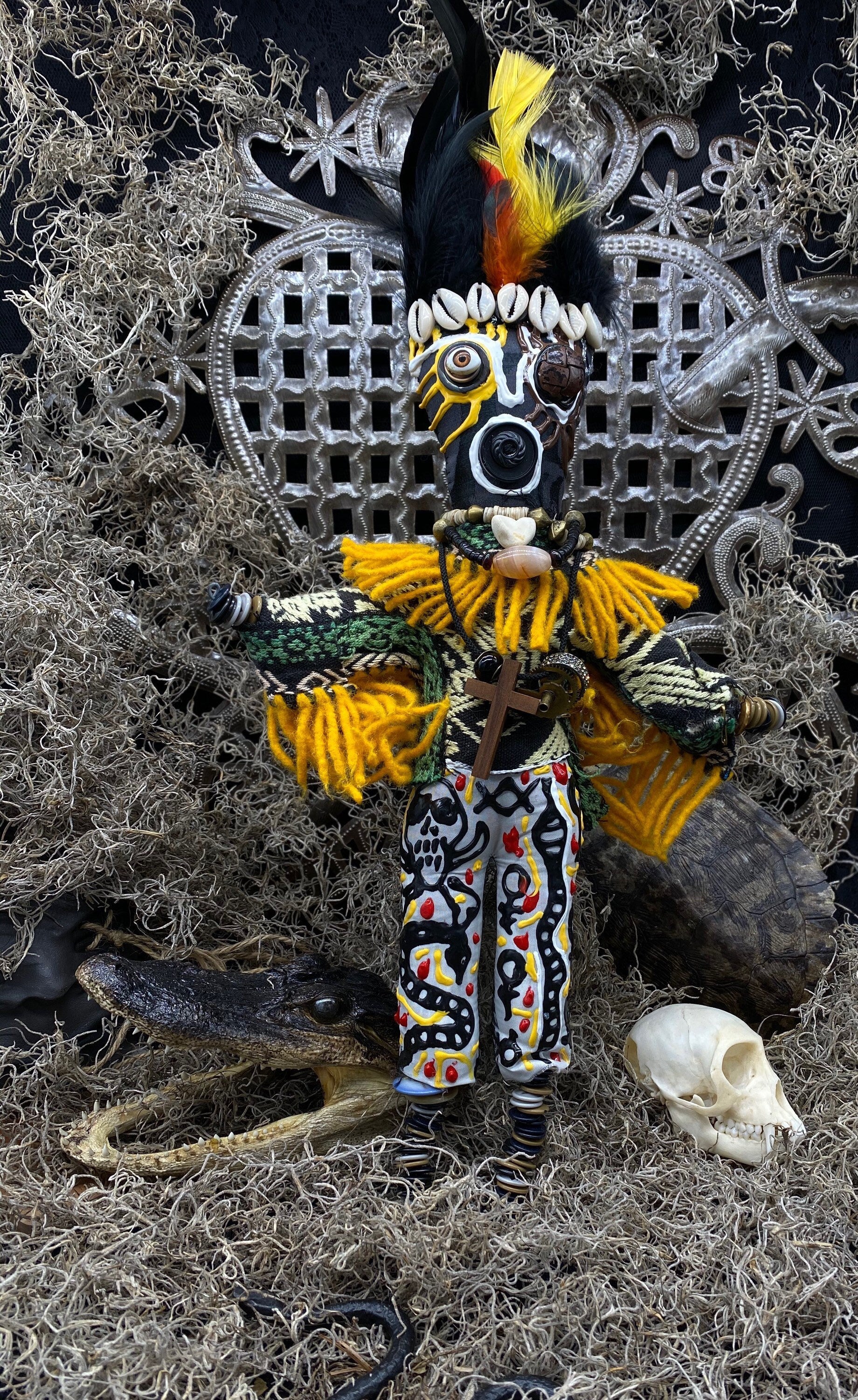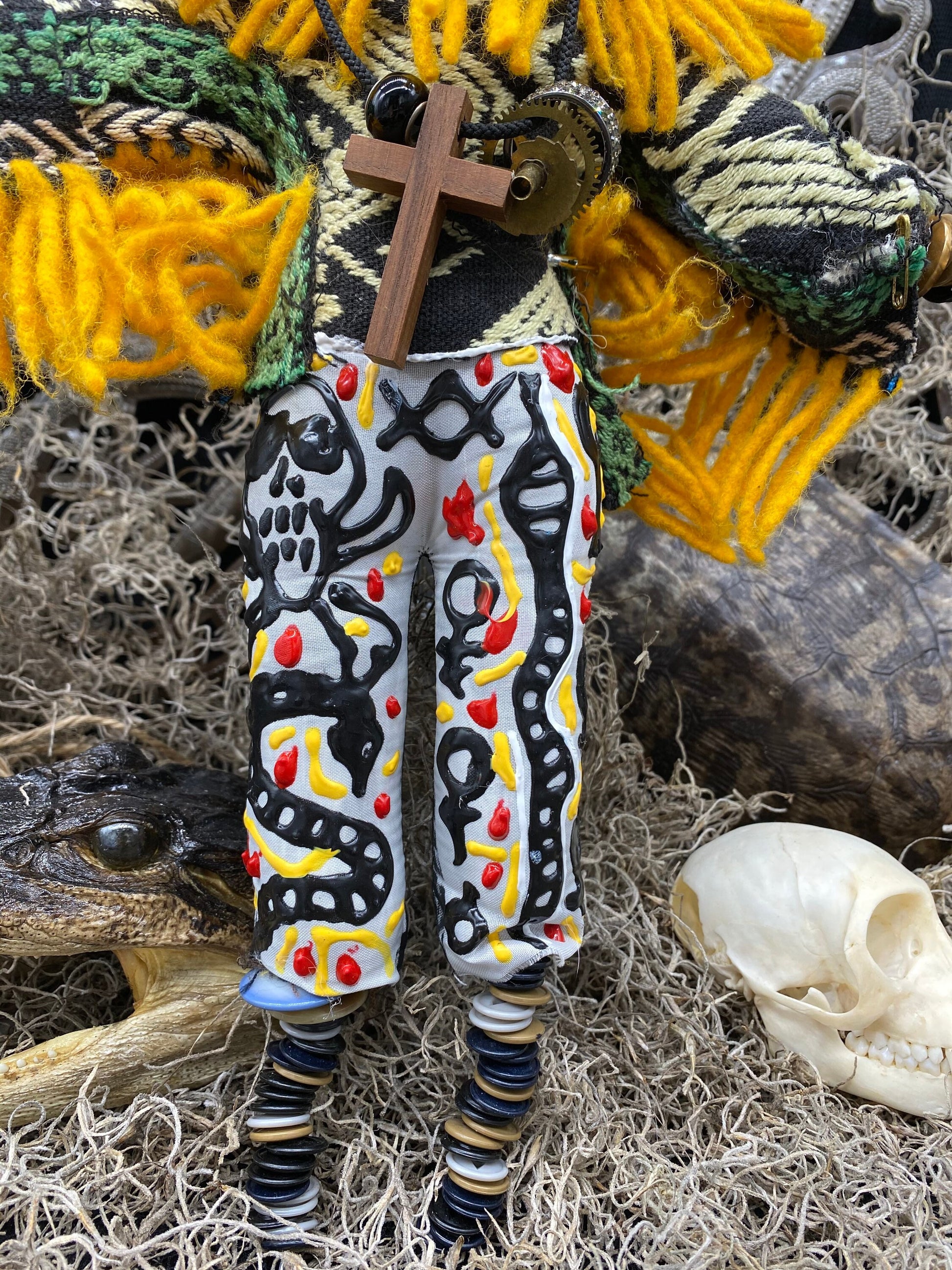 Our New Orleans Voodoo Doll is handcrafted, hand sewn, hand painted, and blessed. It is decorated with vintage adornments and an alligator bone.