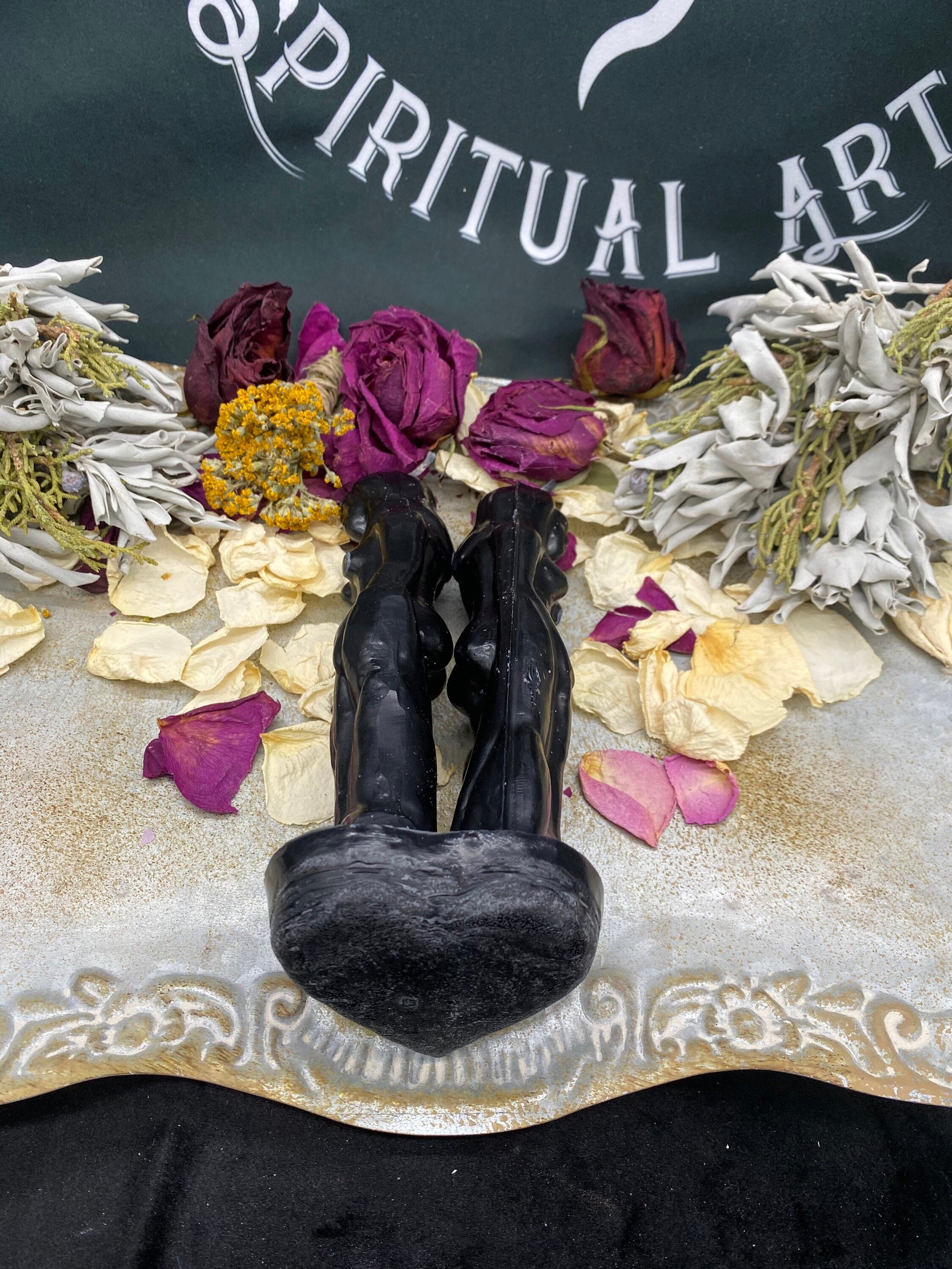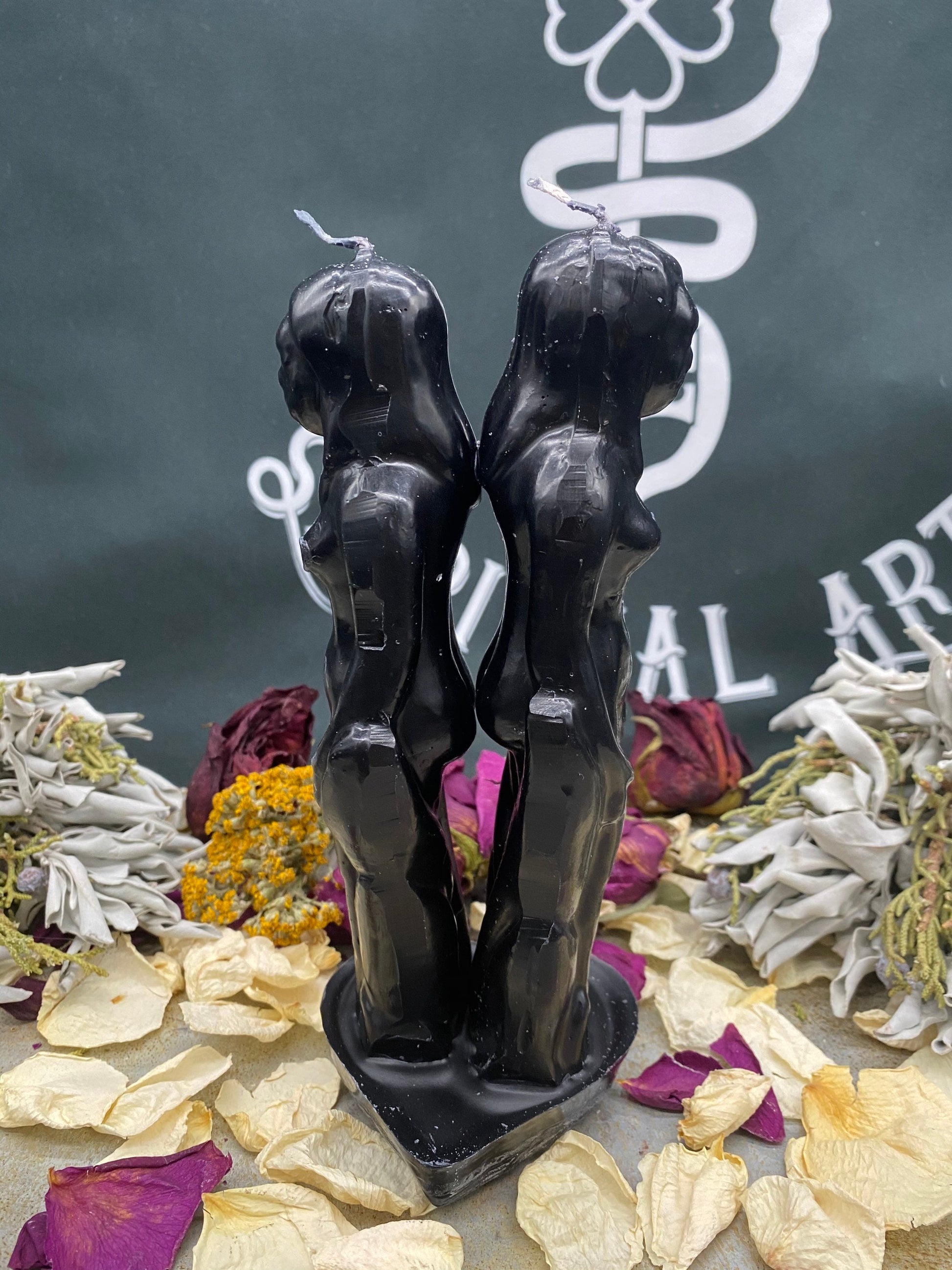We’re offering a black Lesbian Separation Candle for break ups or banishing. It comes with a cotton wick and measures approximately 7” x 3” x 3”. It is made of paraffin wax.