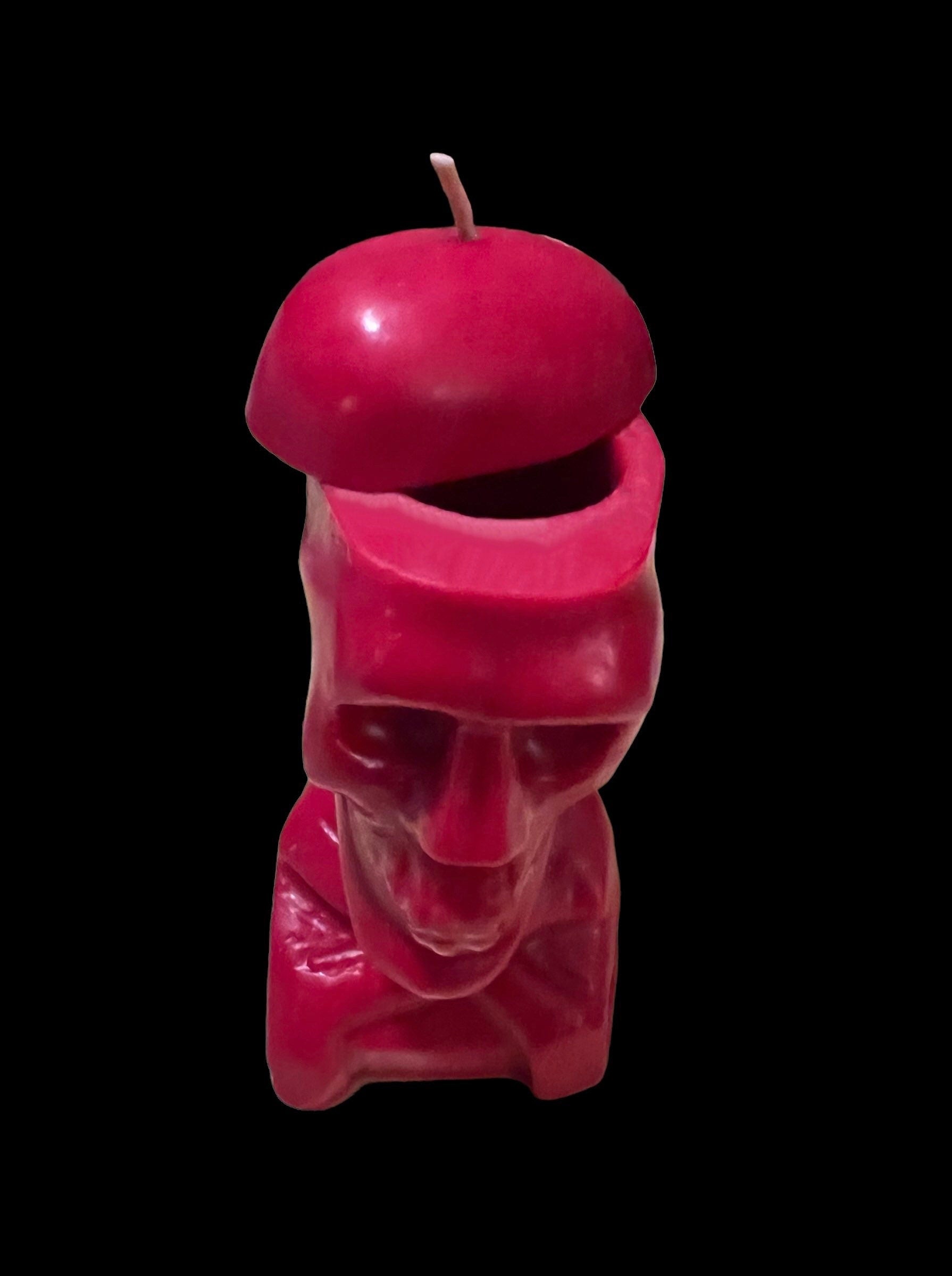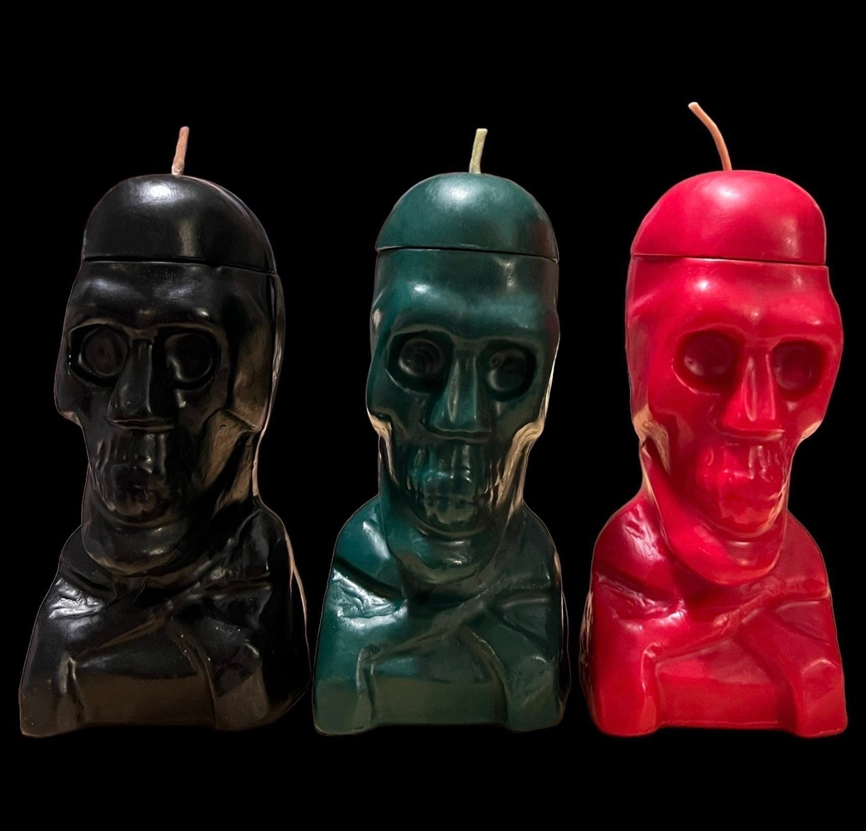 We’re offering a Loadable Skull & Crossbones Candle with an organic hemp wick that measures approximately 6” high, 3” long, and 3” wide. It is made of soy and paraffin wax.