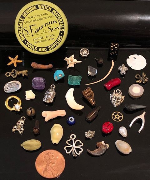 Medium Vintage Fargostein Tinned Travel Bone, Shell, and Trinket Divination Collection (40 Pieces)
