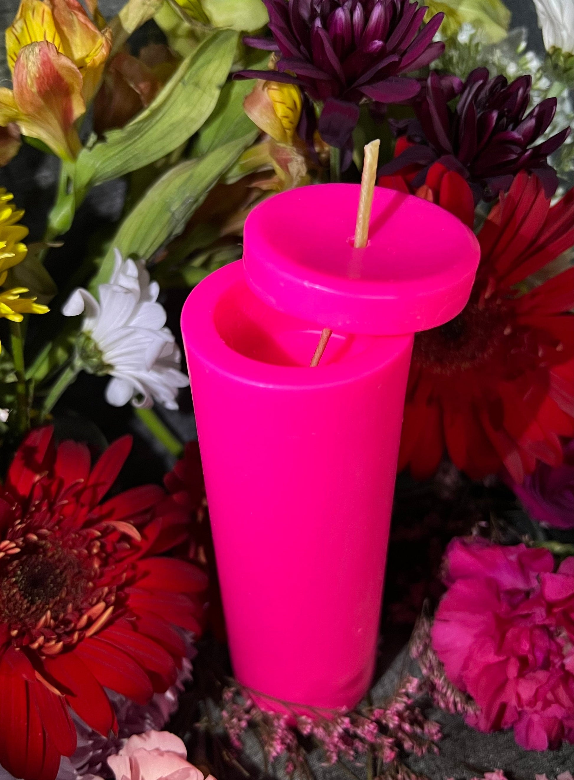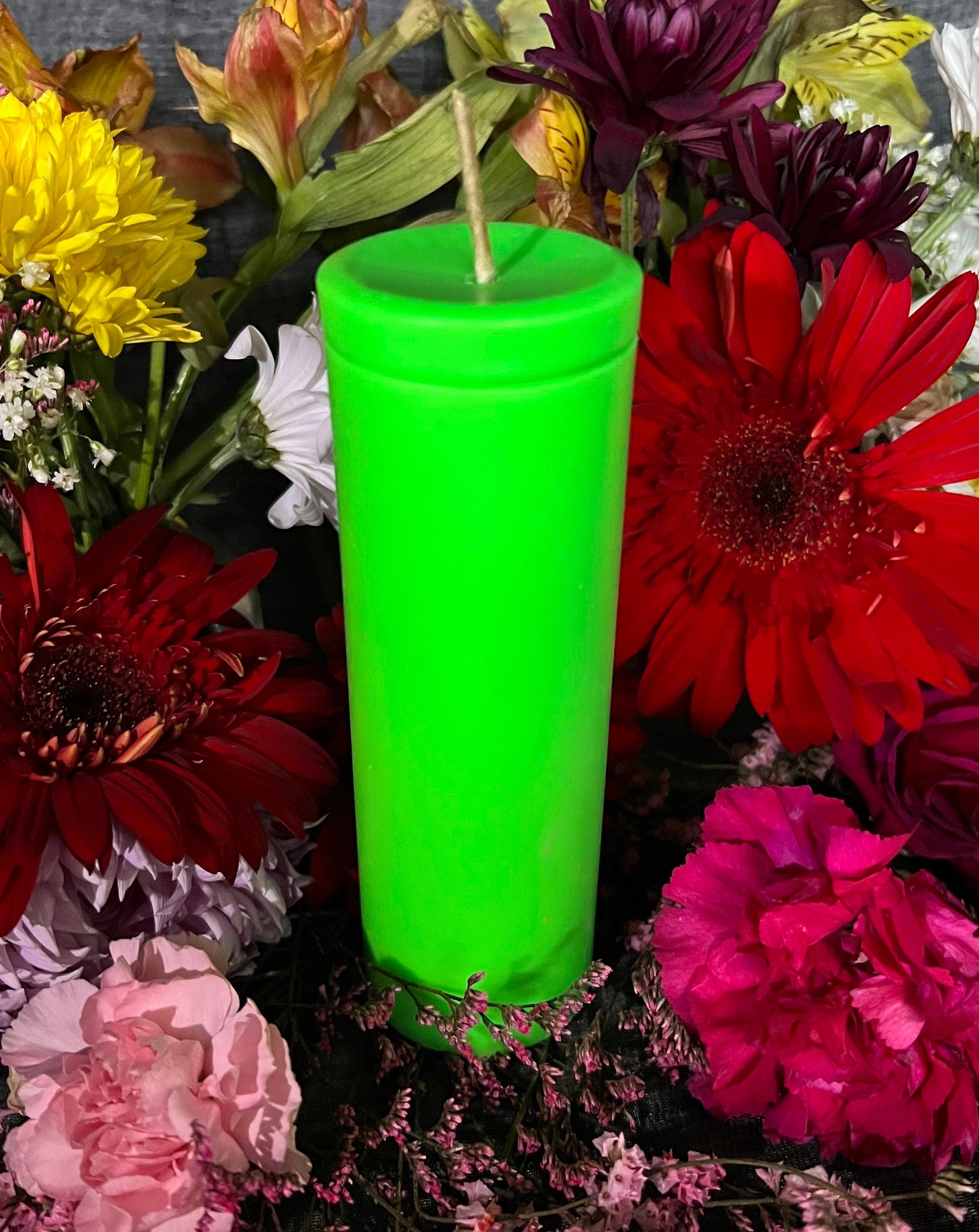 We’re offering a Neon Loadable Pillar Candle with an organic hemp wick that measures approximately 6” x 2”. It is made of paraffin wax. It is hollow. This is great for spells because it holds herbs, small petitions or ashes of a petition, resins, and oils.