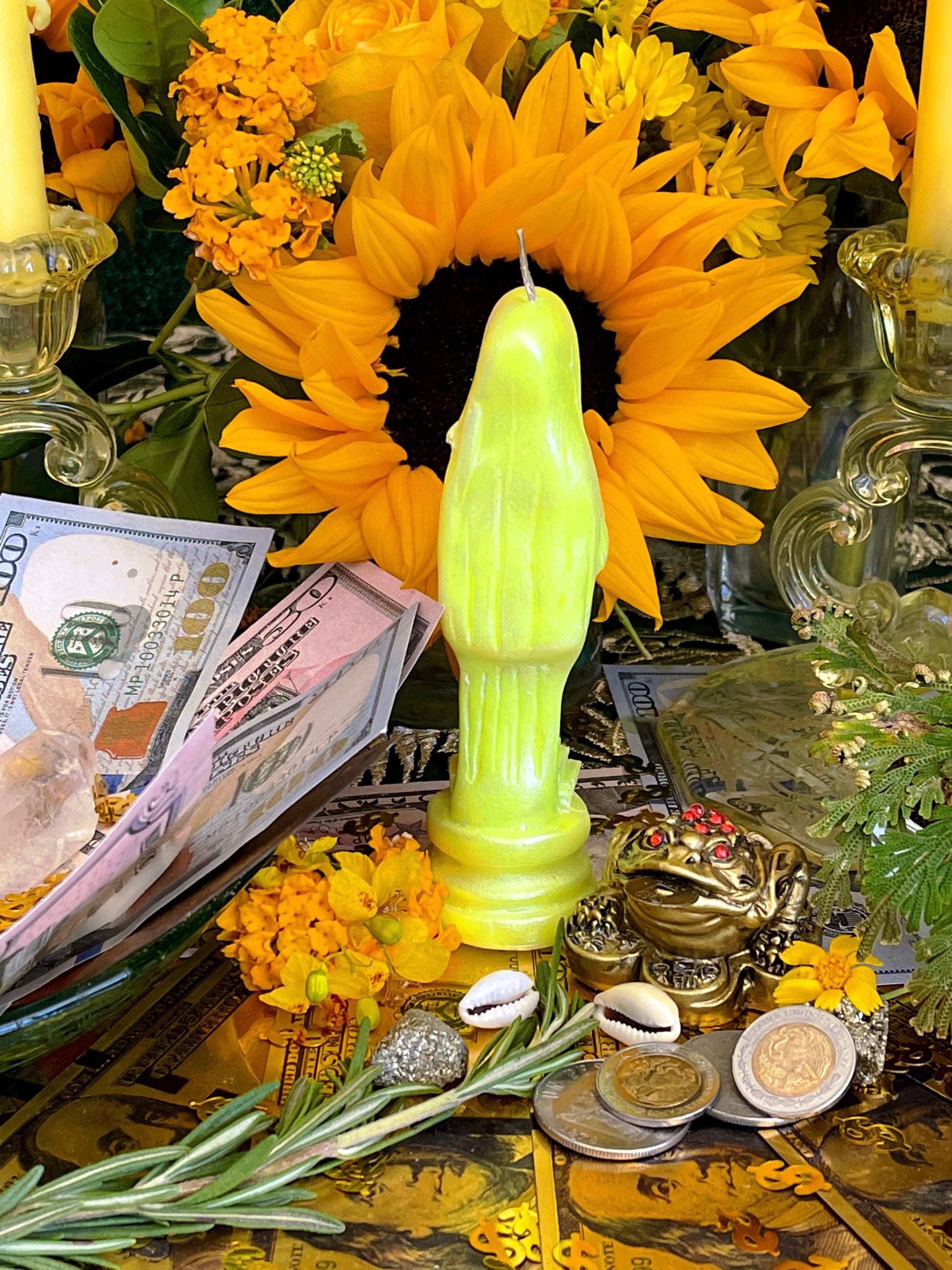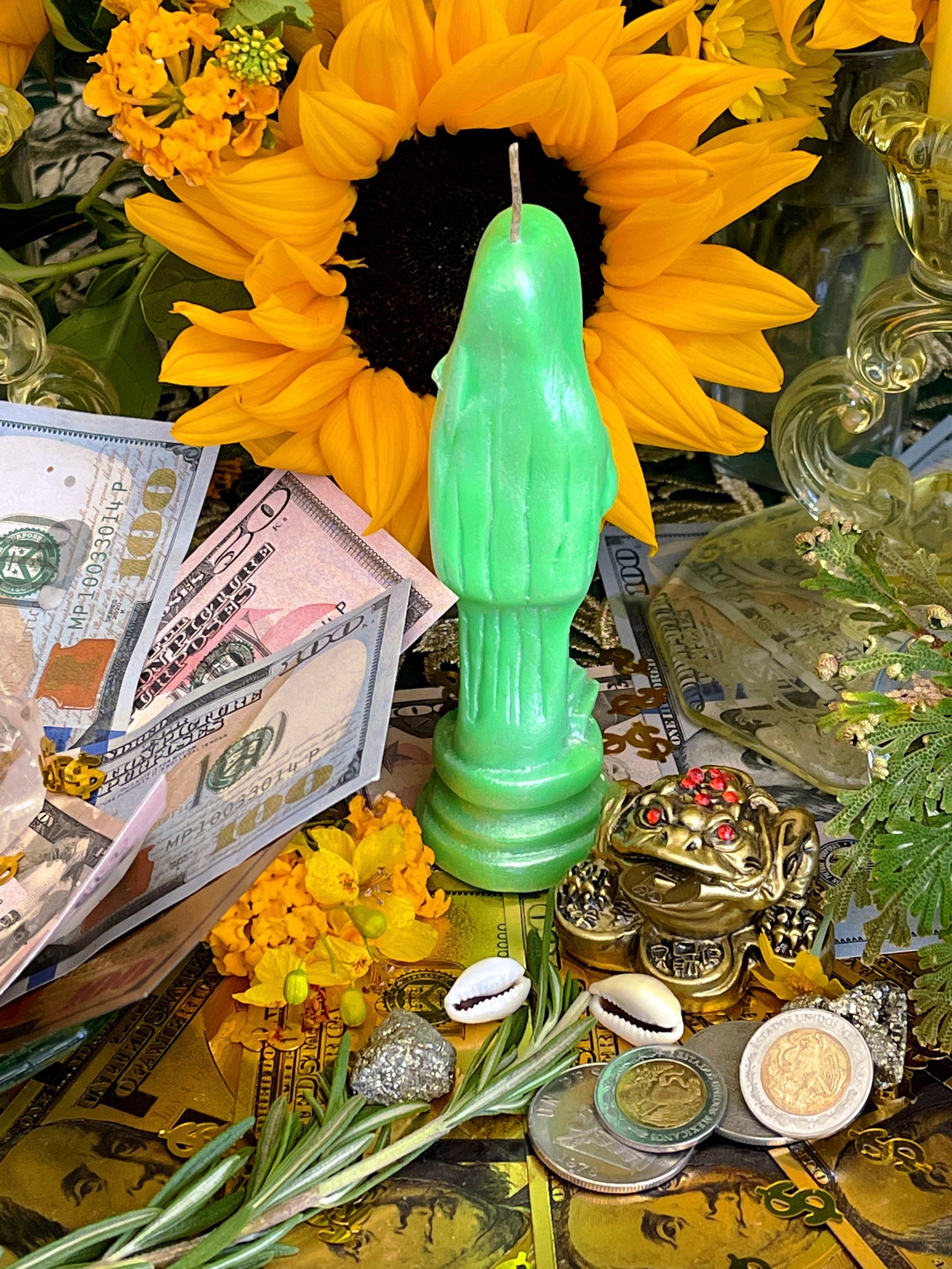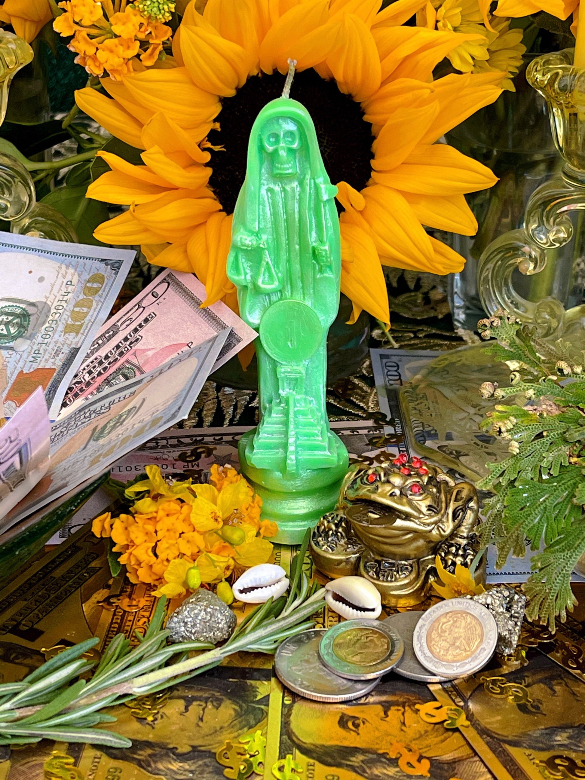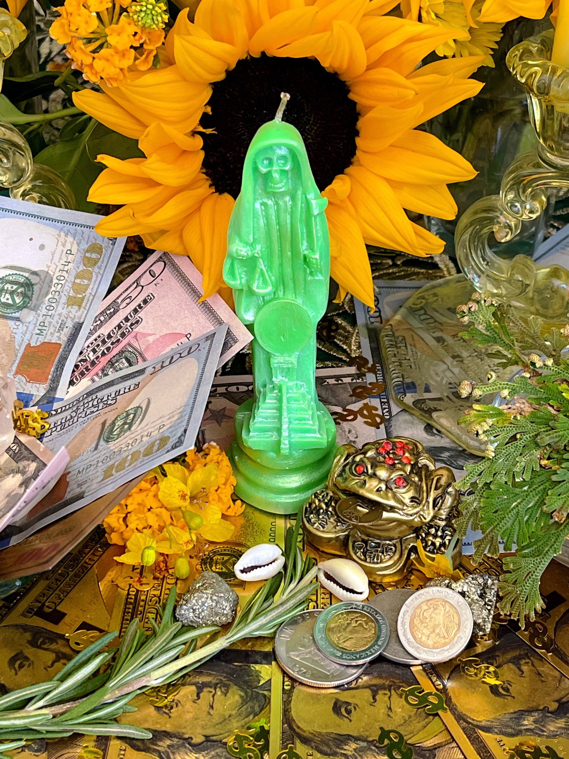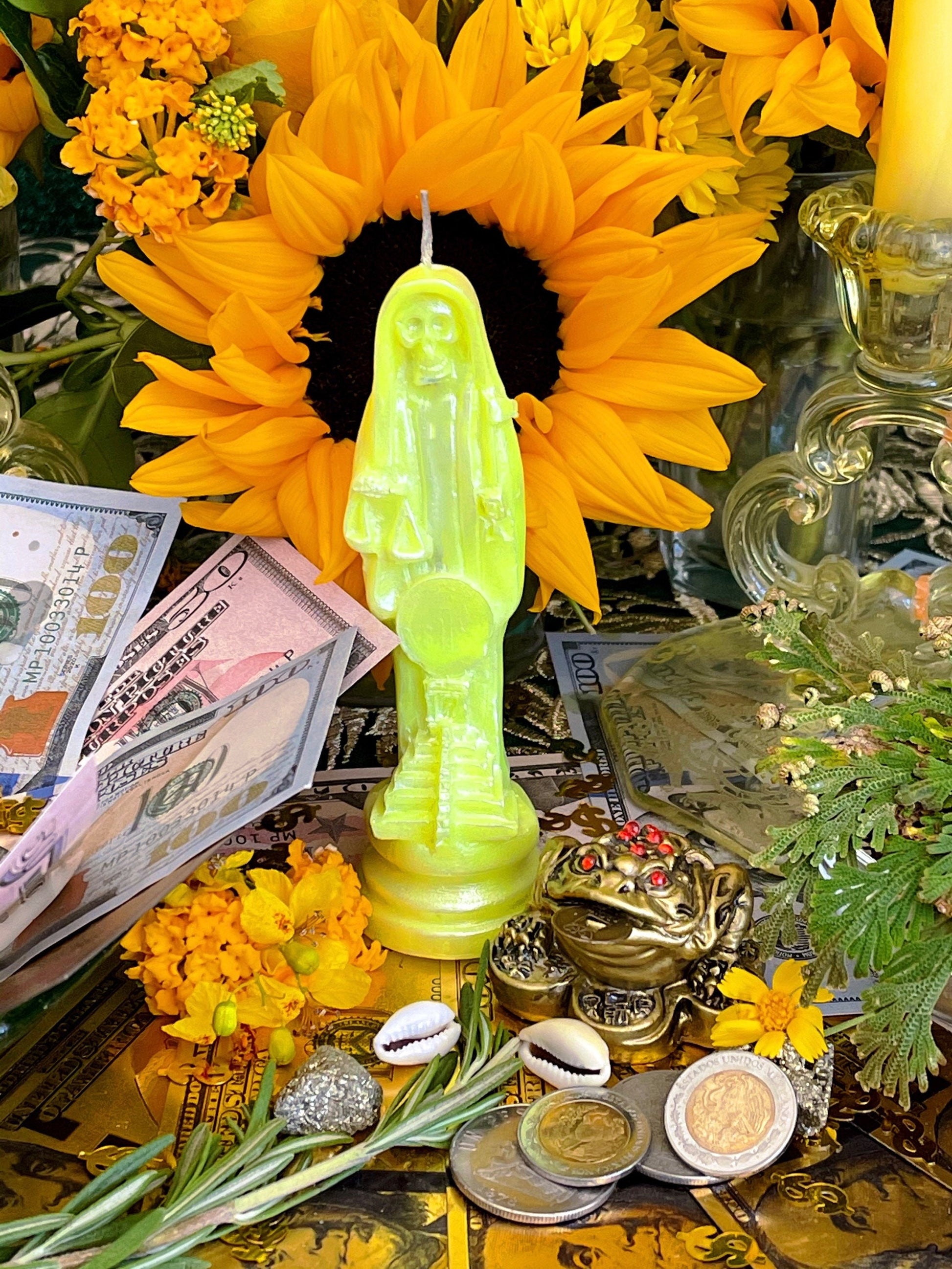 La Santa Muerte is a Mexican folk Catholic saint of death who is known by many names such as Santisima Muerte, La Flaca, La Niña, and La Madrina. La Santa Muerte is the embodiment of death with the highest power over life of any spirit or saint—second only to God. Many venerate her as she accepts people from all walks of life and does not discriminate against LGBTQ+, sex workers, criminals, and gang members. She is often depicted as a grim reaper-like skeleton holding a scythe, scales, or a globe. We’re offering a La Santa Muerte Neon Figure Candle with an organic hemp wick that measures approximately 5” x 2”. It is made of soy and paraffin wax. This candle pairs well with our La Santa Muerte Siete Colores Oil.