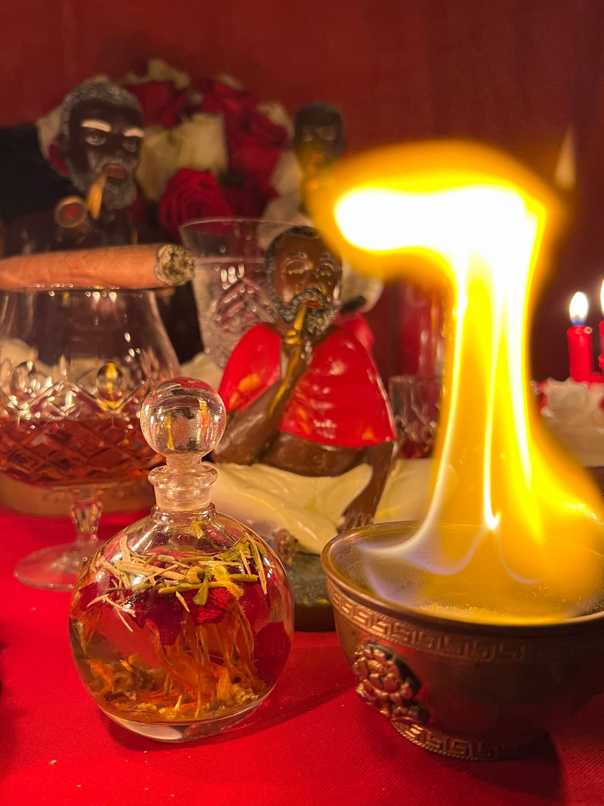 Papa Candelo is a safer spirit for noninitiates to serve in our tradition, but we recommend receiving guidance from a Sancista on how to serve him. We serve him with cigars, red cake, and shots of brandy or rum. We also light Florida Water fires for him, which we don’t recommend for safety reasons. He loves fireworks, roosters, dancing, women, and dice games. He’s friends with Belie Belcan. We work with Papa Candelo for protection, luck, healing, wisdom, business, courage, and uncrossing. He can be angered if not shown respect. He’s wise and can give great advice.