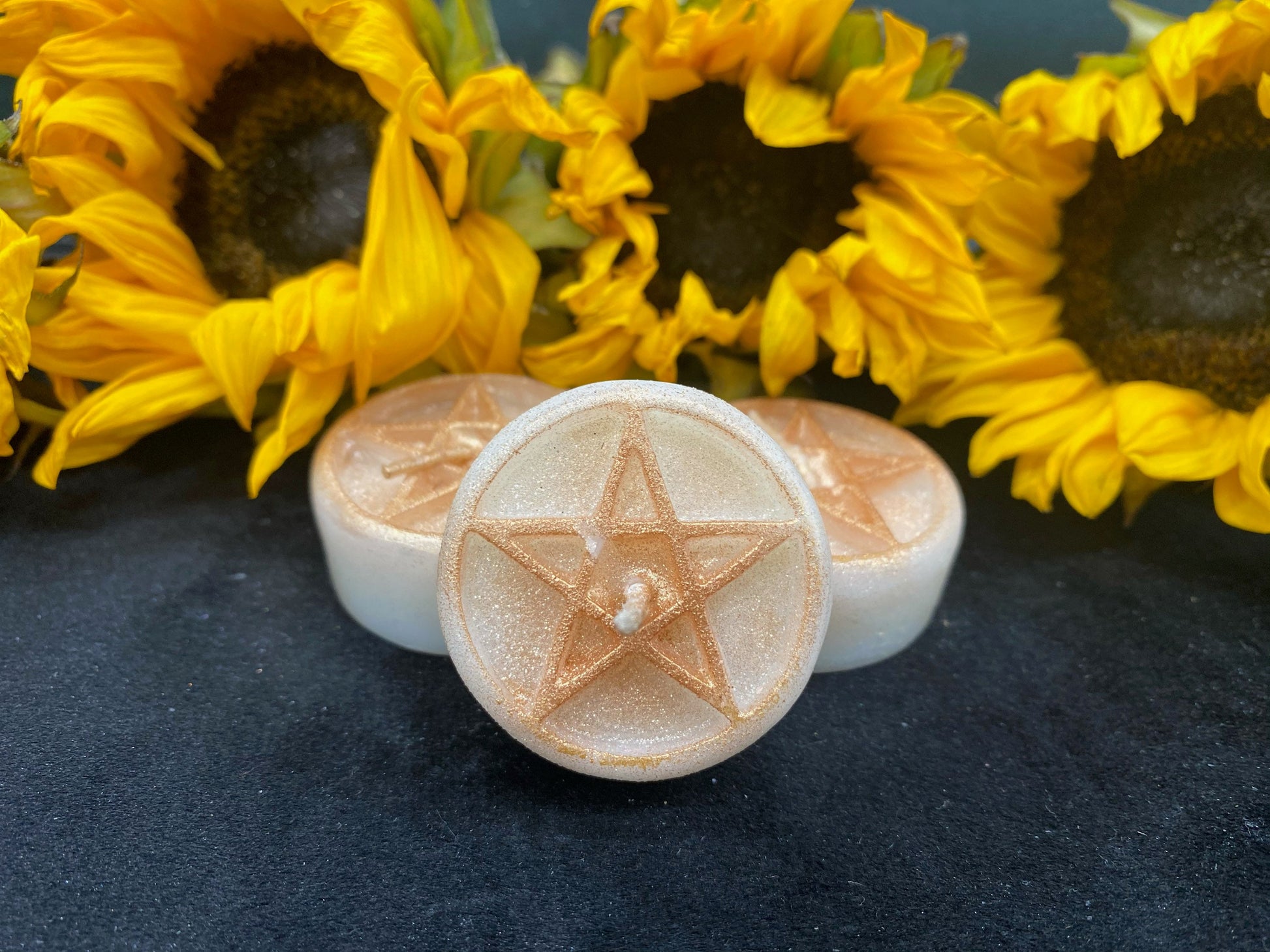 We’re offering four Pentacle Candles with organic hemp wicks. The candles measure approximately 1.5” wide and 1” deep. They are made of soy and paraffin wax.