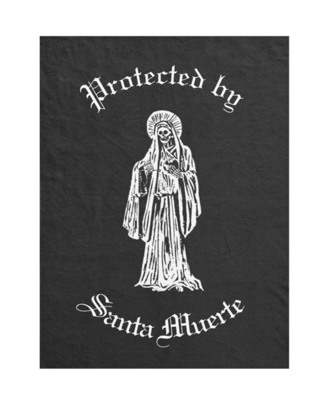 Santa Muerte is a Mexican folk Catholic saint of death who has many names such as La Santisima Muerte, La Nina, and La Huesita. La Santa Muerte is the embodiment of death with the highest power over life of any spirit or saint—second only to God. Many venerate her as she accepts people from all walks of life and does not discriminate against LGBTQ+, sex workers, criminals, and gang members. Many depict her as a grim reaper-like skeleton holding a scythe, scales, or a globe. ⁣Size: Fleece Blanket, 30"x40" It’s hard to cuddle by yourself. But with our Santa Muerte Fleece Blanket, you won’t have to anymore. Wrap yourself in personalized plush luxury. Delicate and soft, it's the perfect blanket for picnics in the park, outdoor events, and cozy winter snuggles. Available in 30"x40" and 1.75lbs. 100% buttery soft and cozy polyester fleece Sturdy double edge stitching for a clean finish Back color is off-white Machine washable, gentle cycle, mild detergent Tumble dry low.