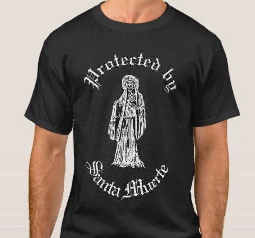 La Santa Muerte is a Mexican folk Catholic saint of death who is known by many names such as Santisima Muerte, La Flaca, La Niña, and La Madrina. La Santa Muerte is the embodiment of death with the highest power over life of any spirit or saint—second only to God. Many venerate her as she accepts people from all walks of life and does not discriminate against LGBTQ+, sex workers, criminals, and gang members. She is often depicted as a grim reaper-like skeleton holding a scythe, scales, or a globe. Protected by Santa Muerte T-Shirt 100% Cotton Machine Wash Cold Adult S 34-36 inches Adult M 38-40 inches Adult L 42-44 inches Adult XL 46-48 inches