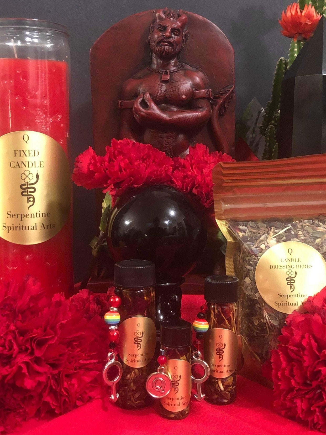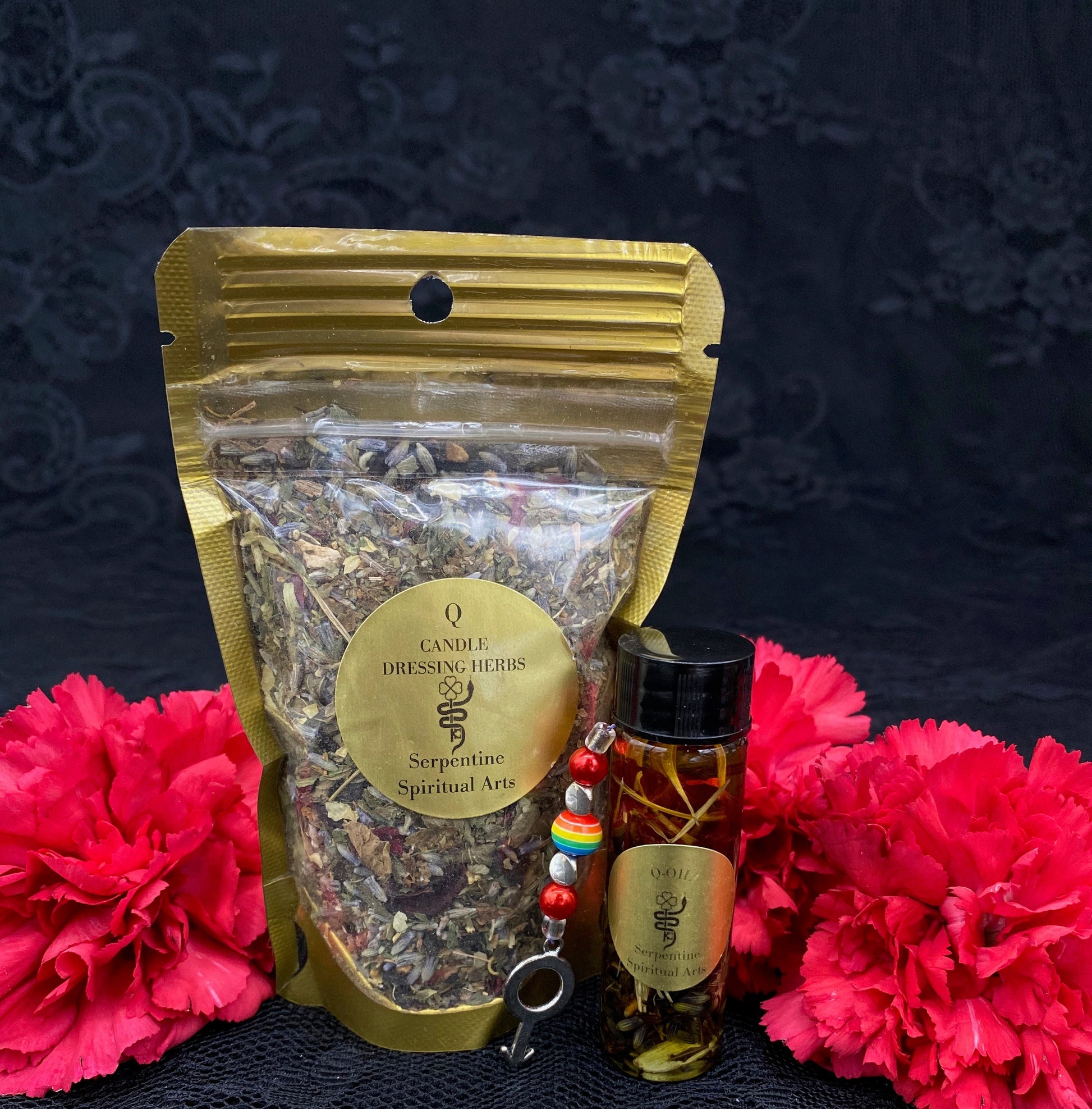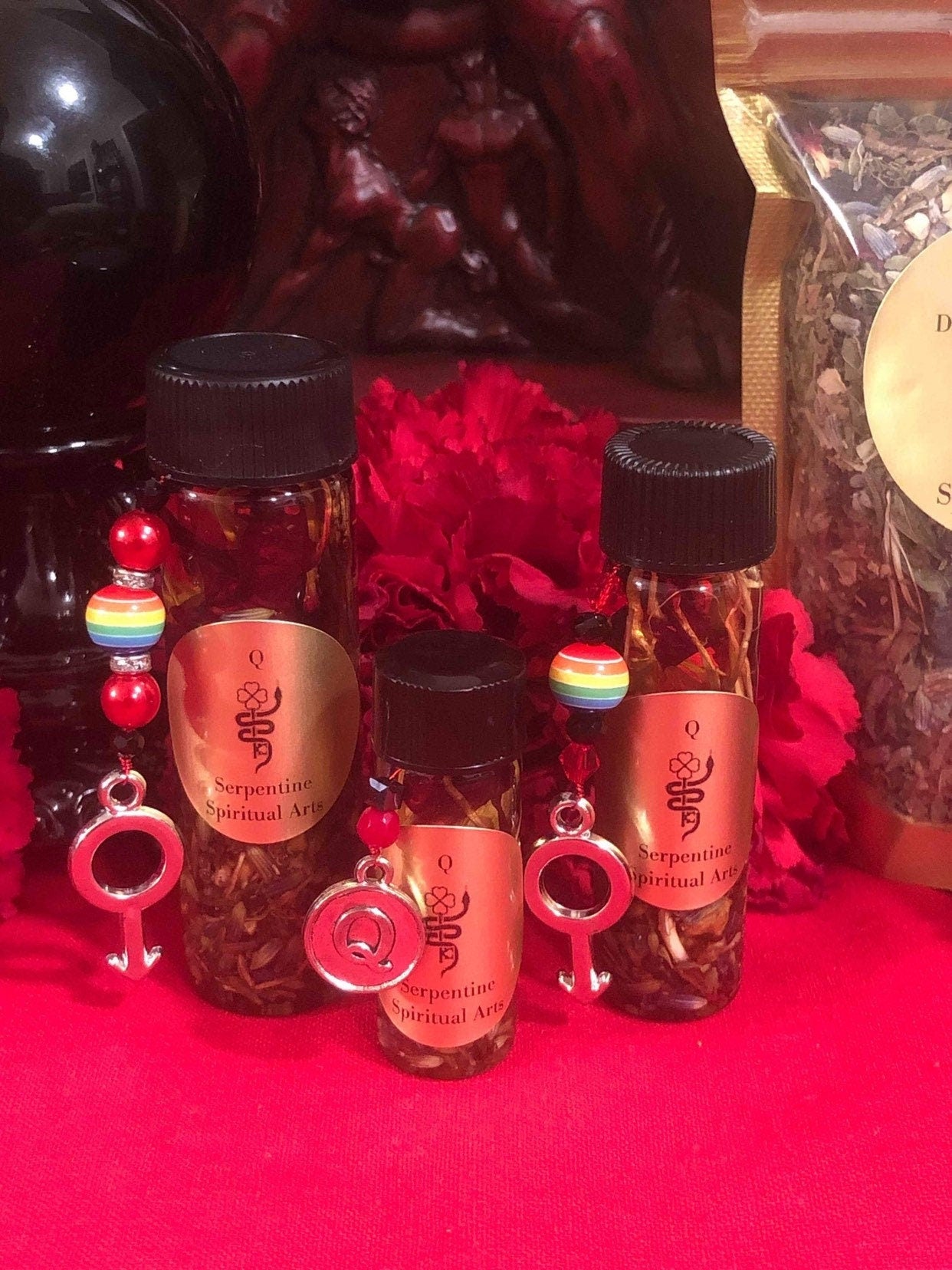 Our Q Oil assists gay men looking for passion, love, or casual encounters. Q stands for queer. It came about in the 1970s when gay men couldn’t openly discus their sexuality and during the James Bond era, which influenced naming of items with singular letters. We make our Q Oil with the finest ingredients, some of which include saffron, lavender, high-quality imported red musk, patchouli, ginger, violet, a pinch of gay bathhouse dirt, and many more. This oil is all natural with no fragrance oils or dyes, and it contains mostly organic ingredients. Sancista Jennifer handcrafts this oil with the highest quality ingredients available. She prayed over it for 9 days, and charged it on her altar. While supplies last, purchasing a 1/2 oz bottle of Q Oil comes with a 1” crystal penis to dress and carry with you. This pairs well with our Q Candle Dressing Herbs, which are not included. Sancista Jennifer (owner) and her partner Sancista Leah are committed to providing new and innovative products and services to the LGTBQ+ spiritual community.