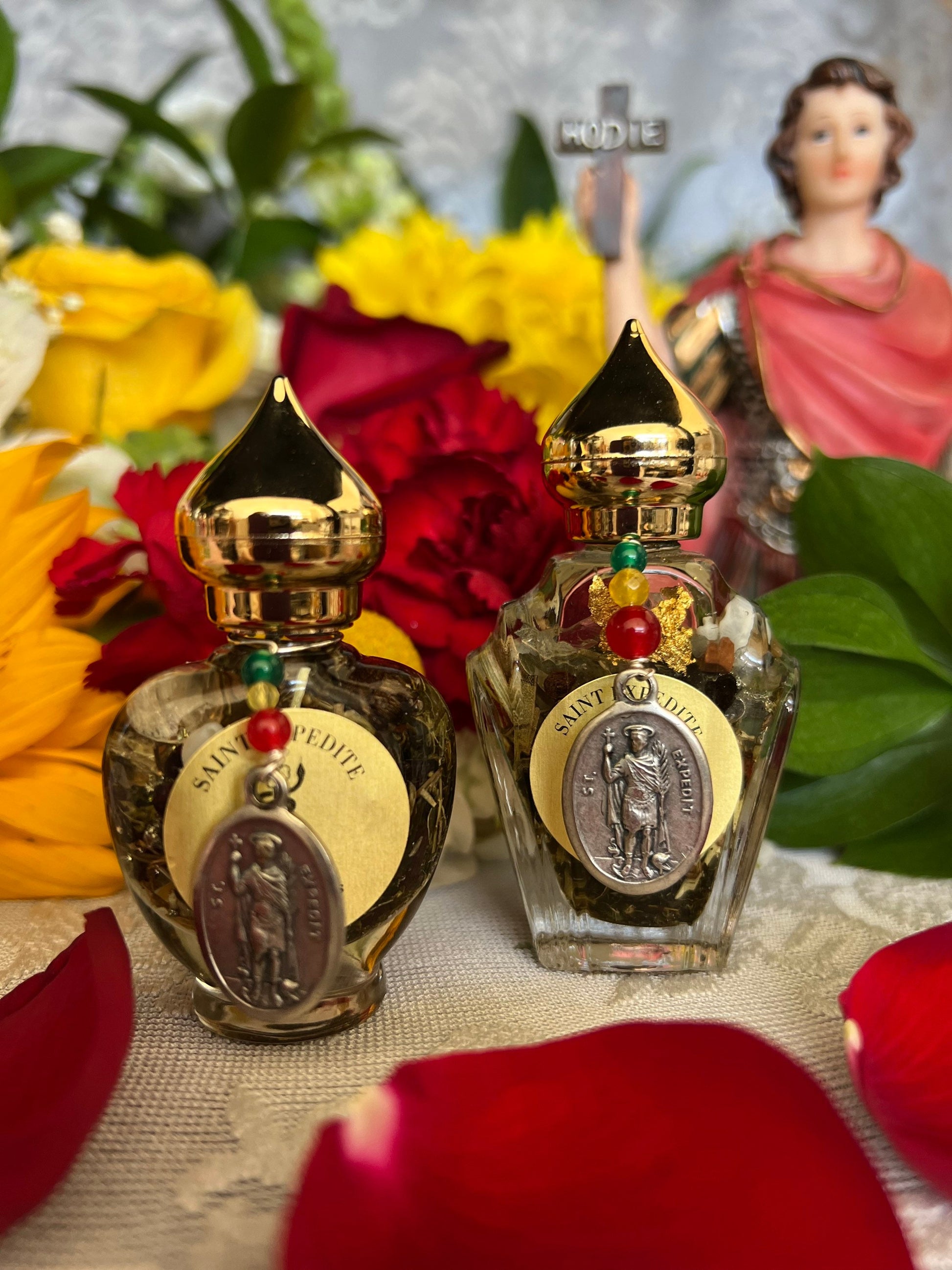 On April 19th, we celebrated the feast day of Saint Expedite. He has miraculous abilities to accomplish requests quickly and is popular for his fast response. He may provide assistance with impossible causes, financial success, health, legal problems, computers, relationships, and all mundane issues. We serve Saint Expedite with the colors red, yellow, green, and black. Some of his offerings include whisky, gin, tequila, clear rum, dragon’s blood incense, and red flowers. Consider working with Saint Expedite when you need help speeding up a process, are working towards a goal, feel progress is too slow, need prompt solutions, and are tired of waiting. If your situation is blocked, experiencing delays, affected by procrastination, detained or hindered, Saint Expedite can help you get it moving in a positive direction. Saint Expedite can bring movement and progress in situations that have stalled for weeks, months, or even years. Some people finally win lawsuits after battling for years. Some finalize bitter divorces. Some find jobs after periods of unsuccessful searches but before unemployment runs out. When working with Saint Expedite, you will need to obtain a statue or an image of him. To petition him, you would use a sabbath candle or a 7-day candle, depending on your situation. You can give a small offering while he is working your case. When your case is resolved and you have received your results, you should give his favorite offering (lemon pound cake) very soon after. Since you experienced fast results, you should give him his offering just as quickly, unless you promised it on a certain day. You can leave offerings on his altar for three, seven, or nine days. When the offering is finished, you can leave it in a crossroads. Here is a prayer to petition him: Saint Expedite, you lay in rest. I come to you and ask that this wish be granted. (State your request) Expedite now what I ask of you. Expedite now what I want of you, this very second. Don’t waste another day. Give me what I ask for. I know your power, I know you because of your work. I know you can do it. Do this for me and I’ll spread your name with love and honor and cause your name to be invoked. Expedite this wish with speed, love, honor, and goodness. Glory to you, Saint Expedite! Sancista Jennifer handcrafts this oil with the highest quality traditional and divined ingredients available. She created it on Saint Expedite’s feast day, prayed over it for 9 days, and charged it on her altar. She decorated the bottles with various gemstones, pearls, and Czech glass beads. There are over 10 ingredients in this oil, as dictated by Saint Expedite. Some ingredients include 24K gold, cinnamon, garnet, and shredded money. It comes in a luxurious gold 1/3 oz or 1/2 oz bottle.