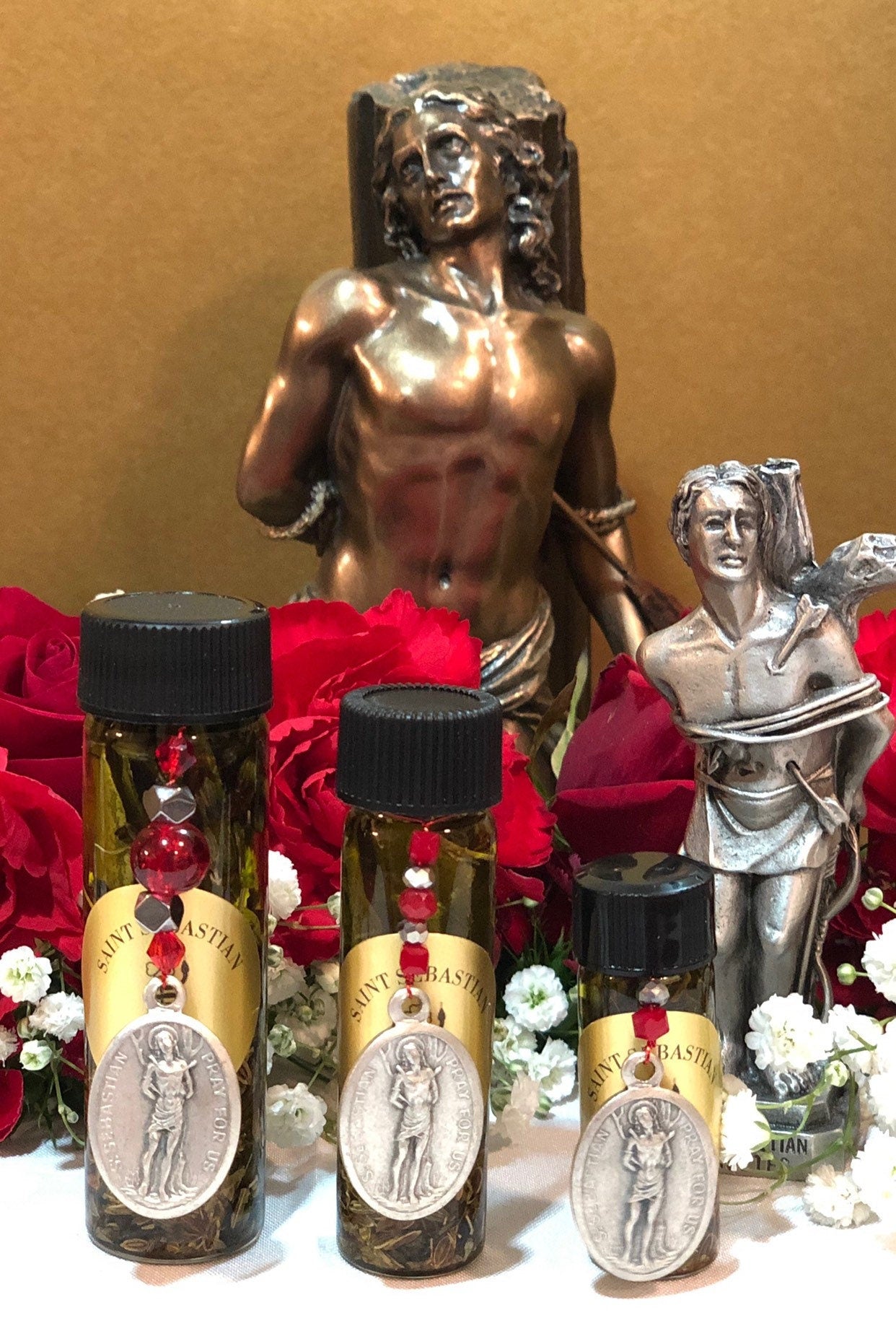 This oil is handcrafted by Sancista Jennifer with the highest quality traditional and divined ingredients available. She created it on Saint Sebastian’s feast day, prayed over it for 9 days, and charged it on her altar. She decorated it with various gemstones, pearls, and Czech glass beads.