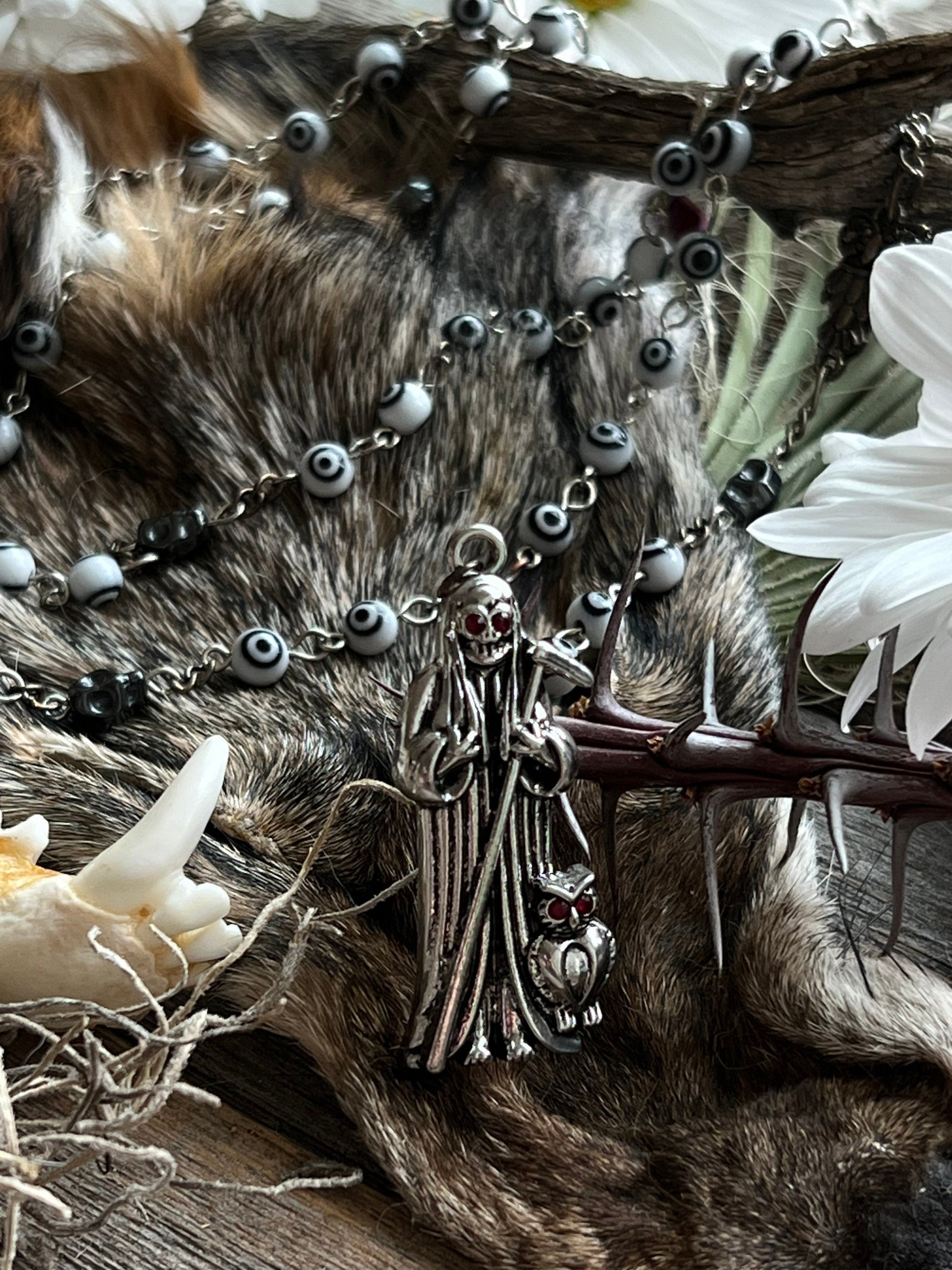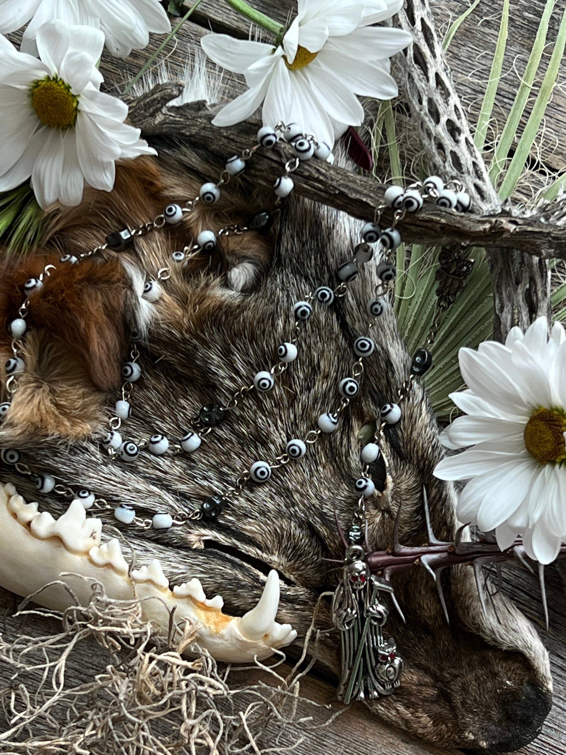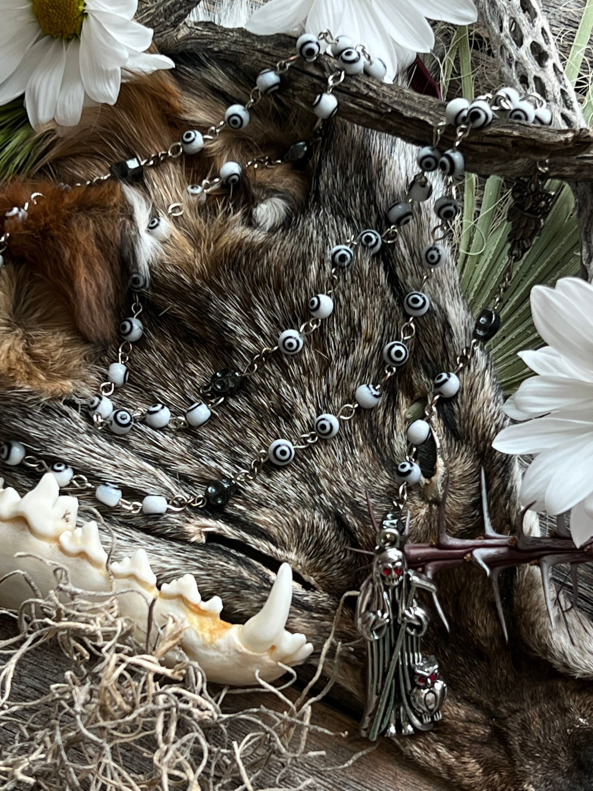 Santa Muerte Blanca Evil Eye Rosary + Sterling Silver Plated Chain + Handcrafted + Rosario