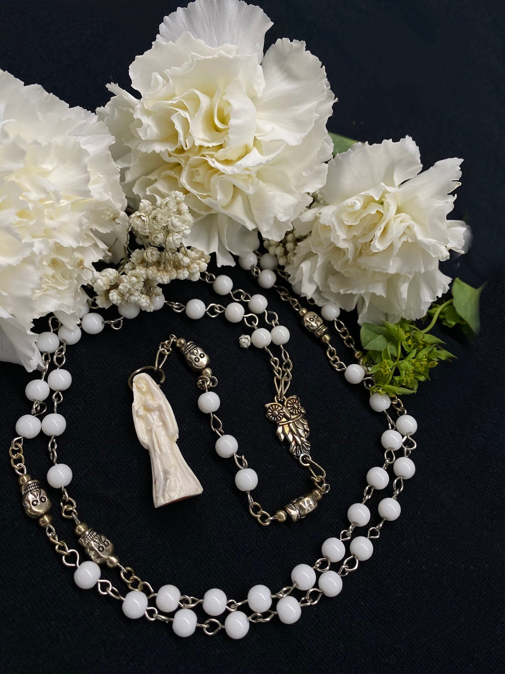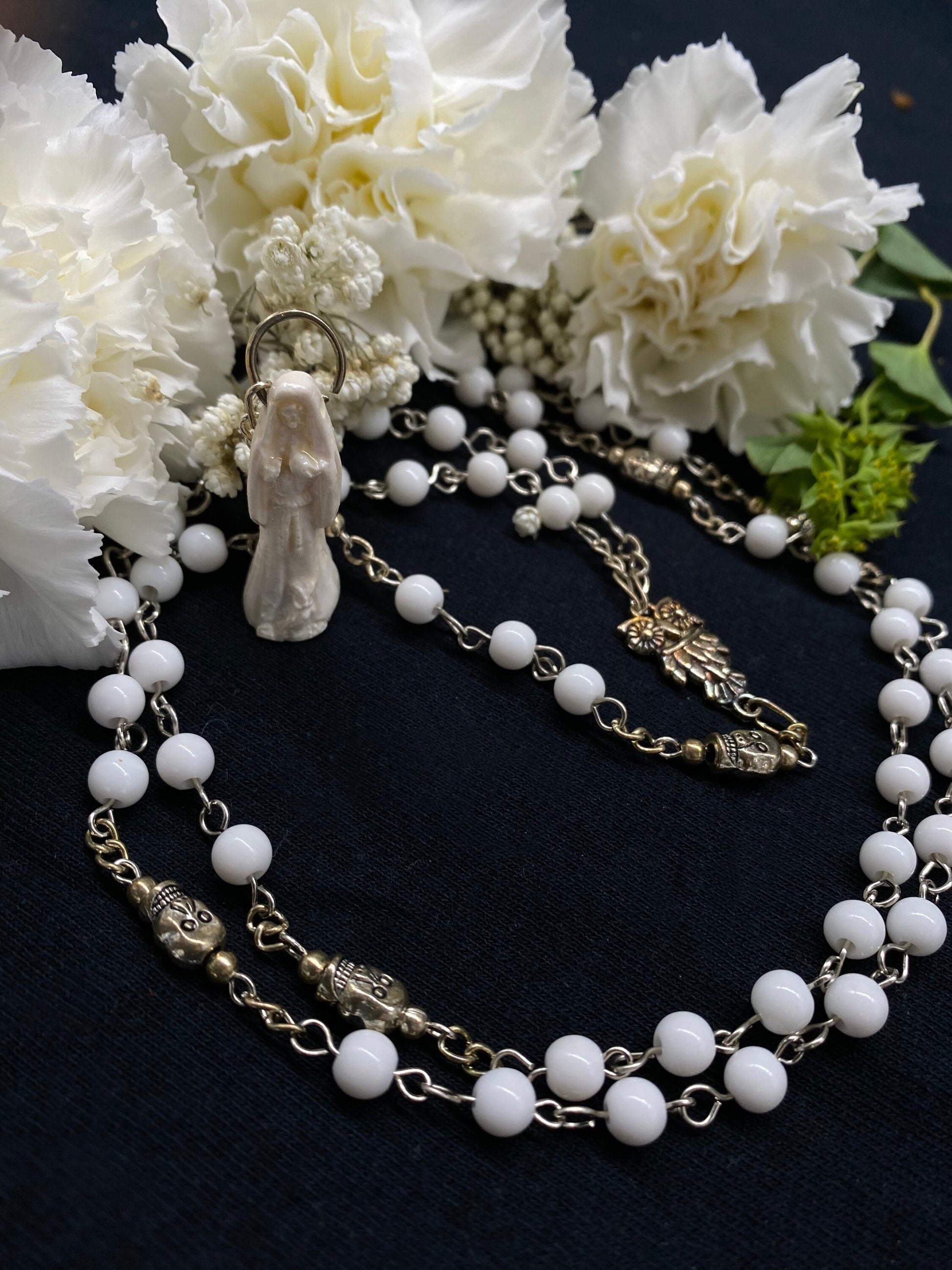 Santa Muerte Blanca Rosary + Gemstone + Blessed + Sterling Silver Plated Chain + Handcrafted + Rosario