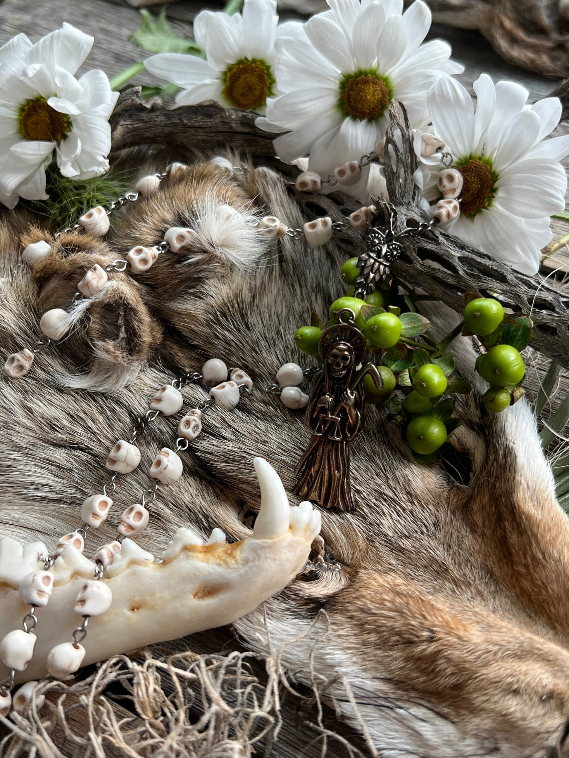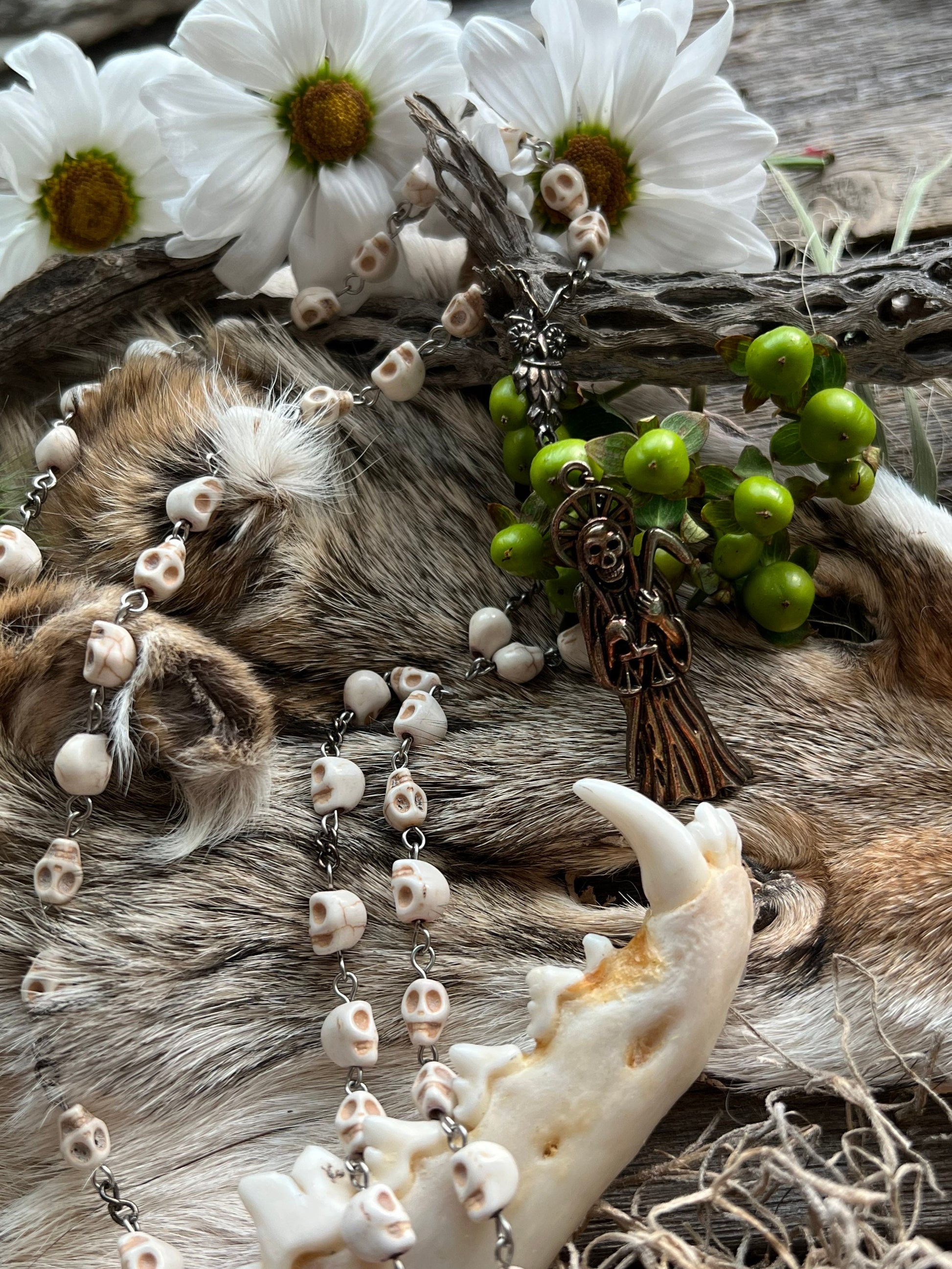 La Santa Muerte is a Mexican folk Catholic saint of death who is known by many names such as Santisima Muerte, La Flaca, La Niña, and La Madrina. La Santa Muerte is the embodiment of death with the highest power over life of any spirit or saint--second only to God. Many venerate her as she accepts people from all walks of life and does not discriminate against LGBTQ+, sex workers, criminals, and gang members. She is often depicted as a grim reaper-like skeleton holding a scythe, scales, or a globe. La Santa Muerte has three traditional robes or personalities: white (La Blanca), red (La Roja), and black (La Negra). Each robe represents a different side of her. La Blanca is the most approachable robe and is the aspect of purity, healing, guidance, peace, balancing emotions, and cleansing. La Roja represents love, money, prosperity, passion, justice, legal issues, fidelity, and marriage. La Negra is the fiercest of the robes and is feared by other malevolent spirits. She is associated with protection, reversing, revenge, and cursing. This rosary was handmade by a Muertera using howlite skulls and a metal Santa Muerte Charm. We cleansed each of them with a ritual and blessed them on Santa Muerte’s altar.