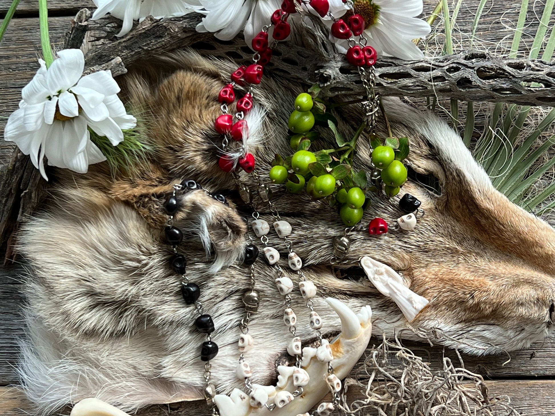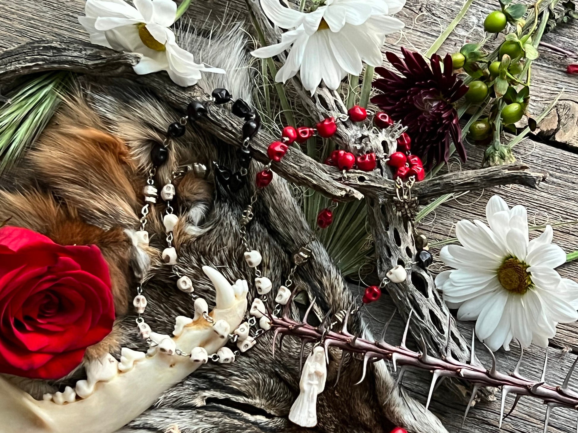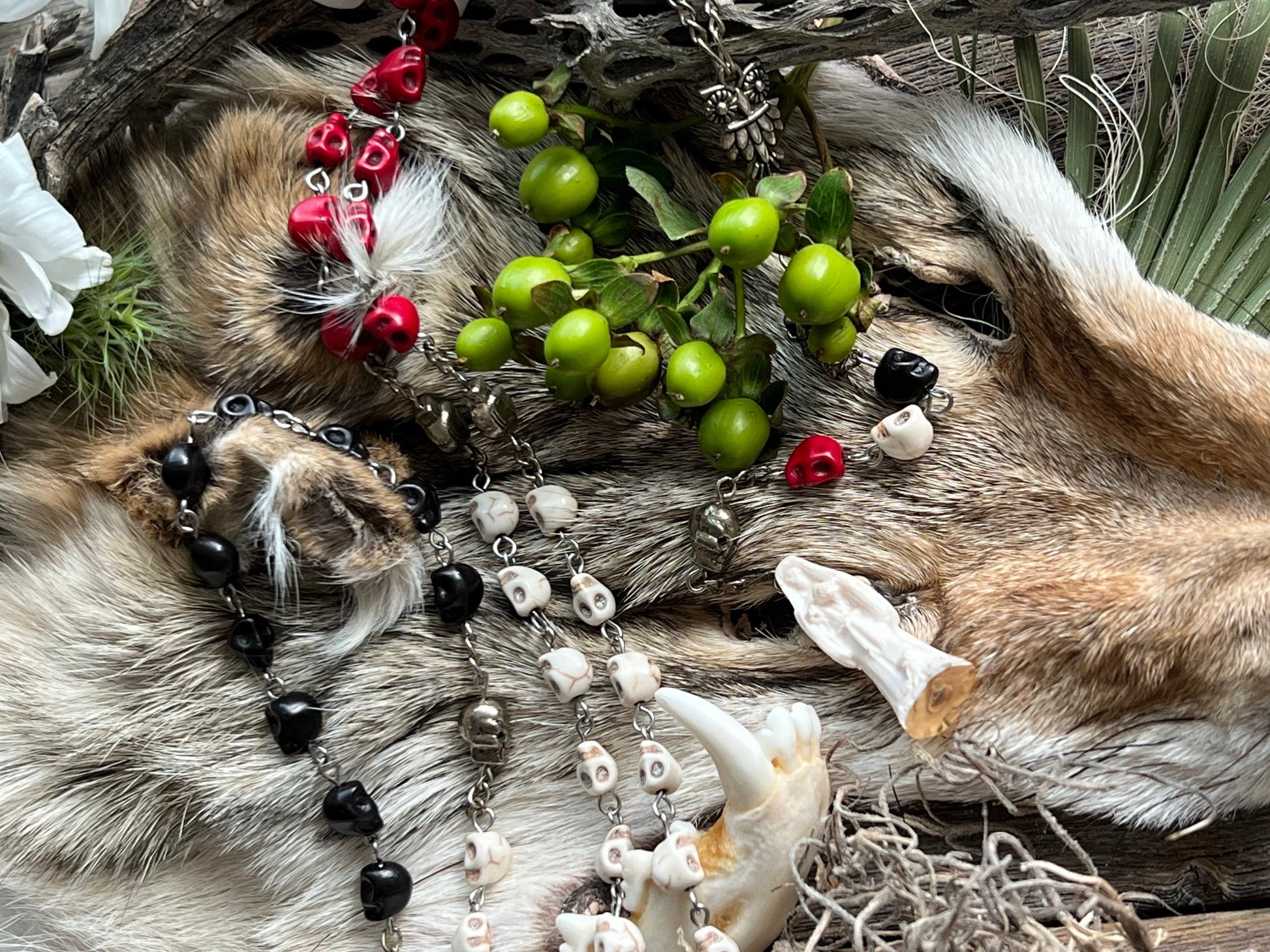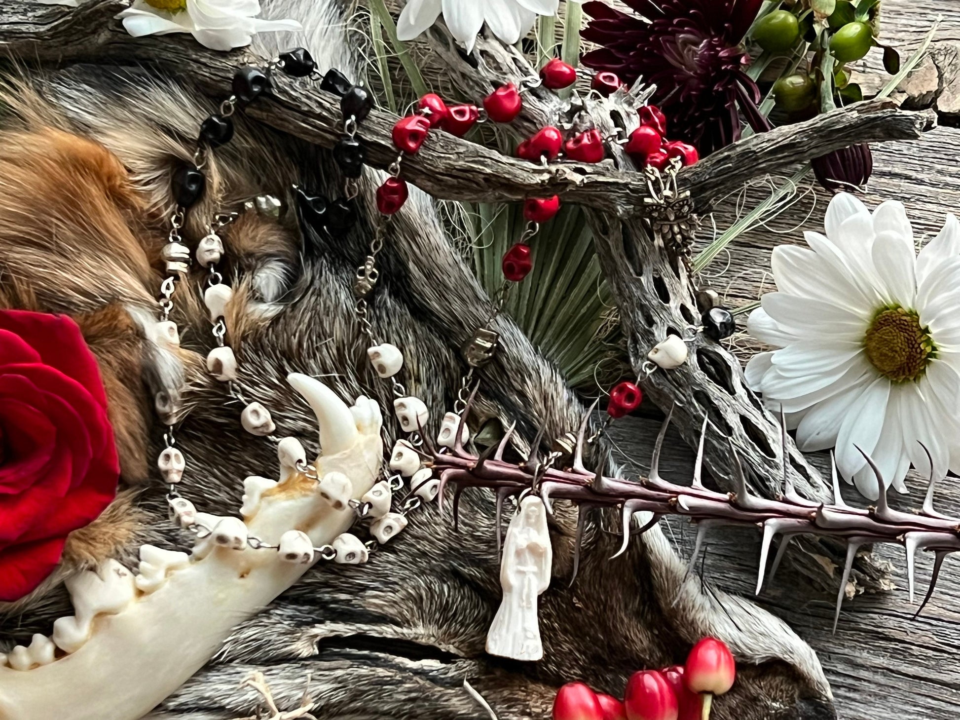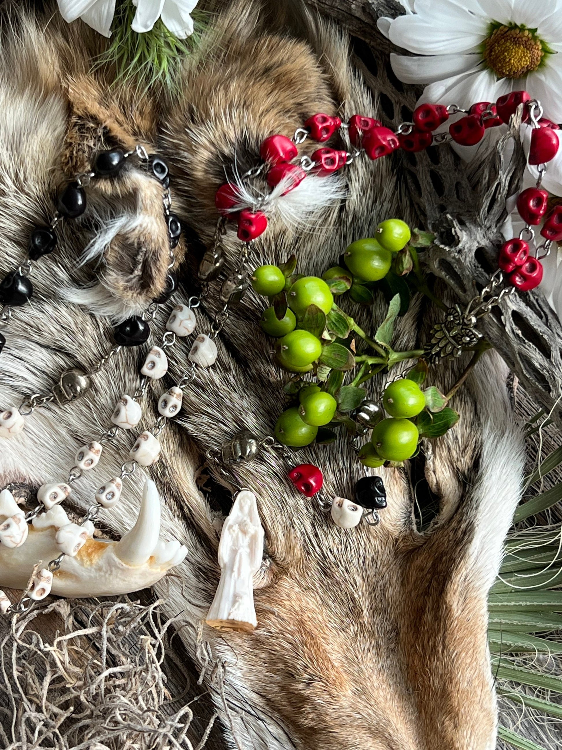 La Santa Muerte is a Mexican folk Catholic saint of death who is known by many names such as Santisima Muerte, La Flaca, La Niña, and La Madrina. La Santa Muerte is the embodiment of death with the highest power over life of any spirit or saint--second only to God. Many venerate her as she accepts people from all walks of life and does not discriminate against LGBTQ+, sex workers, criminals, and gang members. She is often depicted as a grim reaper-like skeleton holding a scythe, scales, or a globe. La Santa Muerte has three traditional robes or personalities: white (La Blanca), red (La Roja), and black (La Negra). Each robe represents a different side of her. La Blanca is the most approachable robe and is the aspect of purity, healing, guidance, peace, balancing emotions, and cleansing. La Roja represents love, money, prosperity, passion, justice, legal issues, fidelity, and marriage. La Negra is the fiercest of the robes and is feared by other malevolent spirits. She is associated with protection, reversing, revenge, and cursing. This rosary was handmade by a Muertera using howlite skulls, sterling silver plated wire, and a fixed La Santa Muerte Statue. We cleansed each of them with a ritual and charged them on La Santa Muerte's altar.