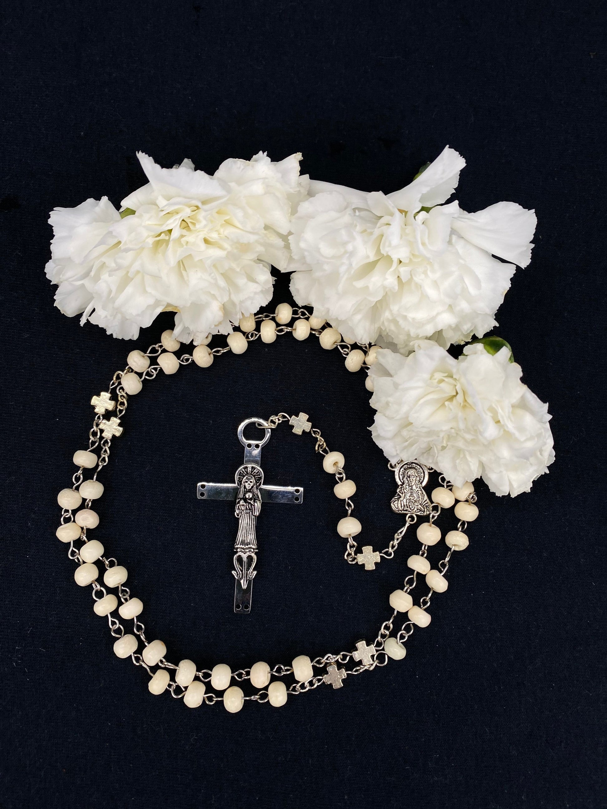 Santa Muerte Blanca Rosary with Bone Beads & Santa Muerte Cross + Sterling Silver Plated Chain + Handcrafted + Rosario
