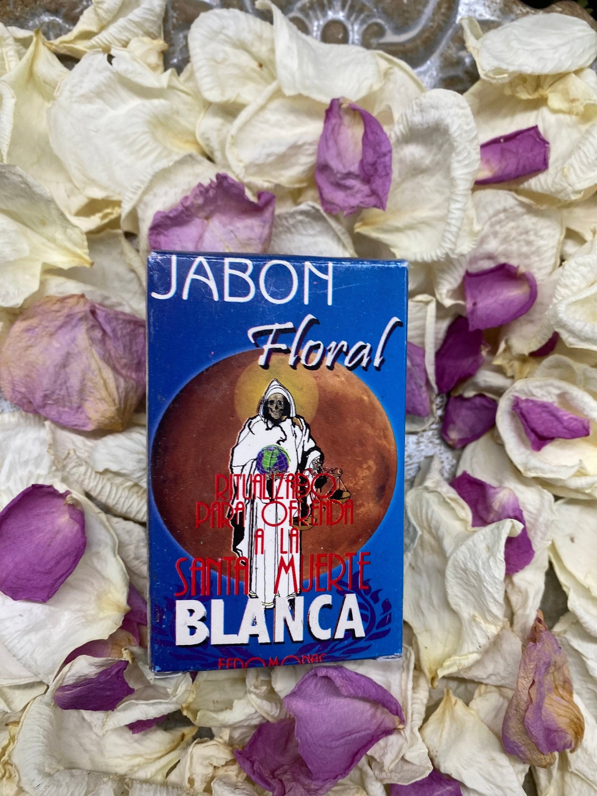 This soap is to use with La Santa Muerte Blanca. It is approximately 3.5” and floral scented. It is made in Mexico.