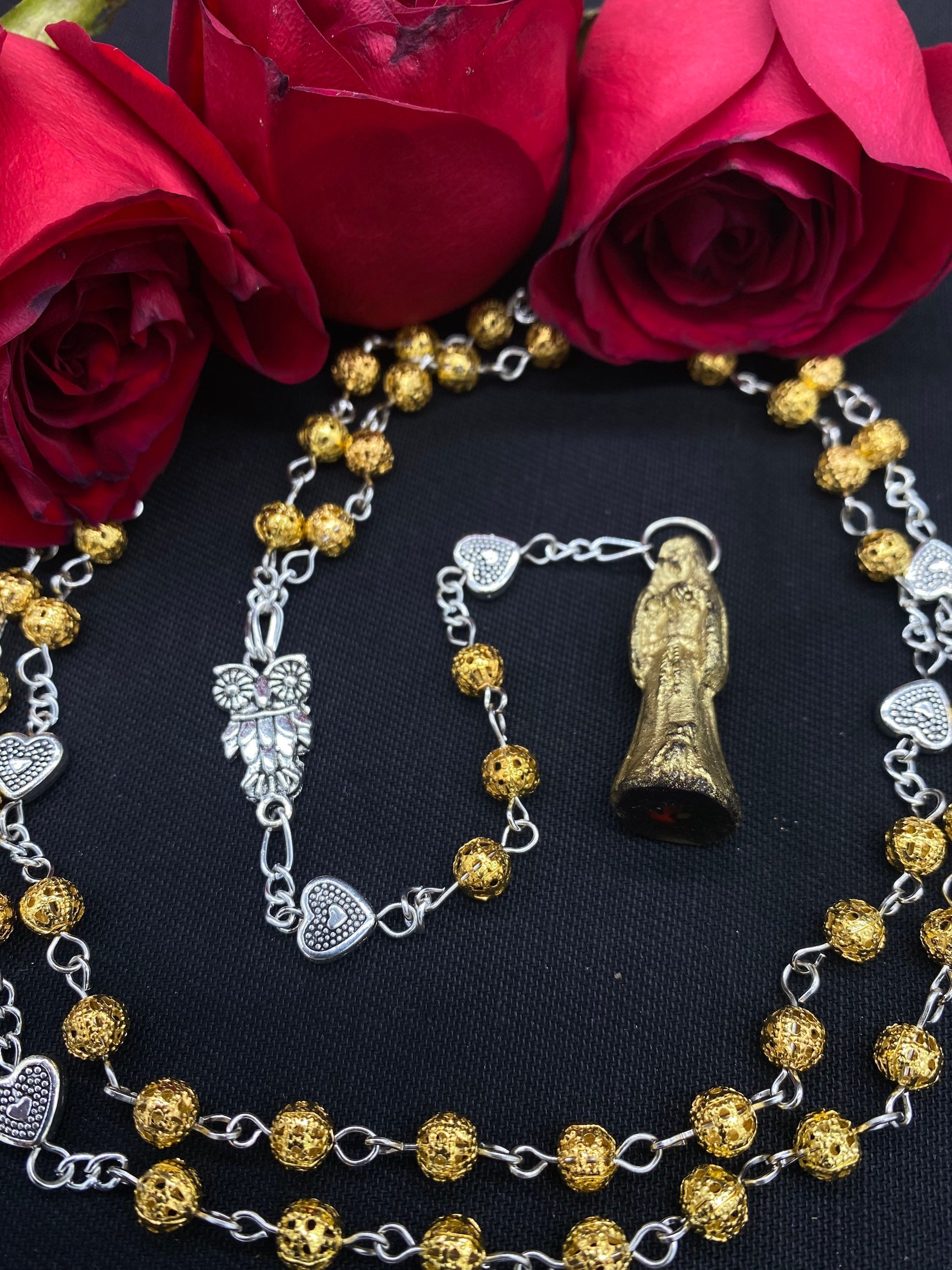Santa Muerte Dorada Rosary + Oro + Heart of Gold + Blessed + Sterling Silver Plated Chain + Handcrafted + Rosario