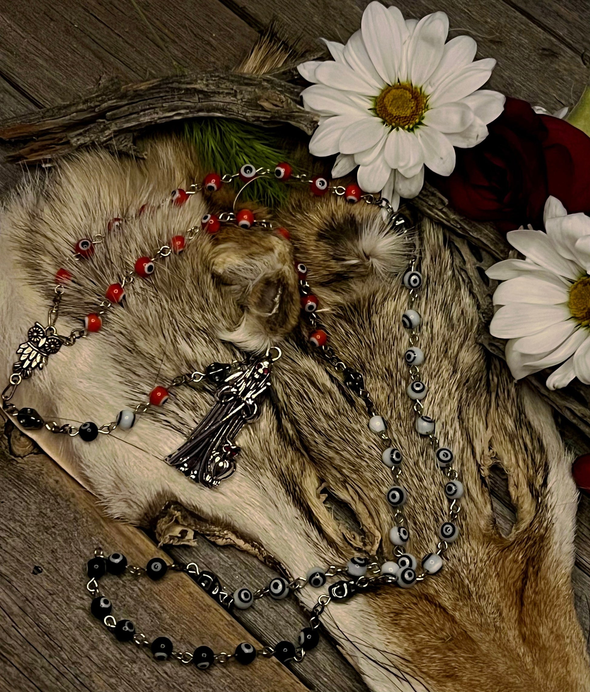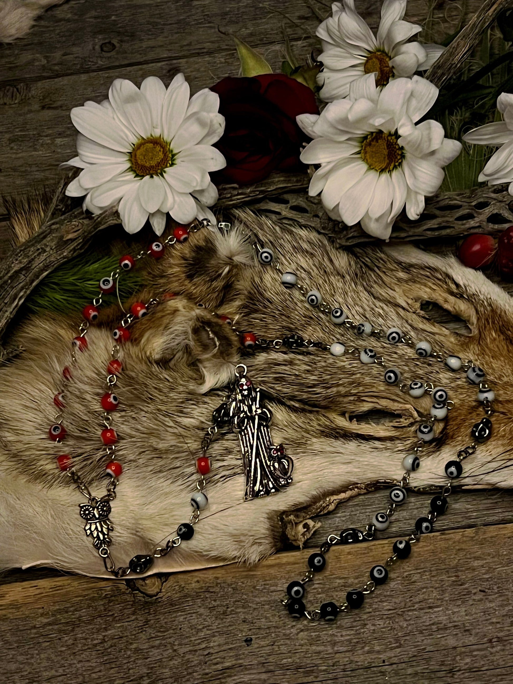Santa Muerte Evil Eye Rosary + Traditional Colors + Three Robes + Handcrafted + Sterling Silver Plated Chain + Rosario