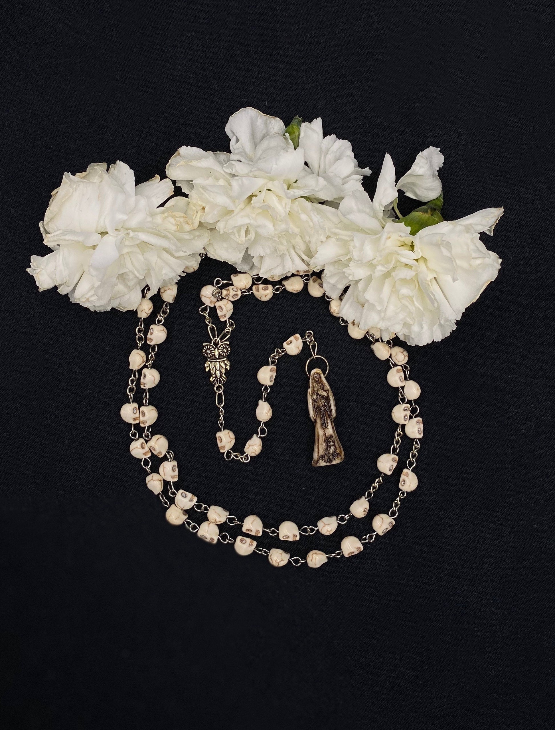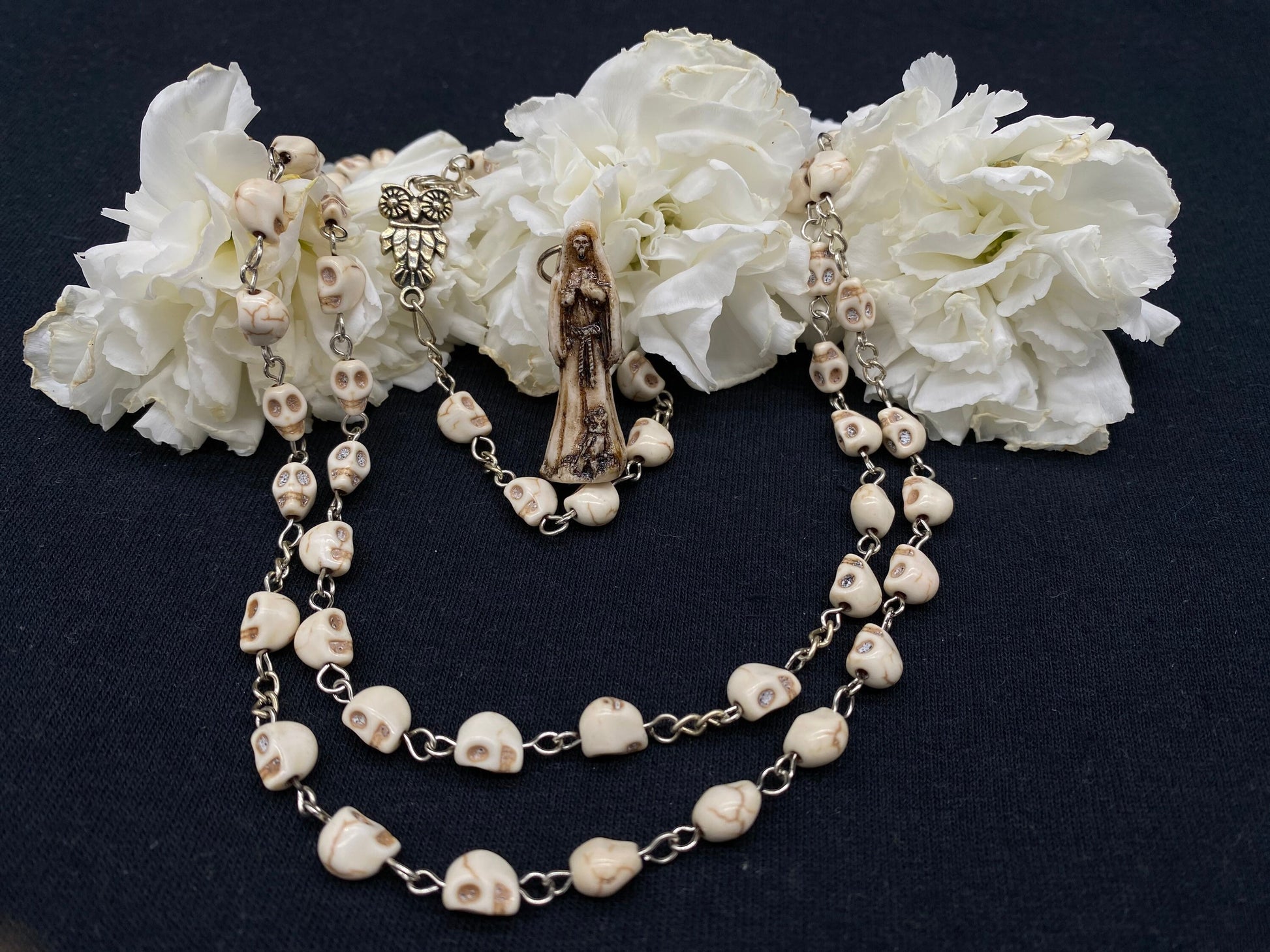 La Santa Muerte is a Mexican folk Catholic saint of death who is known by many names such as Santisima Muerte, La Flaca, La Niña, and La Madrina. La Santa Muerte is the embodiment of death with the highest power over life of any spirit or saint—second only to God. Many venerate her as she accepts people from all walks of life and does not discriminate against LGBTQ+, sex workers, criminals, and gang members. She is often depicted as a grim reaper-like skeleton holding a scythe, scales, or a globe. La Santa Muerte has three traditional robes or personalities: white (La Blanca), red (La Roja), and black (La Negra). Each robe represents a different side of her. La Blanca is the most approachable robe and is the aspect of purity, healing, guidance, peace, balancing emotions, and cleansing. La Roja represents love, money, prosperity, passion, justice, legal issues, fidelity, and marriage. La Negra is the fiercest of the robes and is feared by other malevolent spirits. She is associated with protection, reversing, revenge, and cursing. When one is interested in an all purpose rosary, working with ancestors, success, and necromancy, the bone robe is an excellent choice to work with. This rosary was handmade by a Muertera using howlite skulls and a fixed La Santa Muerte Statue. We cleansed each of them with a ritual and charged them on La Santa Muerte's altar.