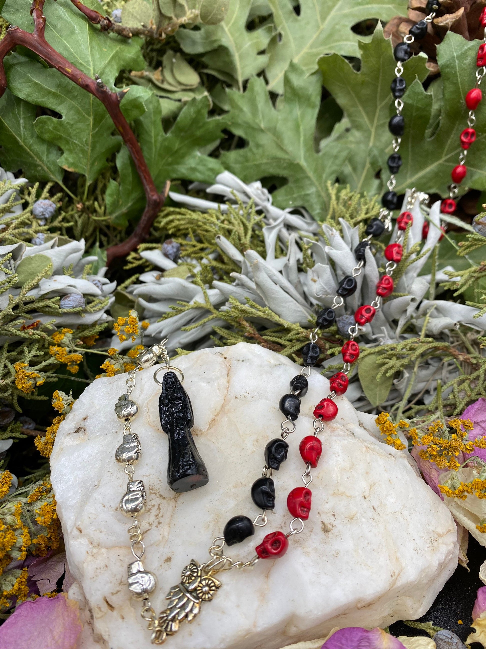 This rosary was handmade by a Muertera using howlite skulls and a fixed La Santa Muerte Statue. We cleansed each of them with a ritual and charged them on La Santa Muerte's altar.