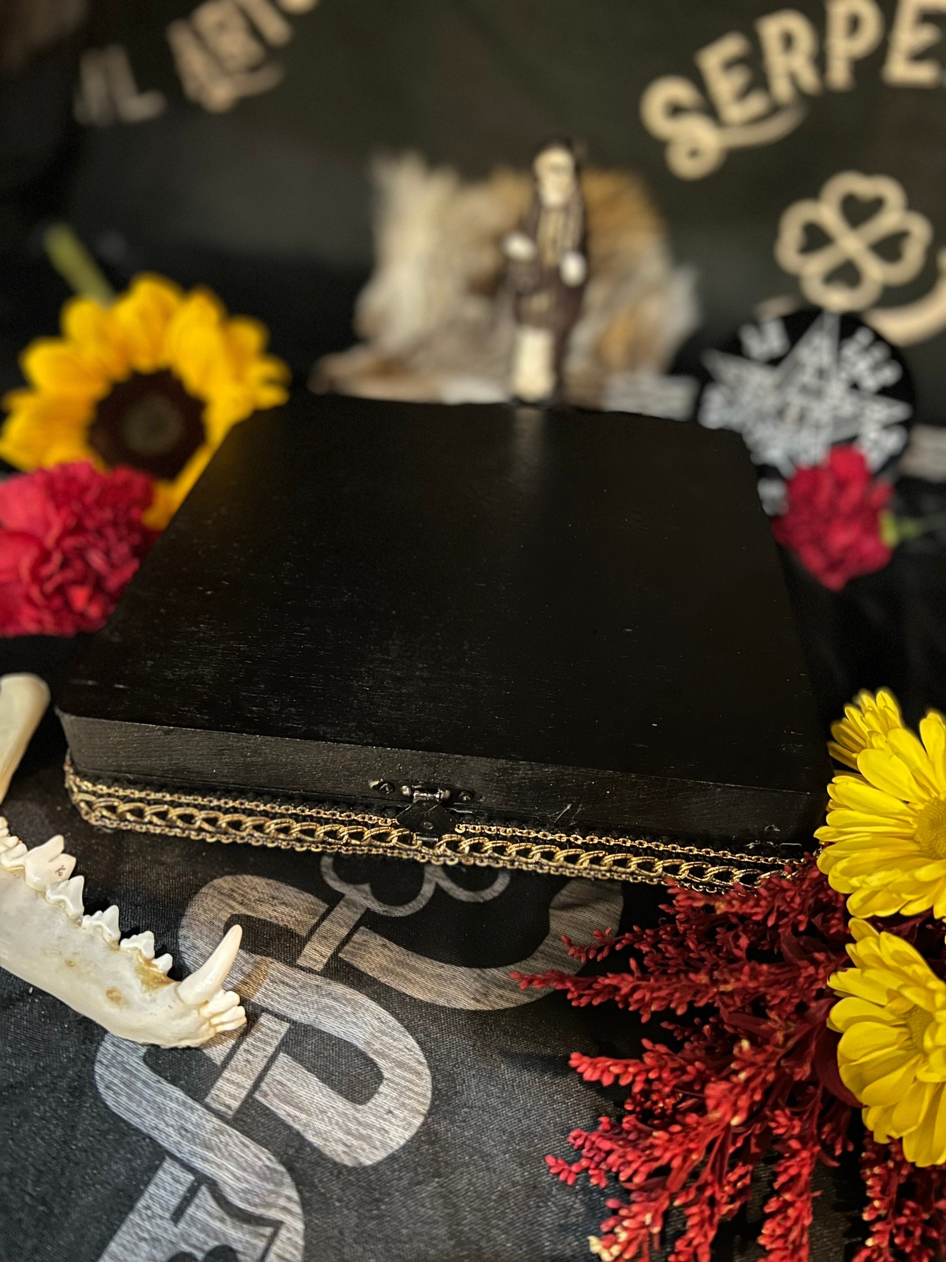 We make this Santa Muerte protection amulet with rare, expensive, unique items that may bring her vibration for protection. We put days of work and prayers into it. It includes everything from bones, herbs, resins, glass objects, milagros, to crystals unique to Santa Muerte. Santa Muerte gives us the ingredients to use for you particular amulet. It takes nine days to create and pray over.
