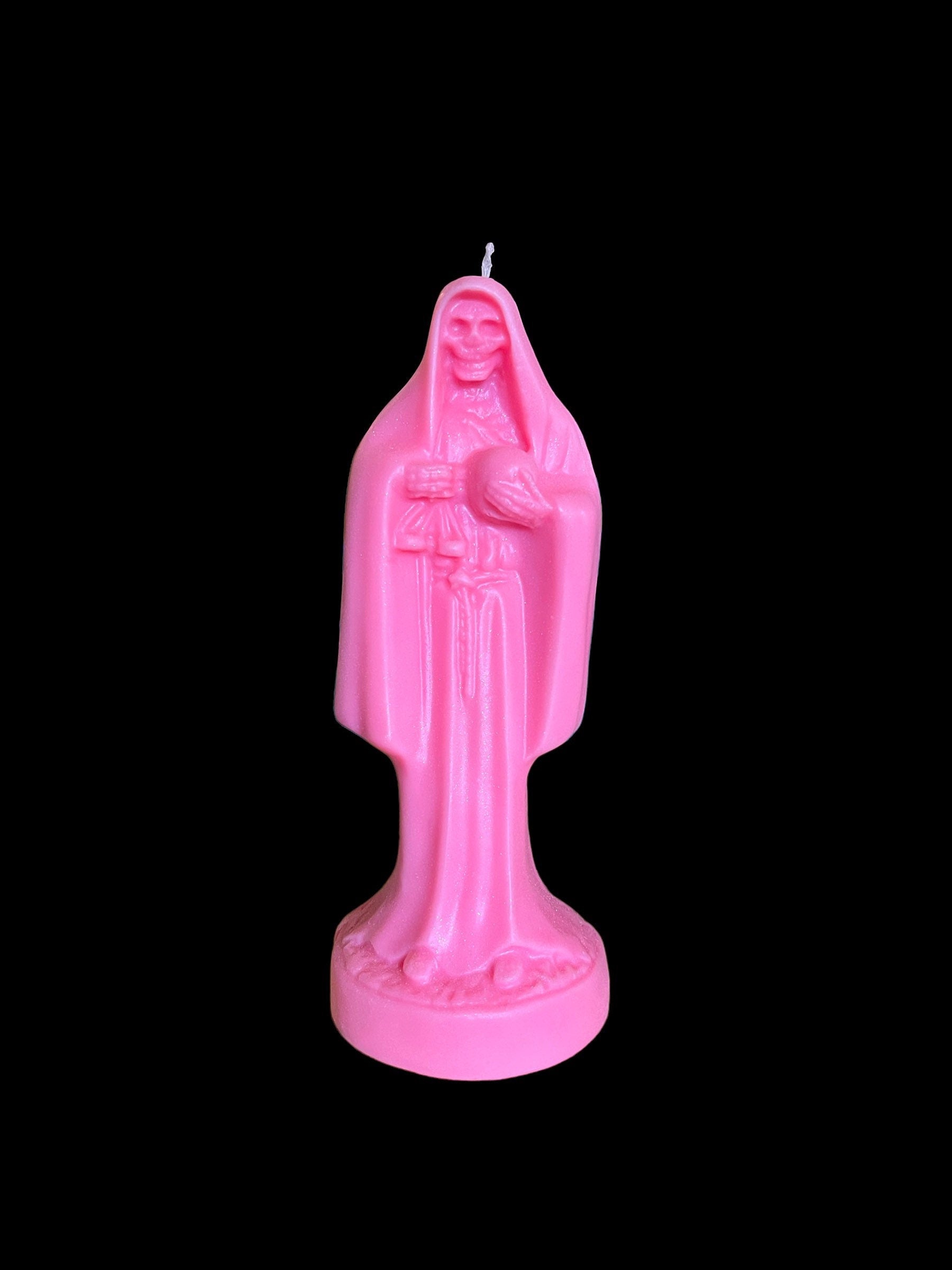 We’re offering a La Santa Muerte Rosada Candle with an organic hemp wick that measures approximately 10” x 4”. It is made of soy and paraffin wax.