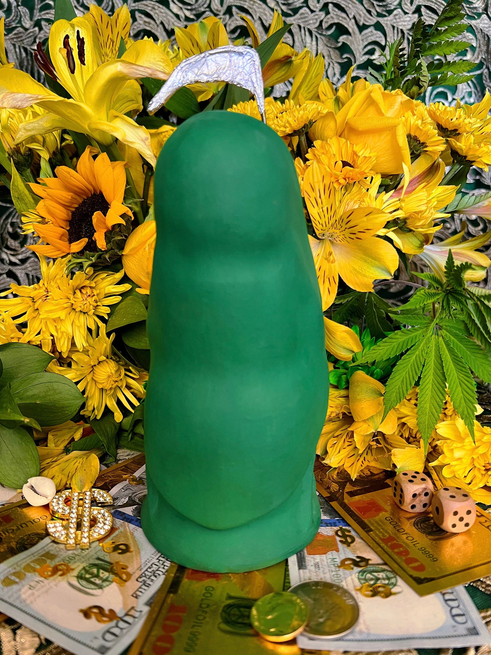 Our Santa Muerte Verde Statue is handcrafted in Mexico by an artist from Oaxaca who uses clay harvested from the earth. It is then fired in an outdoor pit in the traditional way. Later, it is hand painted.