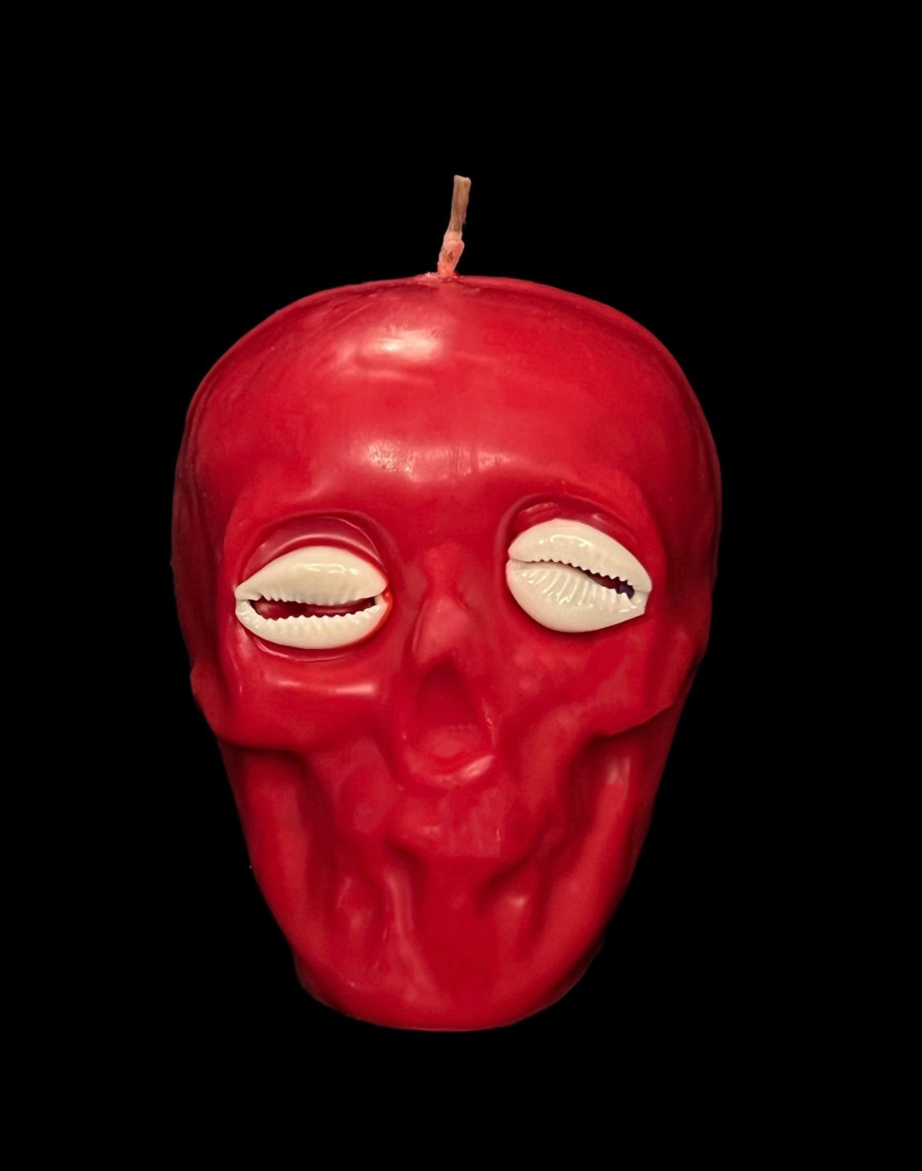 We’re offering a Skull Candle with Cowrie Eyes, an organic hemp wick, and that measures approximately 4” long, 3” wide, and 4” high. It is dipped in white wax and made of soy and paraffin wax.