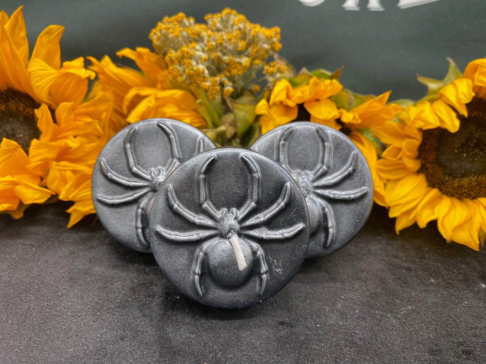 We’re offering two Spider Candles with organic hemp wicks. The candles measure approximately 2” wide and 0.75” deep. They are made of soy and paraffin wax. \