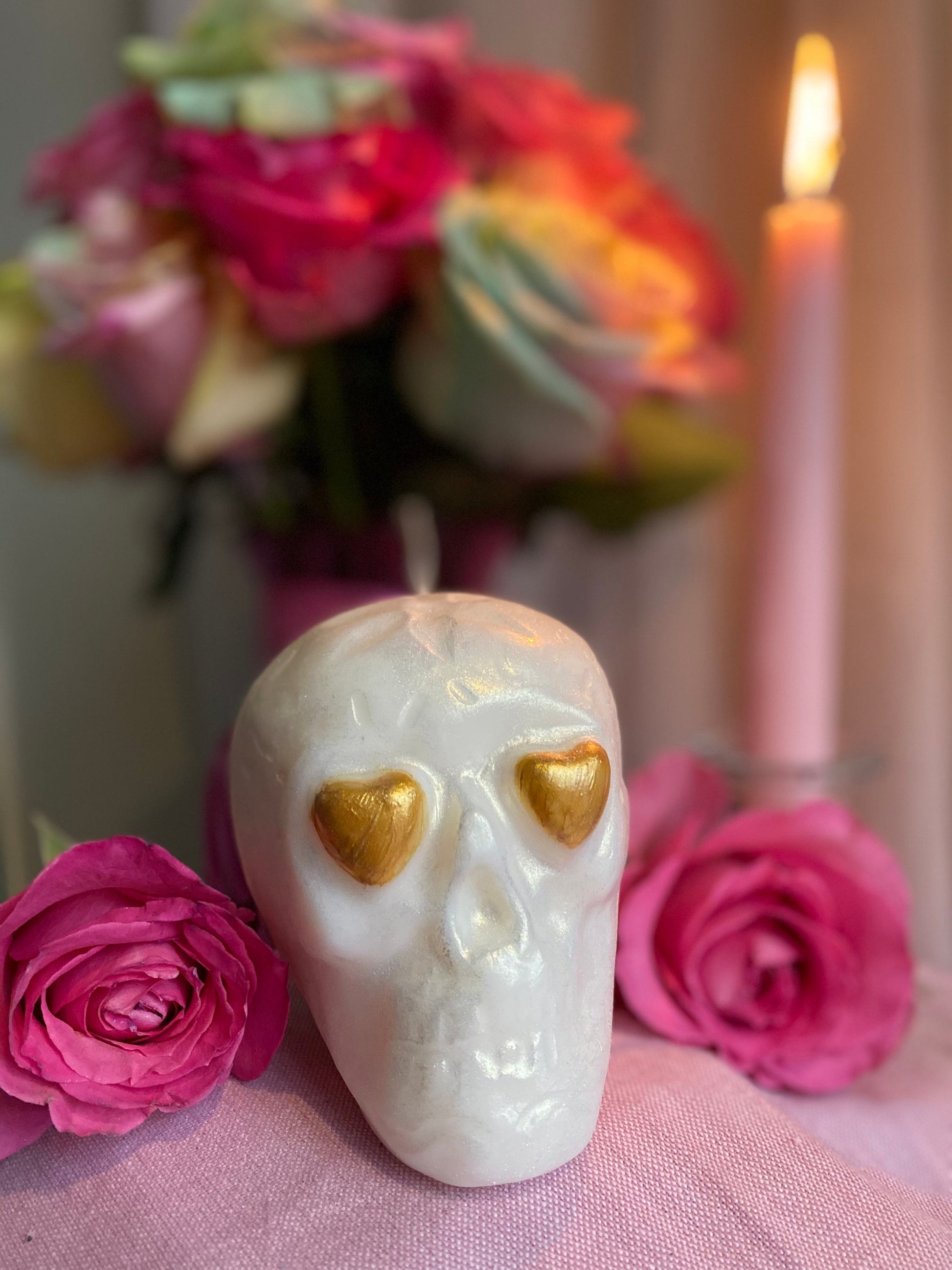 We’re offering a Sugar Skull Candle with an organic hemp wick. The candle measures approximately 4” long, 3” wide, and 4” high. It is made of soy and paraffin wax.
