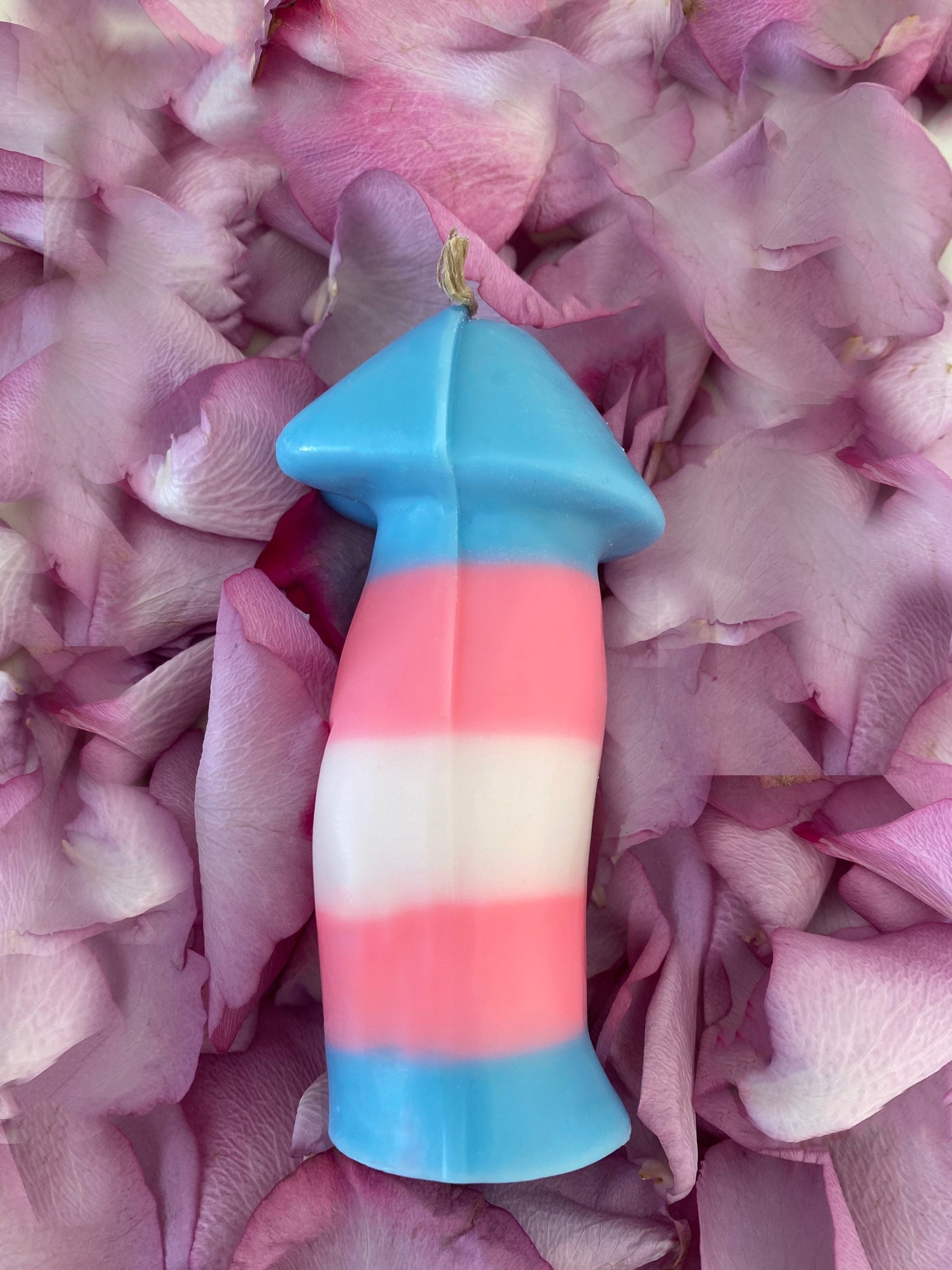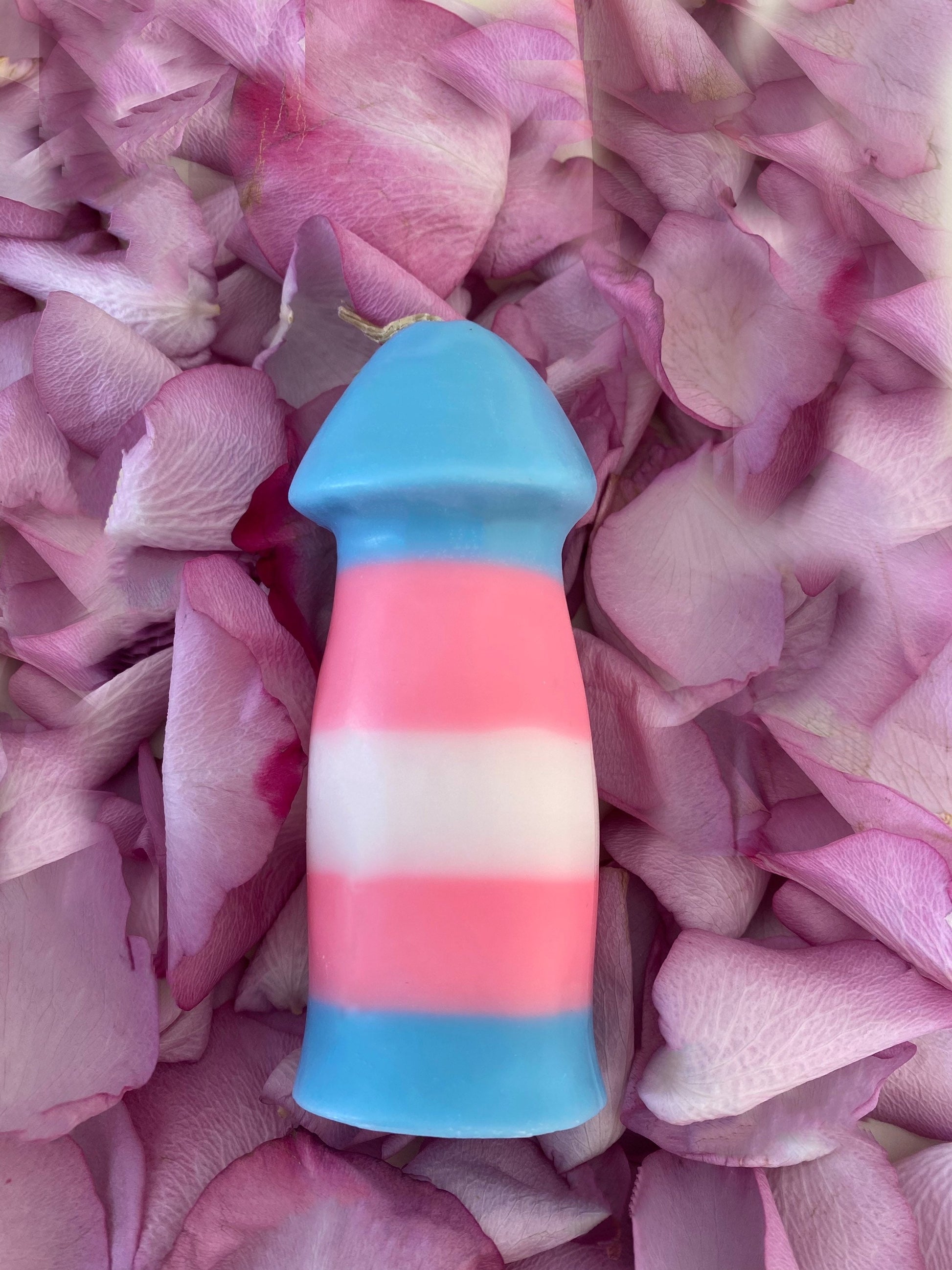 We’re offering a blue, white, and pink Trans Pride Feminine Penis Candle with an organic hemp wick that measures approximately 4.5” x 2”. It is made of soy and paraffin wax. This candle pairs well with our Trans Emotional Support Oil.