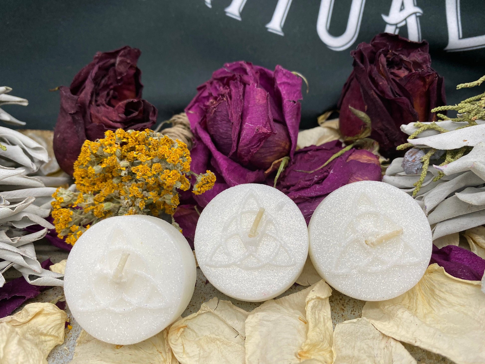 We’re offering four Triquetra Candles with organic hemp wicks. The candles measure approximately 1.5” wide and 1” deep. They are made of paraffin wax.