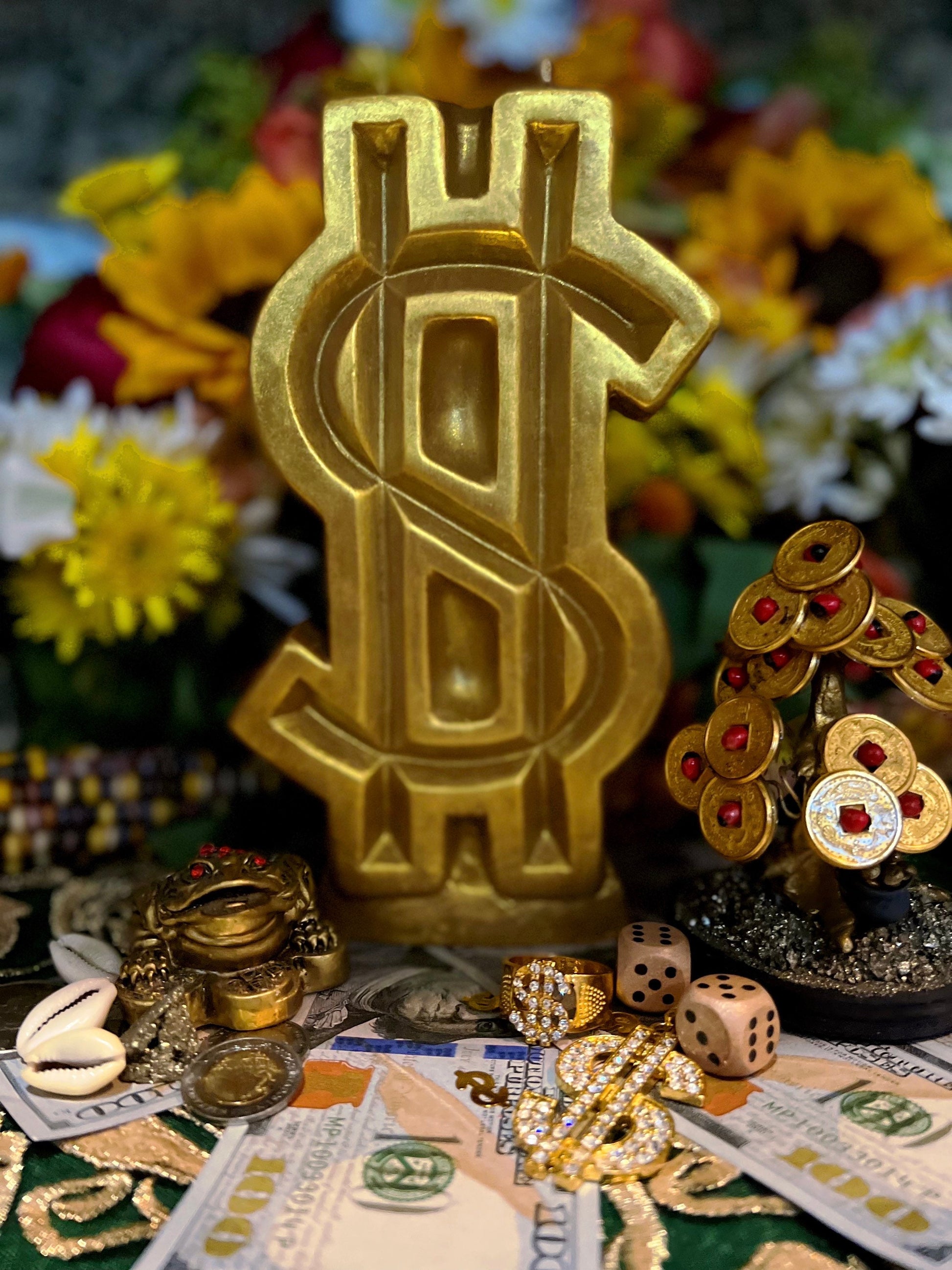 We’re offering a Dollar Sign Candle with an organic hemp wick. The candle measures approximately 8” high, 4” wide , and 1” deep. It is made of soy and paraffin wax. This candle works great for money magick. It also pairs well with our money drawing oil and herbs, which are not included.