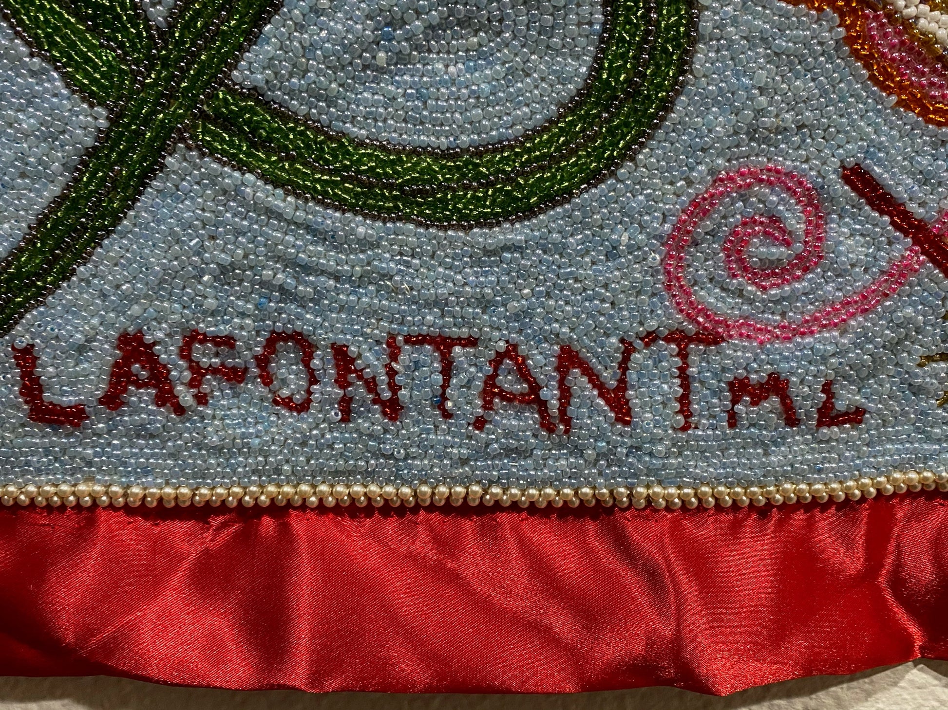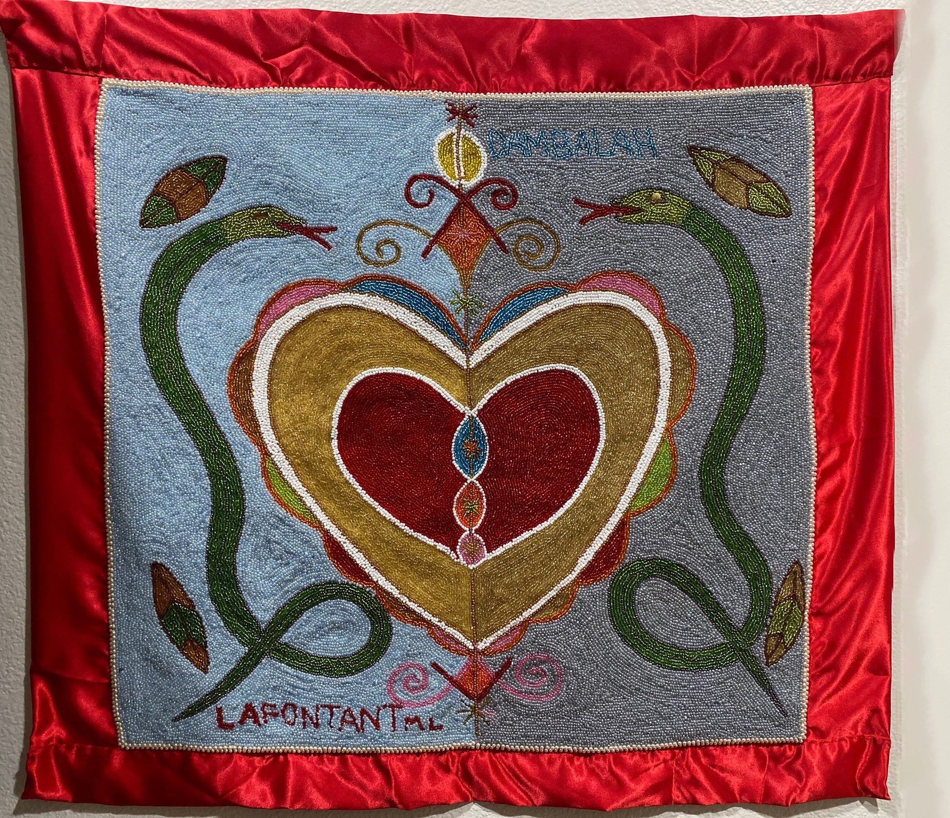 This drapo is for Dambala and Ezili Freda. It measures 27“ x 24” and is handcrafted with glass beads. This drapo was beautifully handcrafted by a Haitian artist in Haiti. A portion of the proceeds from the purchase of this drapo goes to support a Haitian orphanage.