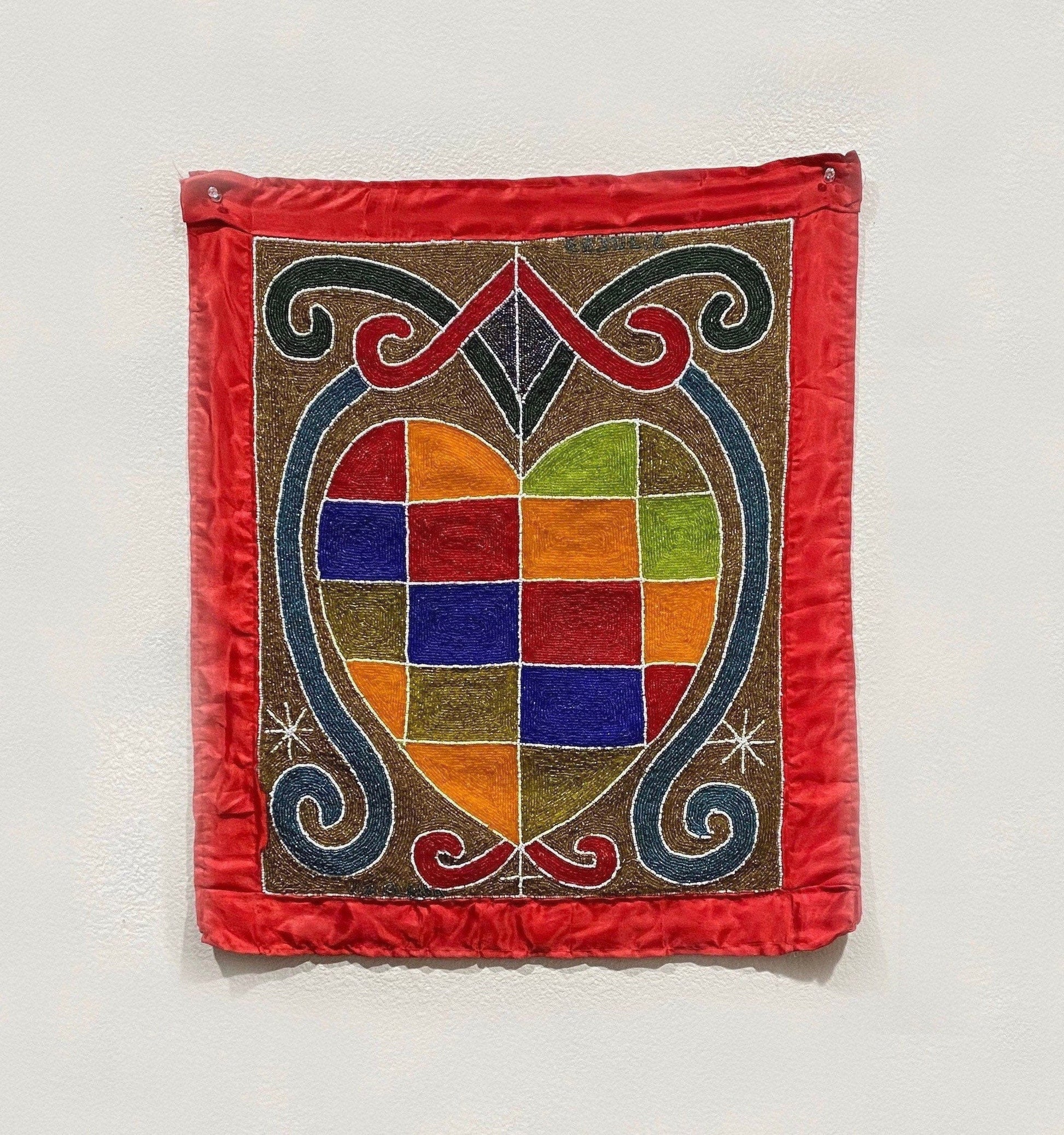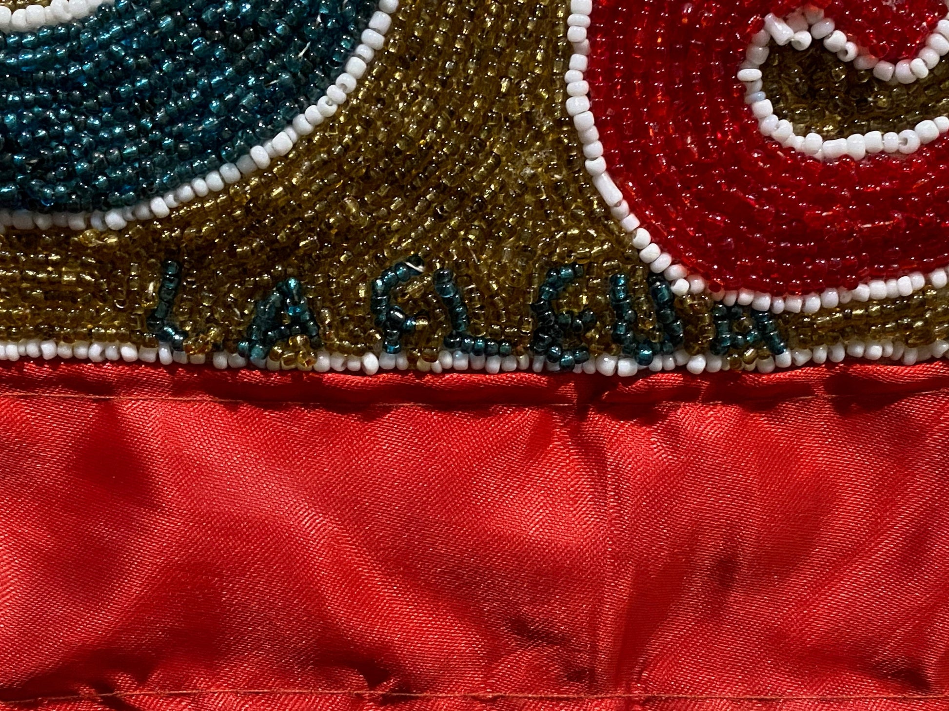 This drapo is for Ezili Freda. It measures 24“ x 20” and is handcrafted with glass beads. This drapo was beautifully handcrafted by a Haitian artist in Haiti. A portion of the proceeds from the purchase of this drapo goes to support a Haitian orphanage.