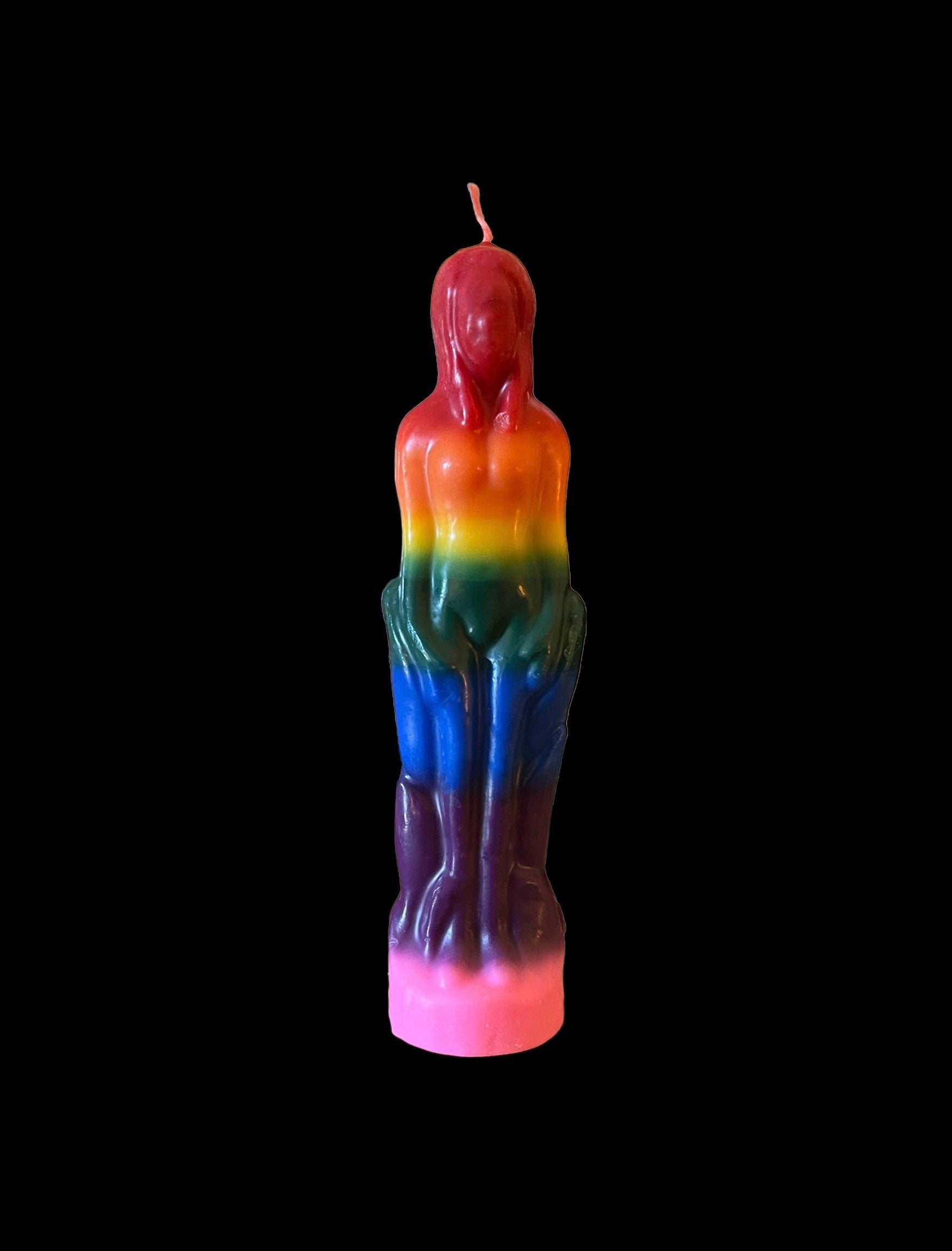We’re offering a Female LGBTQ+ Pride Rainbow Figural Candle with an organic hemp wick. The figure candle measures approximately 8” x 2”. It is made of soy and paraffin wax.