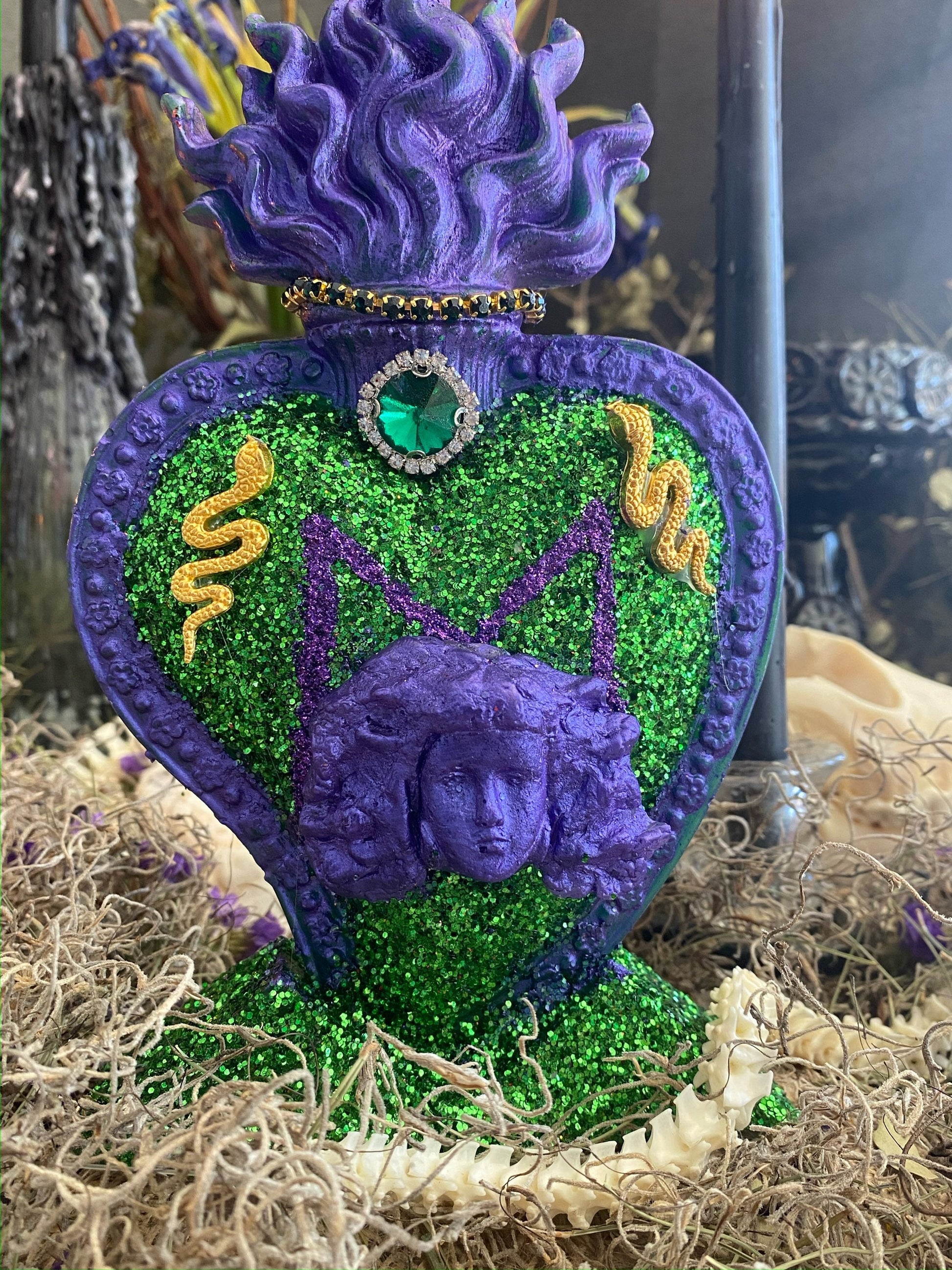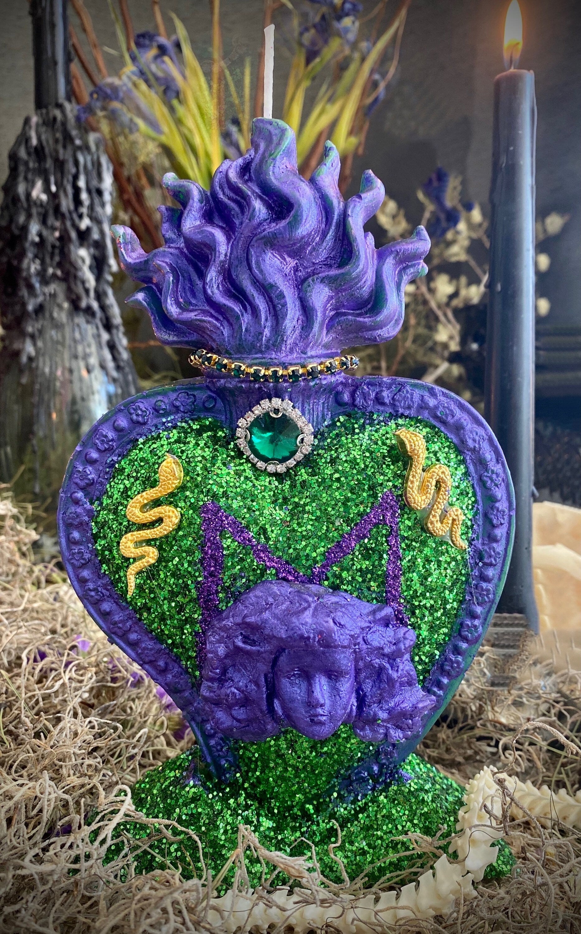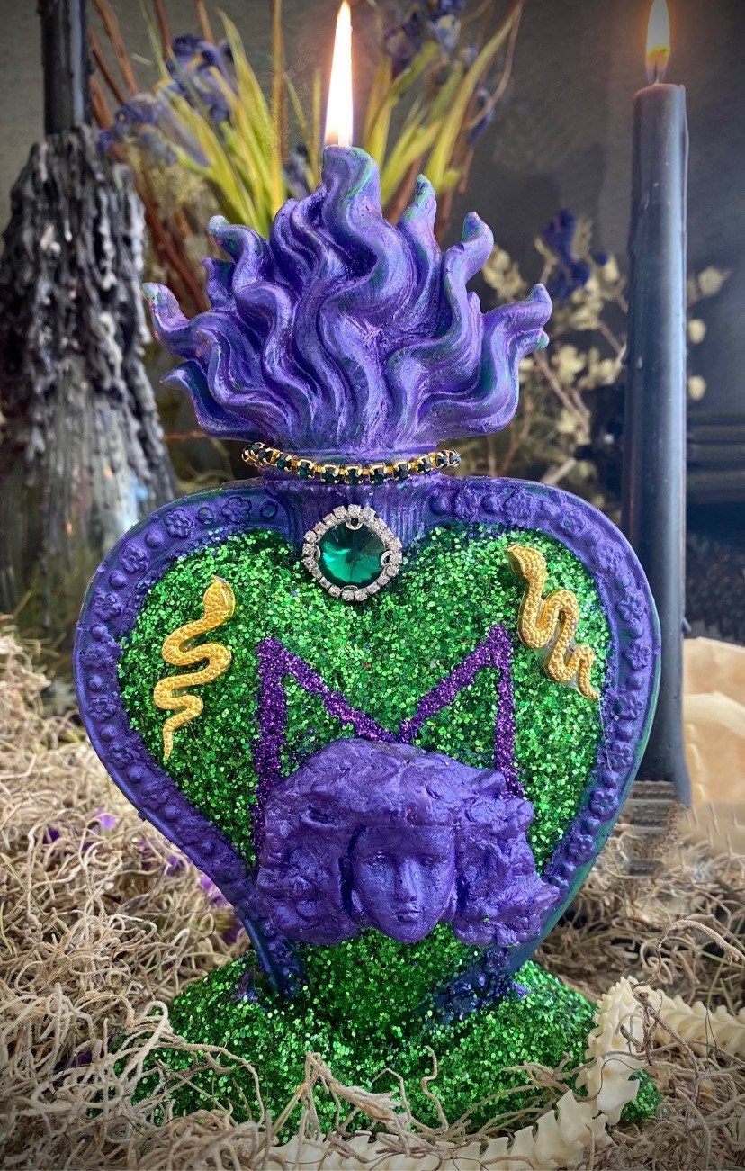 We’re offering a Filomena Lubana Flaming Heart Candle that measures approximately 9” x 5”. It is blessed and lovingly prepared. It comes fixed and is ready for a working. This candle could also be used as a statue or offering. There is an option to purchase a 1/3 oz Filomena Lubana Oil at a discount with this candle Filomena Lubana has many names, including Santa Marta La Dominadora, Metresa Lubana, Metresa Marta Pye, La Colora, and La Morena. Santa Marta La Dominadora lives in the cemetery and comes in the form of a snake. She cleanses spaces of negativity and circles around men to cleanse their auras, making them more attractive to women. Many petition her to dominate men, situations, and enemies. She can also help bring out the truth. In Sanse (Puerto Rican Vodou), each spirit syncs with a Catholic saint. Filomena Lubana syncs with Saint Martha, sister of Mary Magdalene and Lazarus. When we serve Filomena Lubana, we offer her coffee grounds with cinnamon, cloves, and star anise smothered in honey with an egg on top, dark flowers, orchids, black beans and rice, grape soda, black coffee, menthol cigarettes, cigars, anchovies, herring, and dry red wine. Her colors are green, purple, black, and red, though she likes all dark colors. She is served on the floor because she is a snake. Her images often depict her holding a small boy. Based on African folklore, she came across an orphan boy in the grips of a snake in a cemetery. She rescued the child by charming the snakes and raised him as her own.