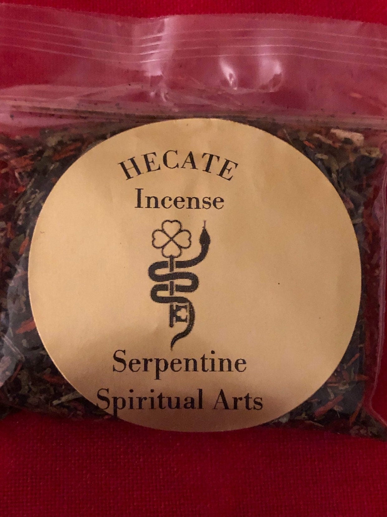 We made these products on Hecate’s feast day of August 13th. Our oil contains myrrh, patchouli, jasmine, saffron, red musk, wolf hair, three-way crossroads graveyard dirt, black snake skin, and several more ingredients. Our incense contains storax, dragon’s blood, willow, mastic gum, honeysuckle, sandalwood, and many more ingredients. Our candle dressing herbs include lavender, patchouli, honeysuckle, poppy, and several more herbs. These products are all natural with no fragrance oils or dyes, and they contain mostly organic ingredients.