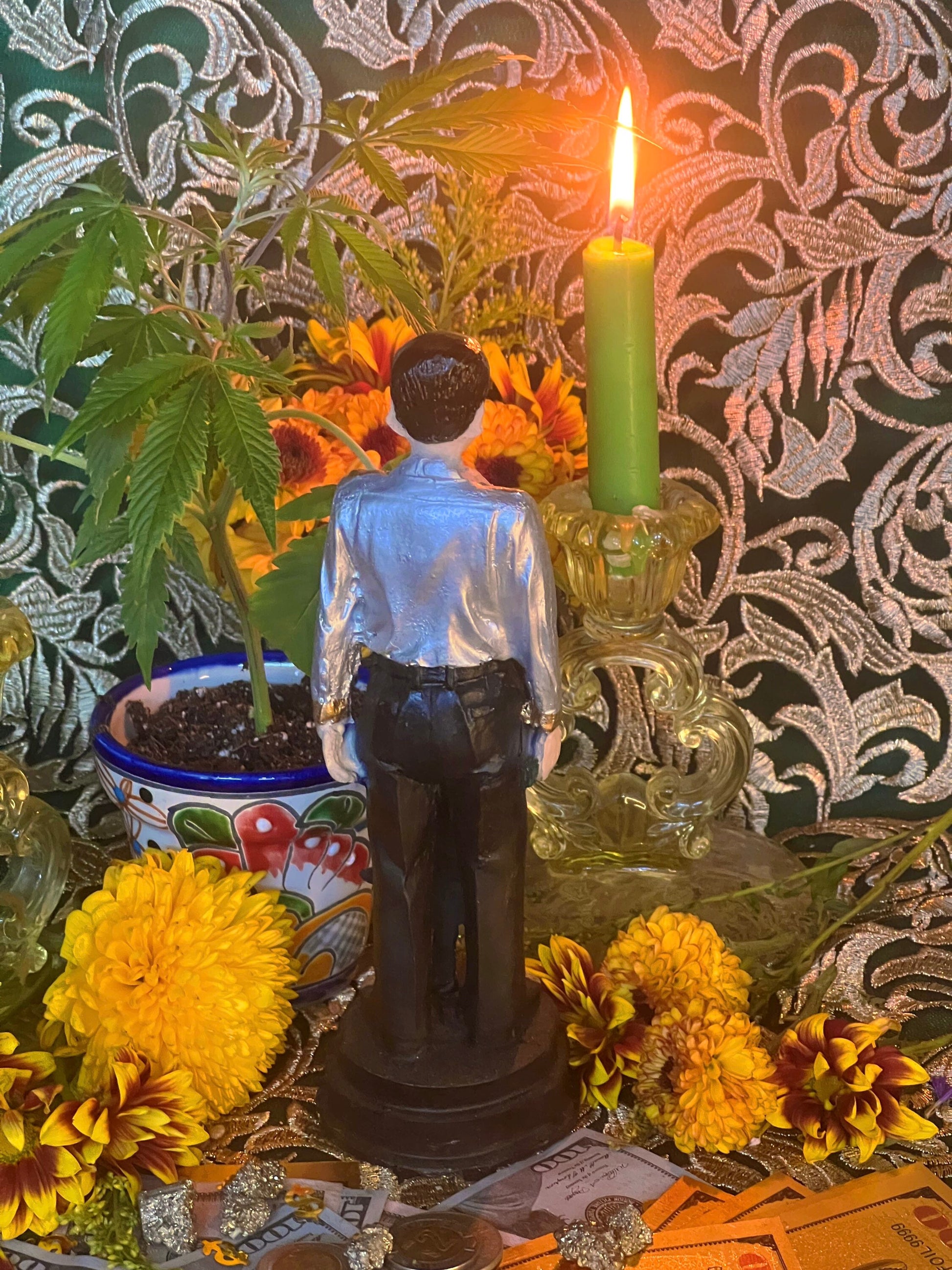 Many call on Jesus Malverde for guidance, money, legal issues, employment, luck, business, miraculous healing, love, family, education, and protection. When requests are granted, it is best to thank him through public recognition. His offerings include multicolored flowers, apples, cigars, tequila, marijuana, conchas (Mexican sweet bread), corn cobs, and money. His colors are green, white, and gold.