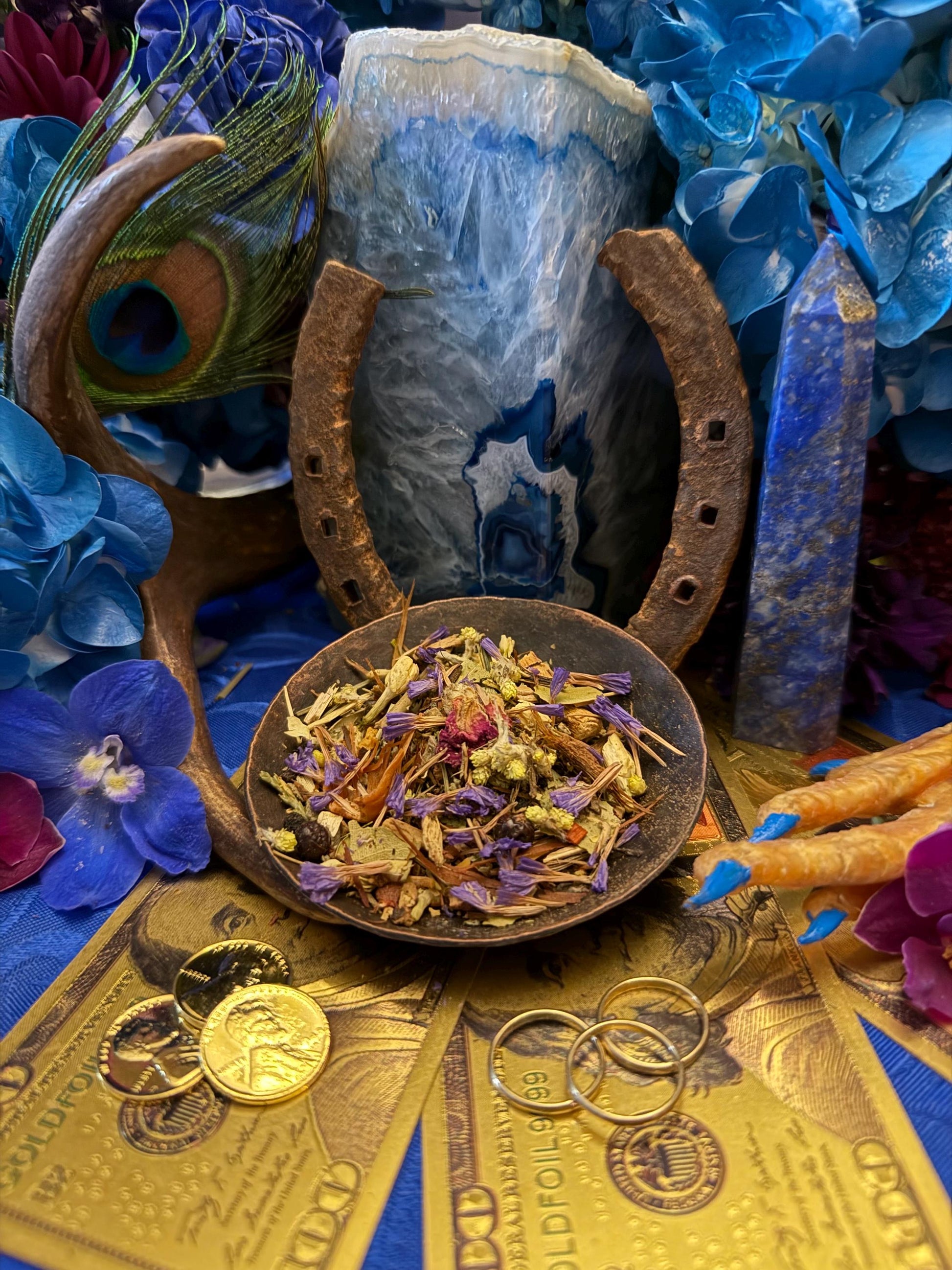 Some ingredients in our Jupiter Herbs include saffron, patchouli, hyssop, pinyon, nutmeg, anise, oak, bay, and peony. There are over 50 ingredients in these herbs. During ritual, we gently massaged them with a small amount of our Jupiter Oil. We spared no expense on the quality of ingredients, which are sourced from all over the world.