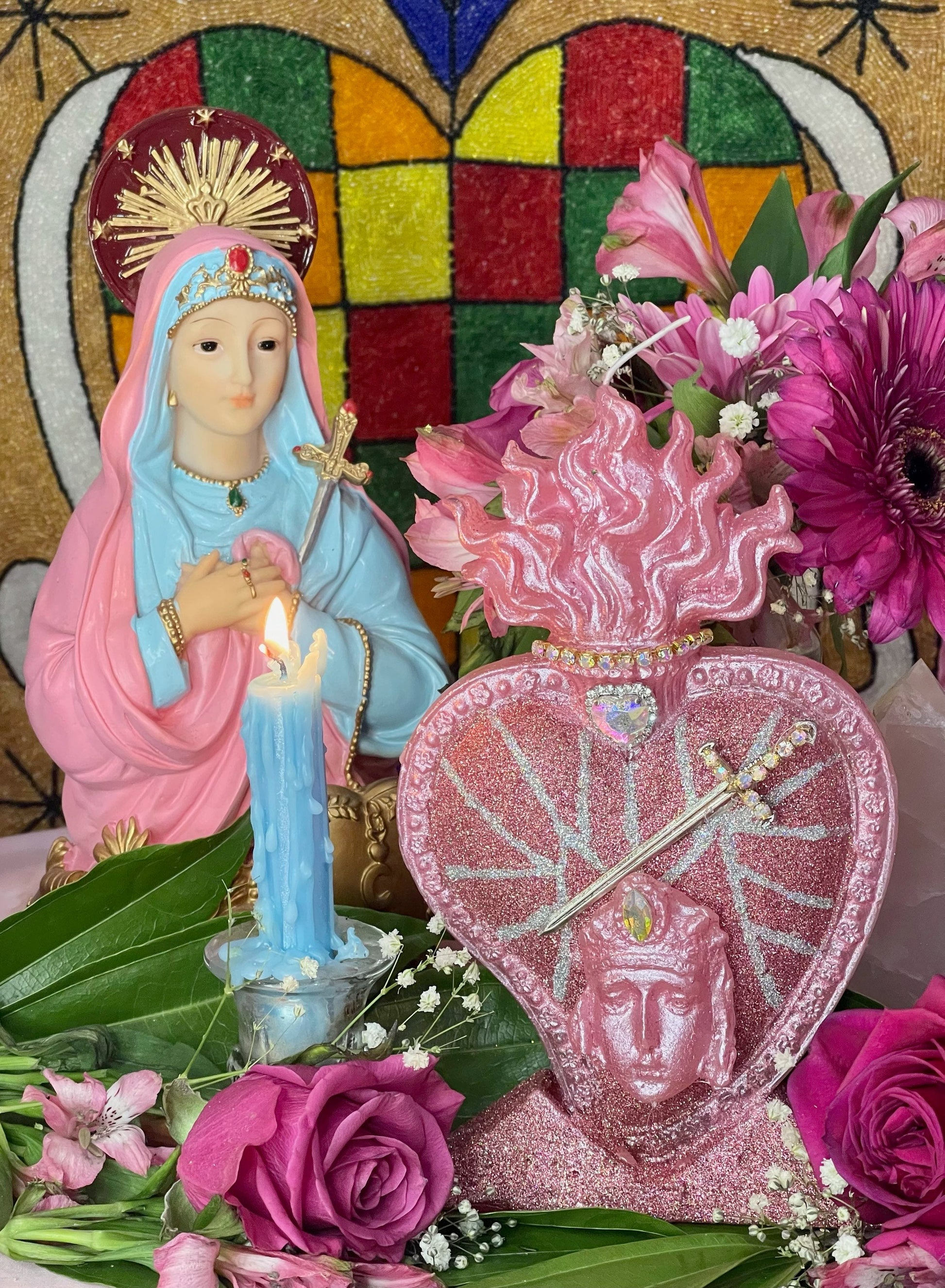 We’re offering a pink Metres Ezili Freda Flaming Heart Candle that measures approximately 9” x 5”. It is blessed and lovingly prepared. Metres Ezili is a spirit of romantic love, marriage, healing, purity, wealth, luck, self love, writers, unconditional love, and mental health. She is the most beautiful Metresa. In Haitian Vodou, her full name is Metres Mambo Ezili Freda Daome. She is syncretized with Mater Dolorosa. She is also called Metresili in Sanse (Puerto Rican Vodou) and 21 Divisions. Some consider her the patroness lwa of gay men. Metres Ezili is a spirit to approach for assistance with luxury, beauty, love, abundance, prosperity, clairvoyance, and writing. It is best to serve her on Thursday (her sacred day) and on her feast day of September 15th. She enjoys luxurious offerings of pink roses, perfumes, chocolates, jewelry, soaps, mirrors, and hand towels. She is partial to Chanel No. 5, gold rings, Lotion Pompeia, and the colors light pink, white, and light blue. She also accepts offerings of orange juice, milk, pink champagne, grenadine, basil, and fruit. This candle could also be used as a statue or offering. We embellished it with 24K Gold. There is an option to purchase a 1/3 oz Metresili Oil at a discount with this candle. Her oil is not included. While supplies last, we include an Ezili Freda necklace as a gift.